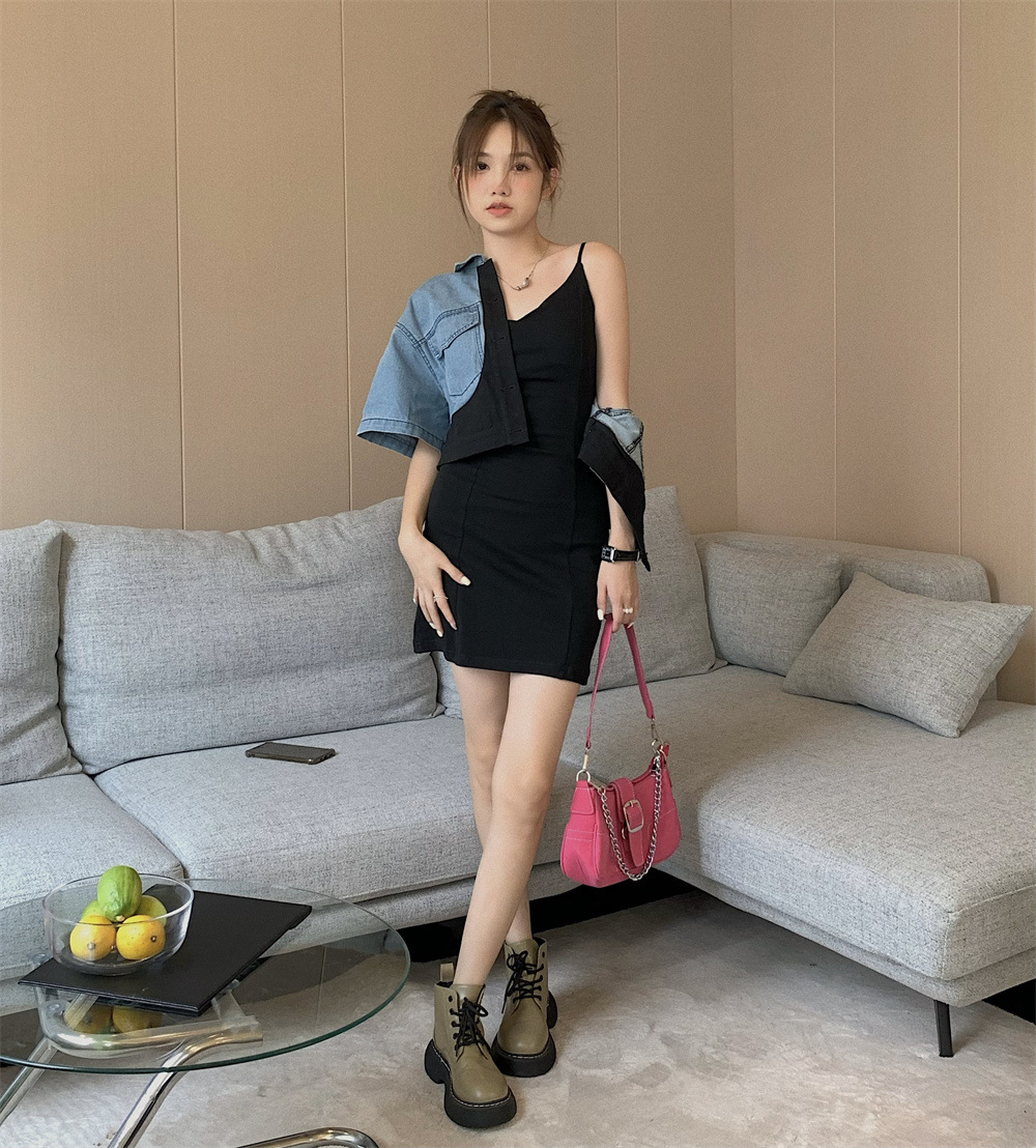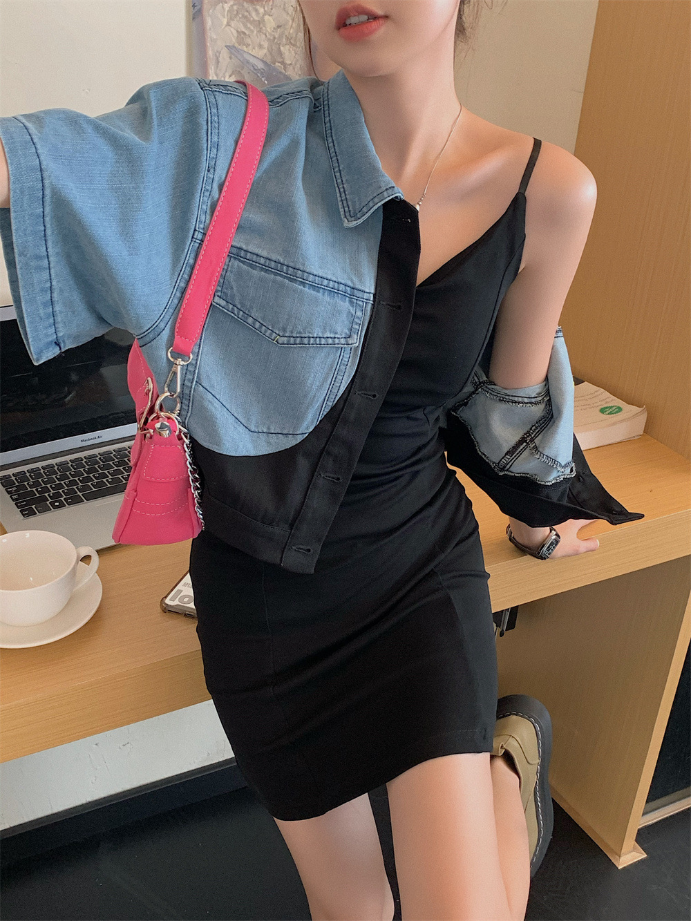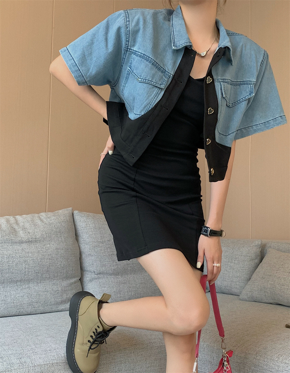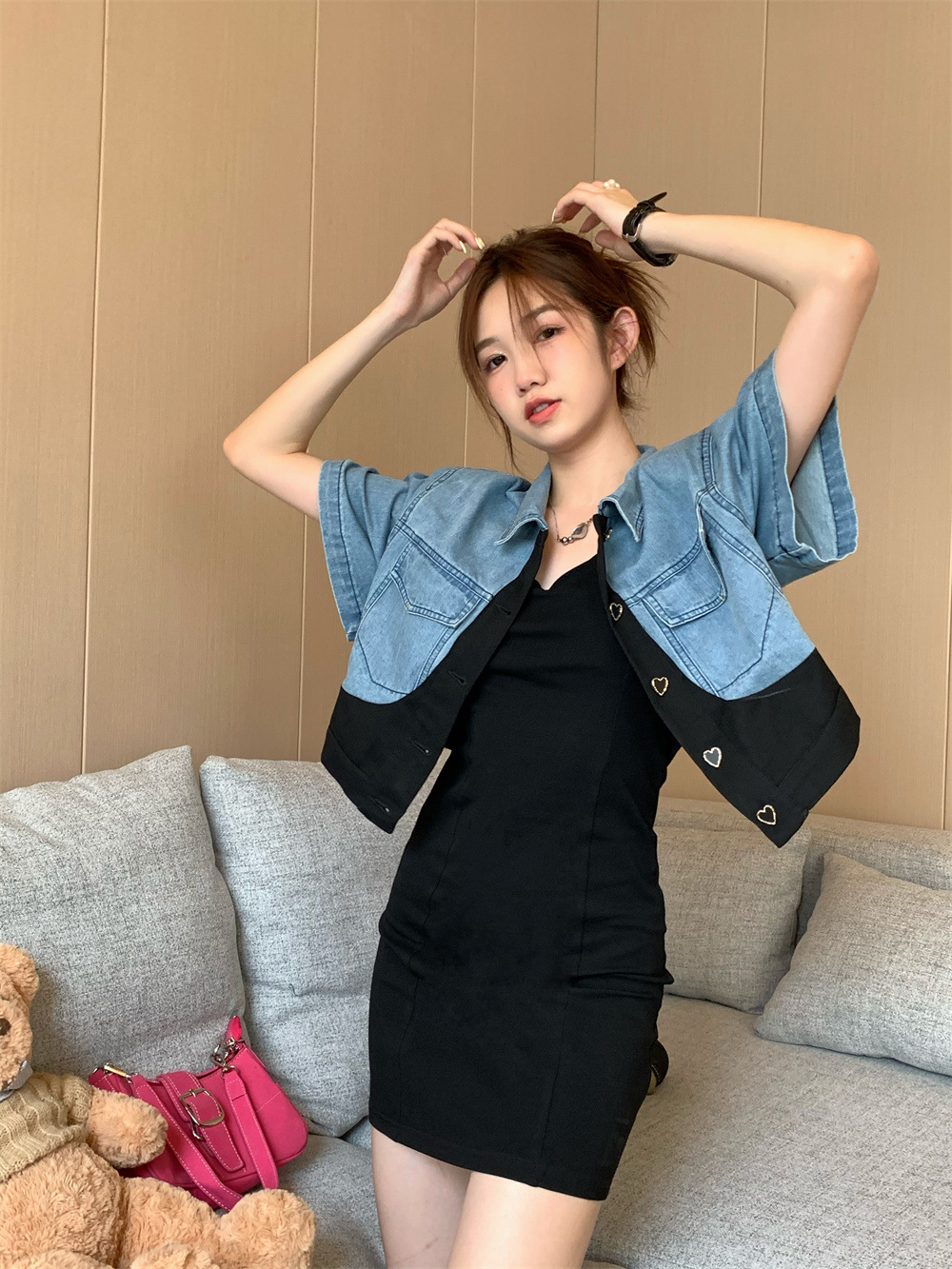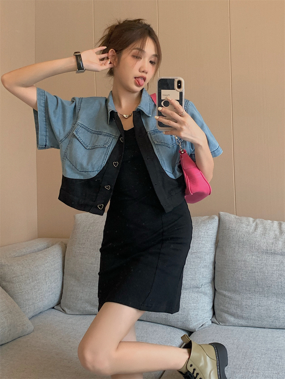 (清仓现货)【社群供V】设计感爱心撞色牛仔外套+修身吊带裙棉