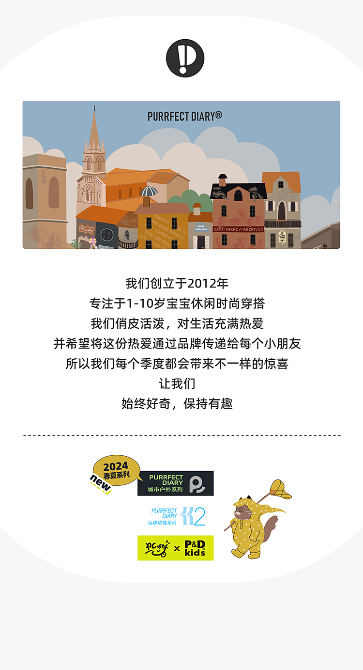 - Purrfect-Diary专注于贴近自然随性的穿着概念,轻奢平价的童装文化传播,在产品设计上更加注重婴童穿着的舒适性、安全性、更出众的国际化品牌,将欧美的育婴文化在中国进行深入的传播与推广。
