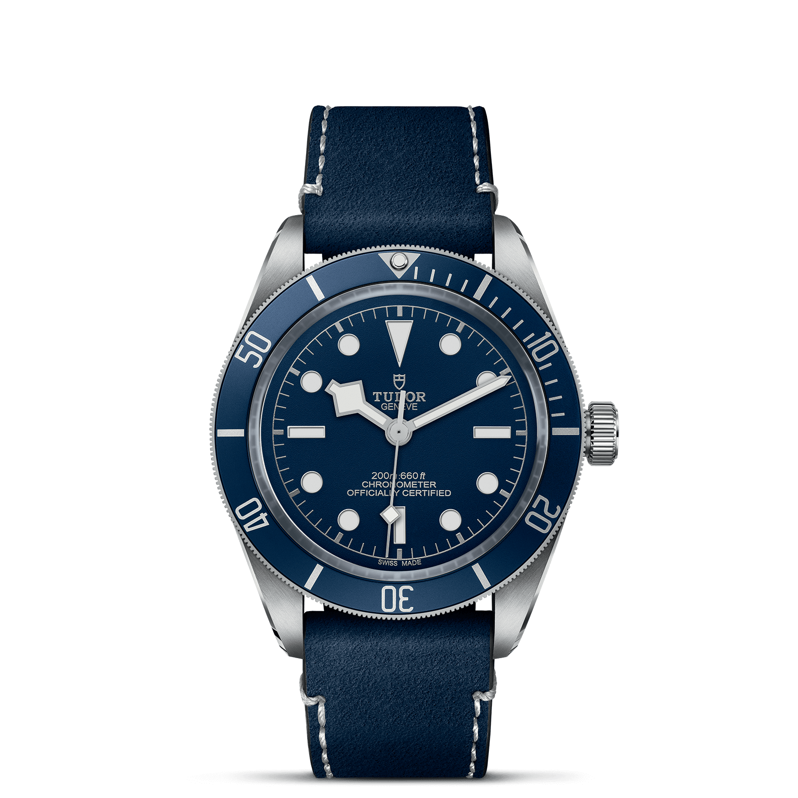 不锈钢单向旋转外圈,哑光蓝色阳极氧化铝60分钟刻度字圈,镀银数字及钟点标记