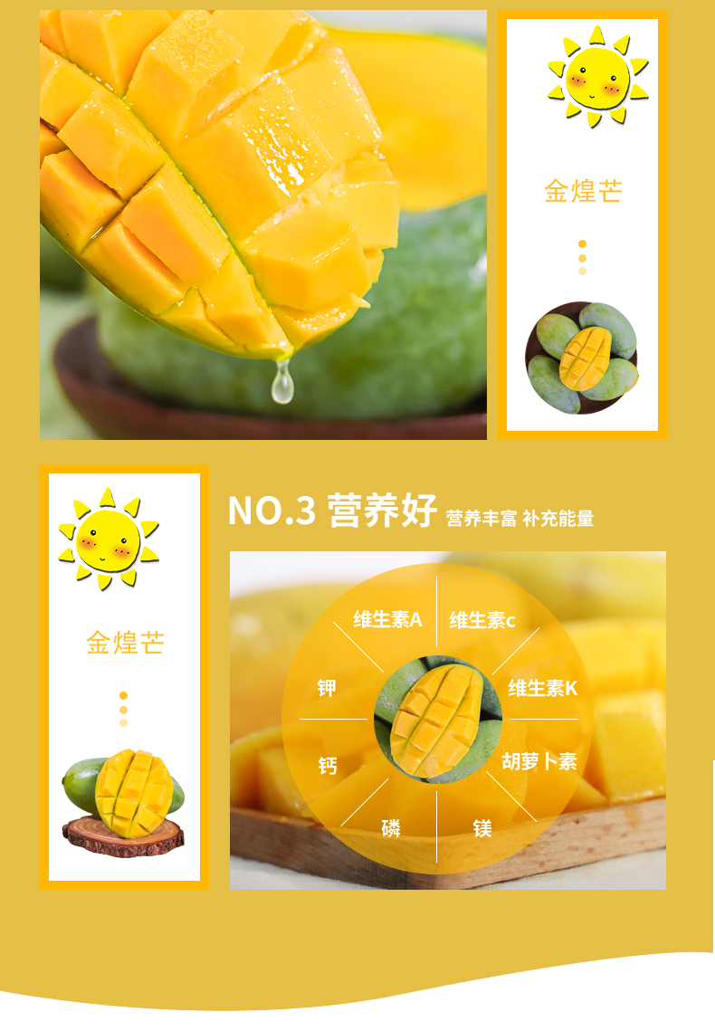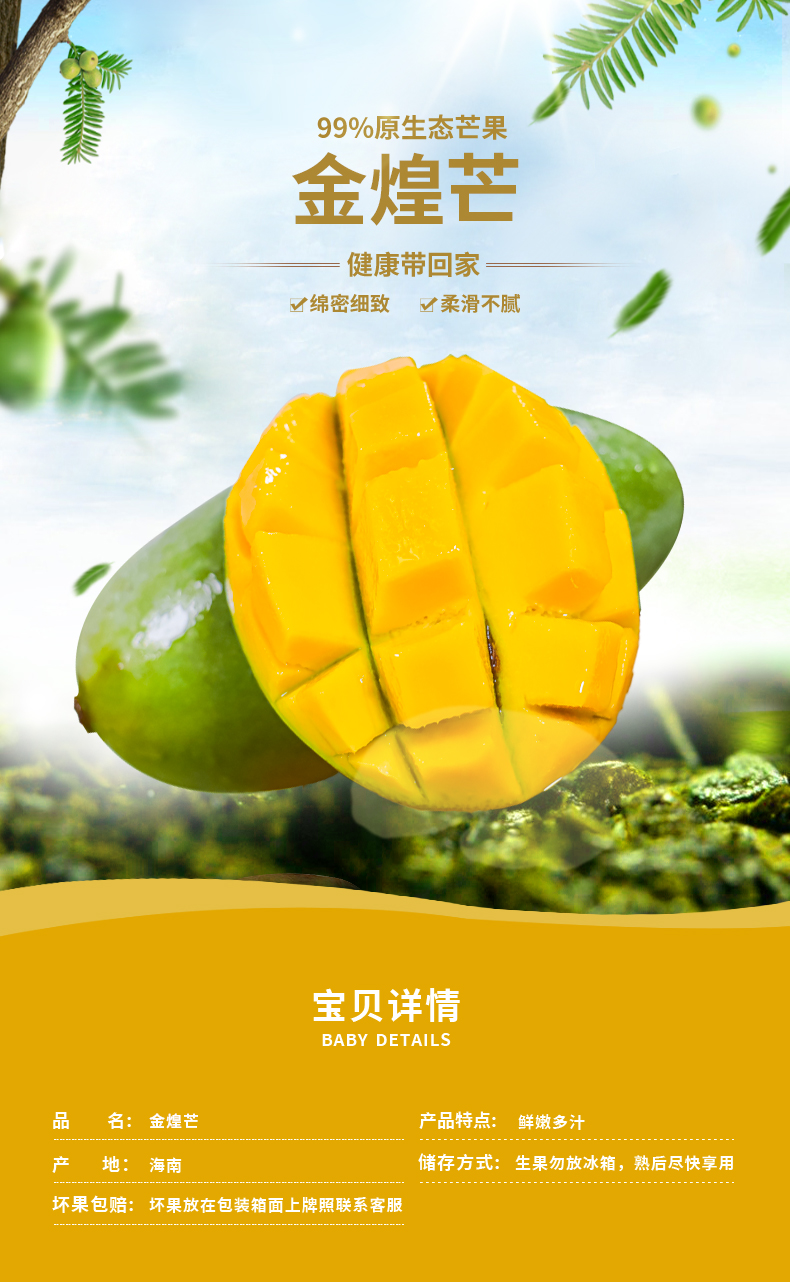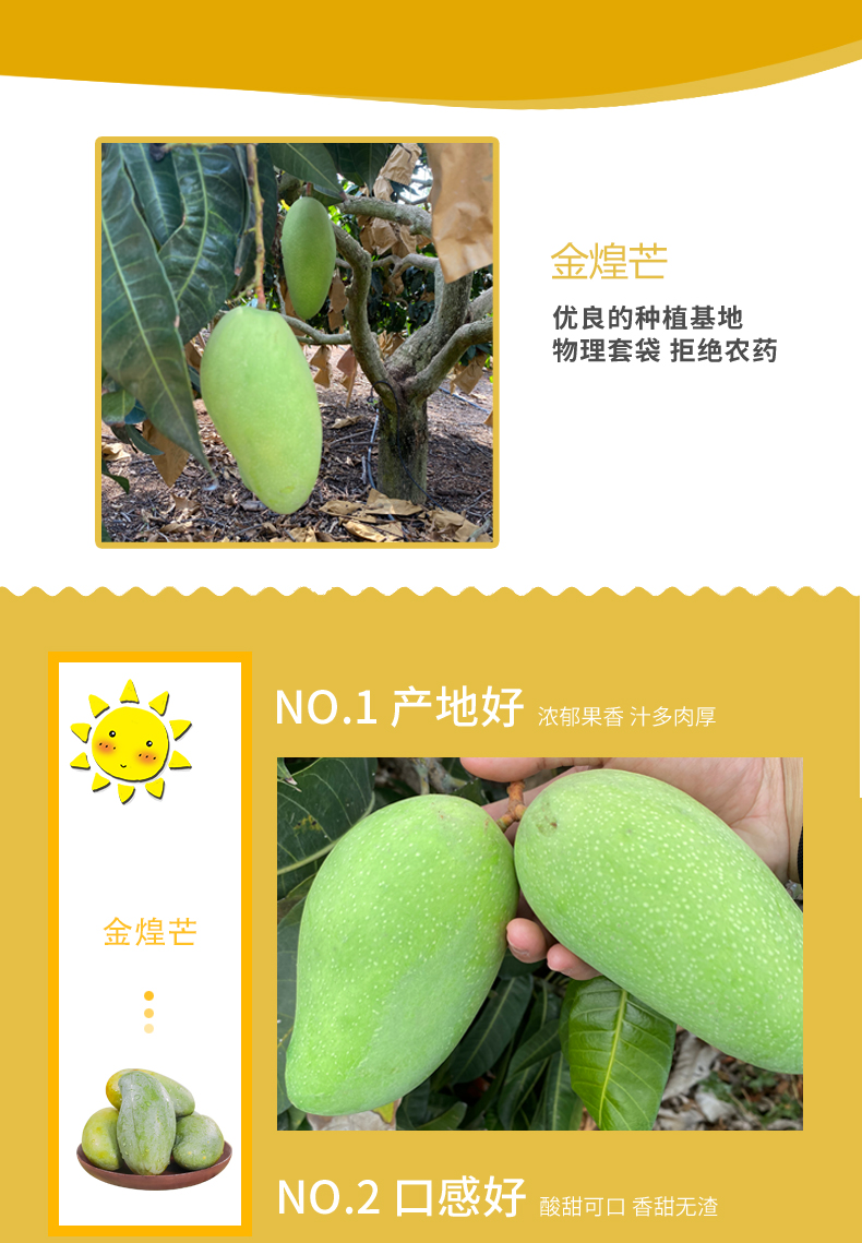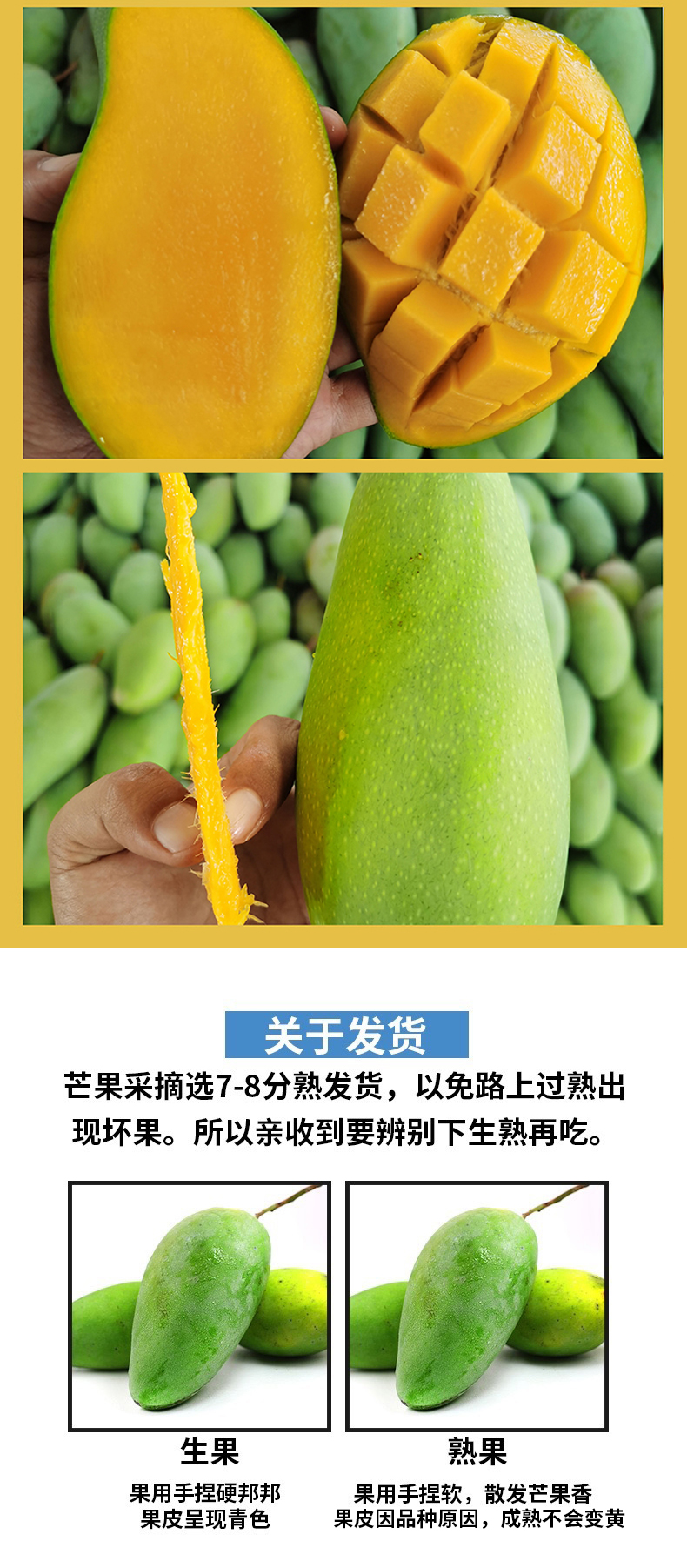 温馨提示:金煌芒是八成熟发货,收到货后请催熟后食用,有些果子催熟后也不会很黄,轻轻捏一下,微软就可以食用了,介意请慎拍