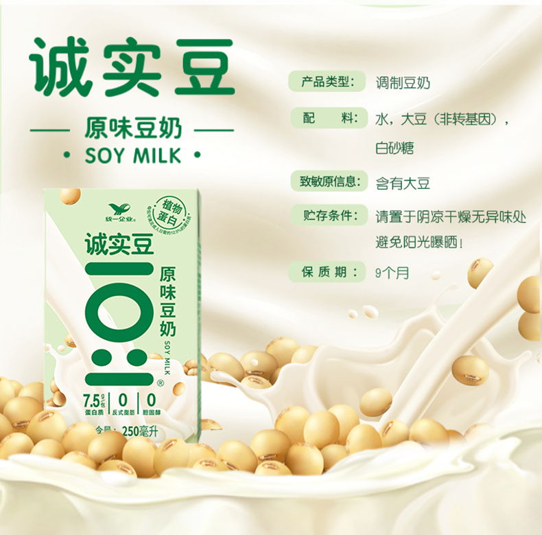 【统一】豆奶 统一诚实豆原味豆奶 250ml/盒 24盒/箱 1箱(9个月)
