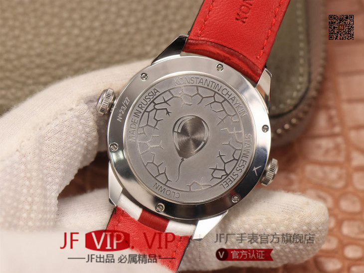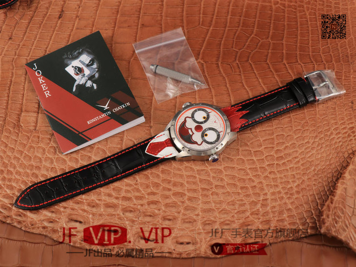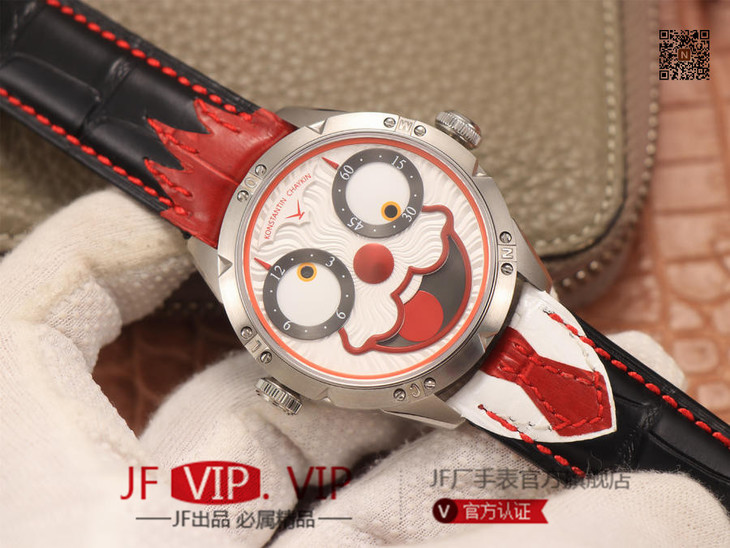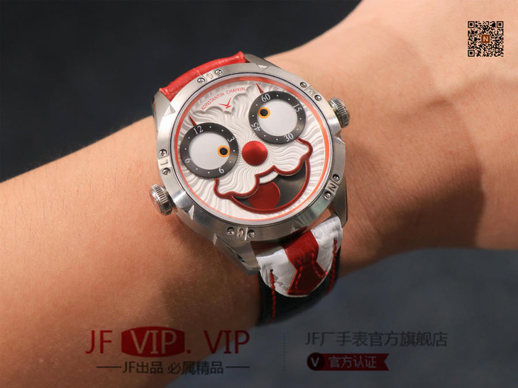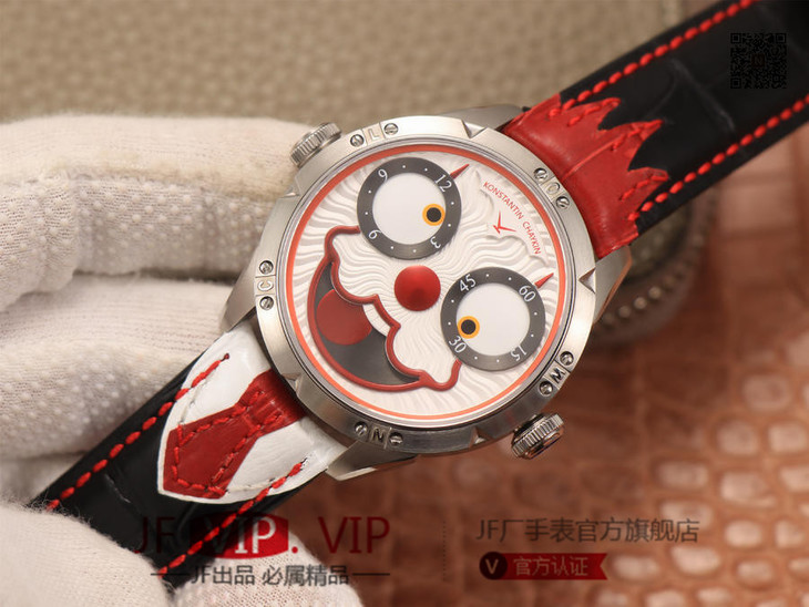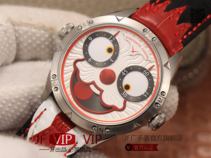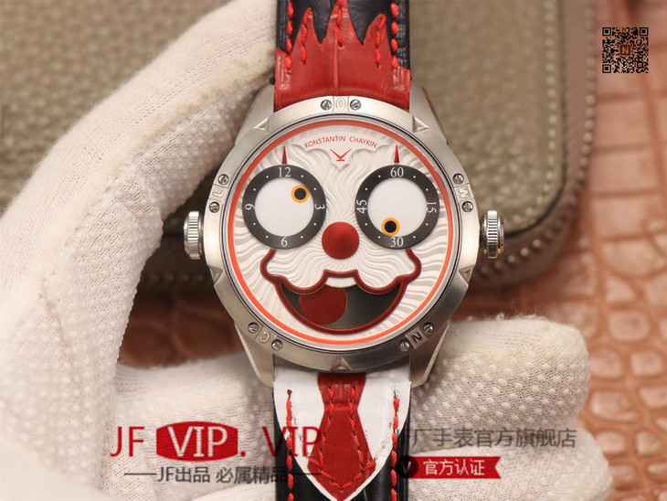 TW俄罗斯小丑【最高版本V3S真功能快调月相】与原版同步,取得最大成功【没有任何盲区】全面升级【"突破"钟表行业年度大作】AHCI独立制表协会主席康斯坦丁·切金Konstantin Chaykin大师匠心之作【技术突破】表盘表情神采不断变化的小丑脸,转动的眼睛,疯狂的面容,和吐出的红色舌头,表情变化非常丰富,两只眼睛分别为分钟和小时的指示,月相显示(笑脸),每天有2万多种表情变化,幽默性质的独特的设计元素【表壳直径42mmX11.8mm与原装同步】采用进口(全自动精工机械)手表自制机芯,功能百分百同步原版,走时稳定,素质坚挺。整体细节圈口侧面精细CNC打磨耗时费力多次调整模具,确保神韵和感觉能与原装相媲美,满足您对俄罗斯小丑"笑脸"的一切美好情怀。