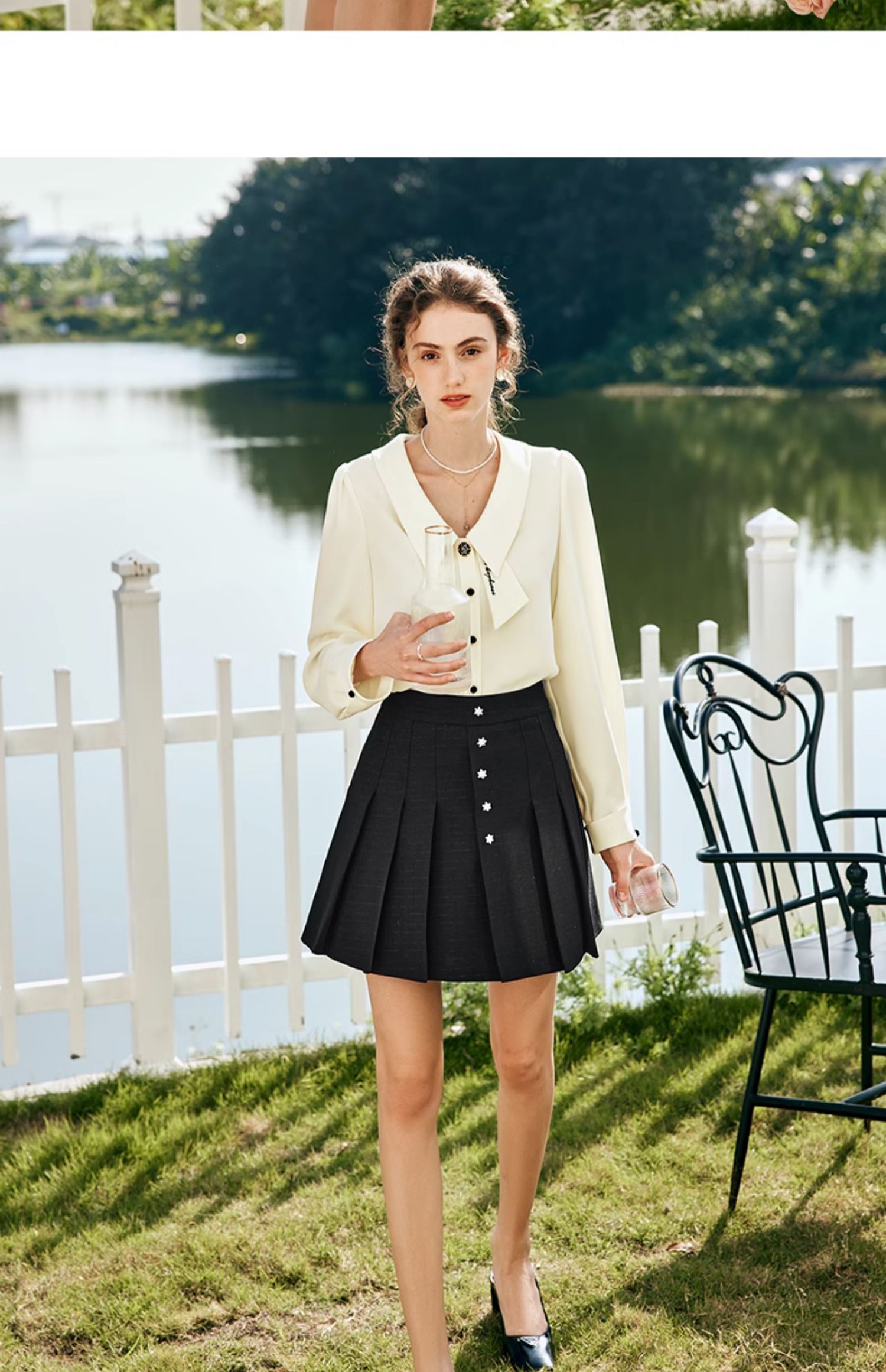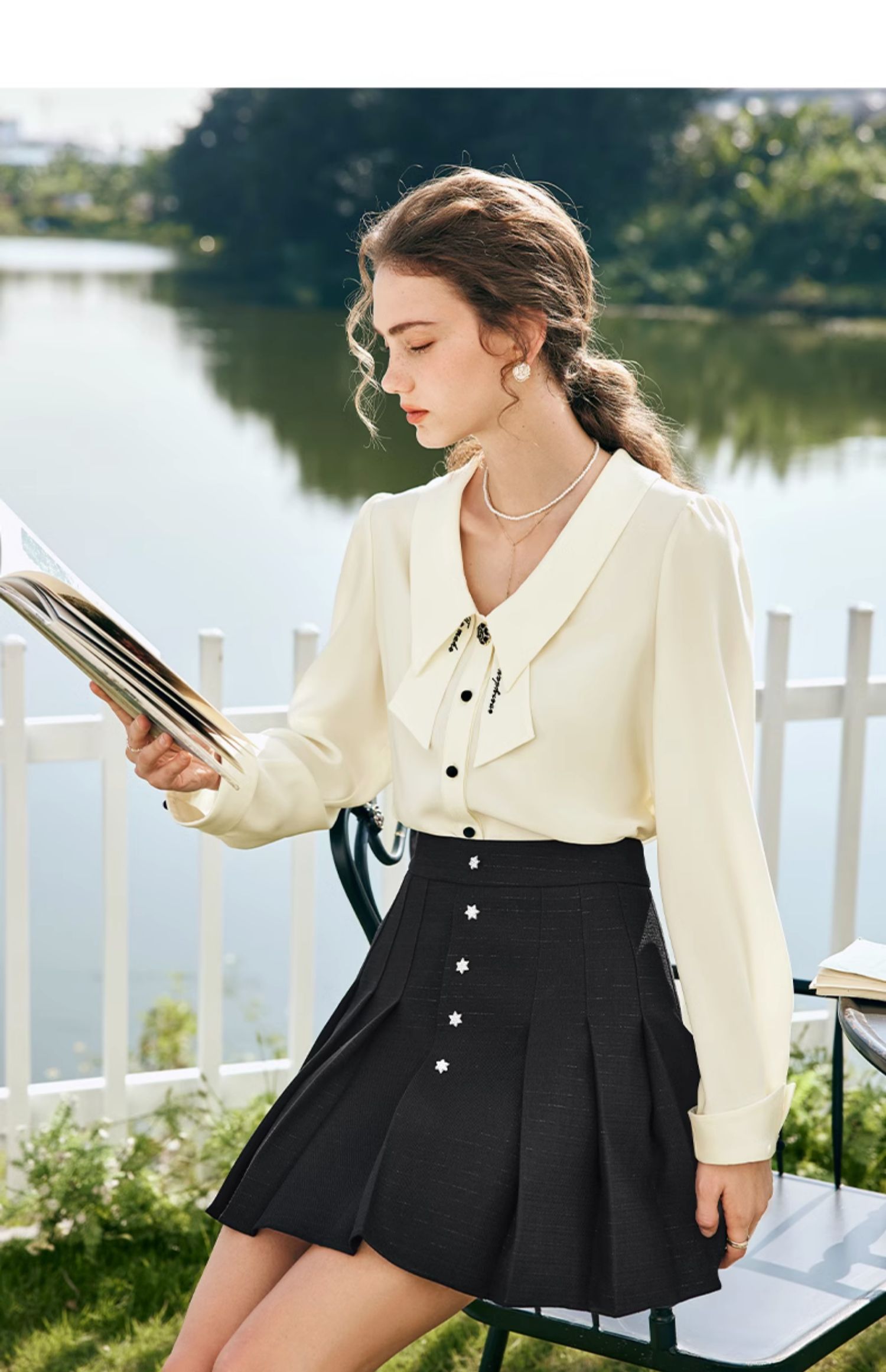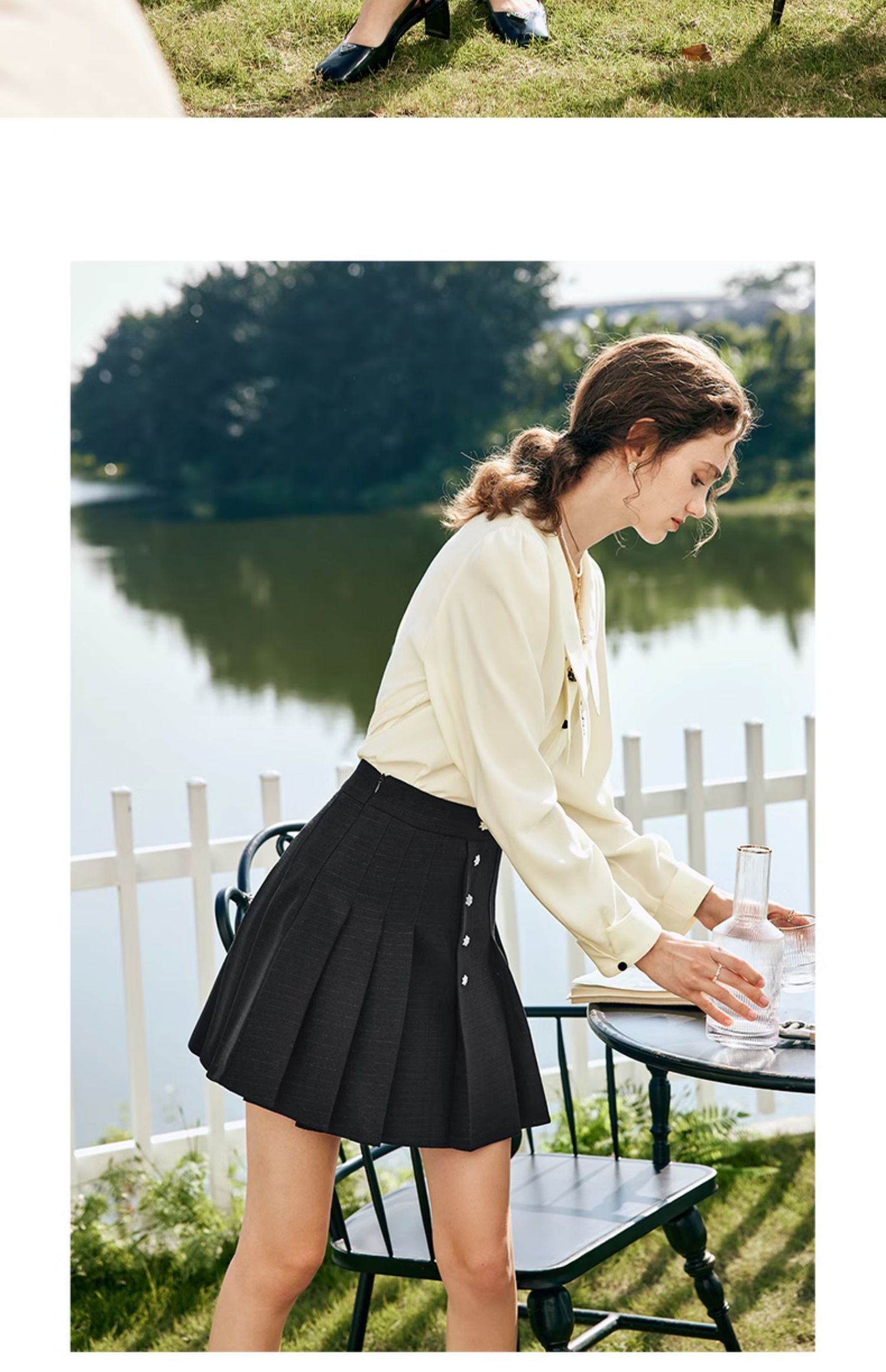 OLrain欧芮儿法式黑色半身裙女春季2024新款高腰减龄压褶A字短裙