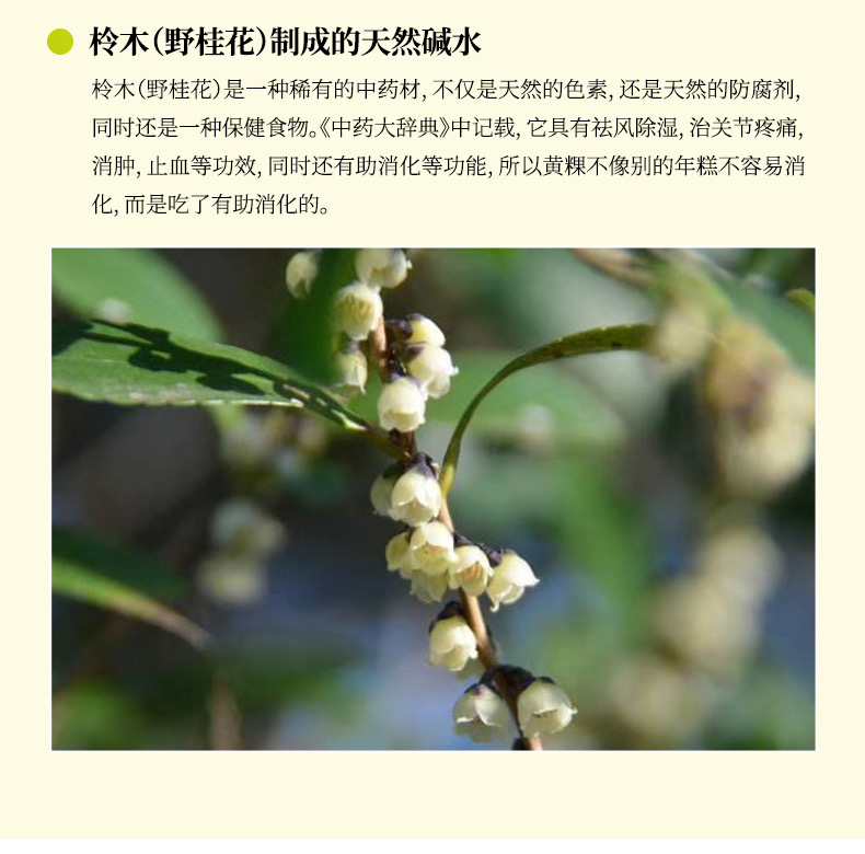 【产品成分】优选粳米、纯净山泉、高山产的高品质柃木(野桂花)制成的纯天然植物碱