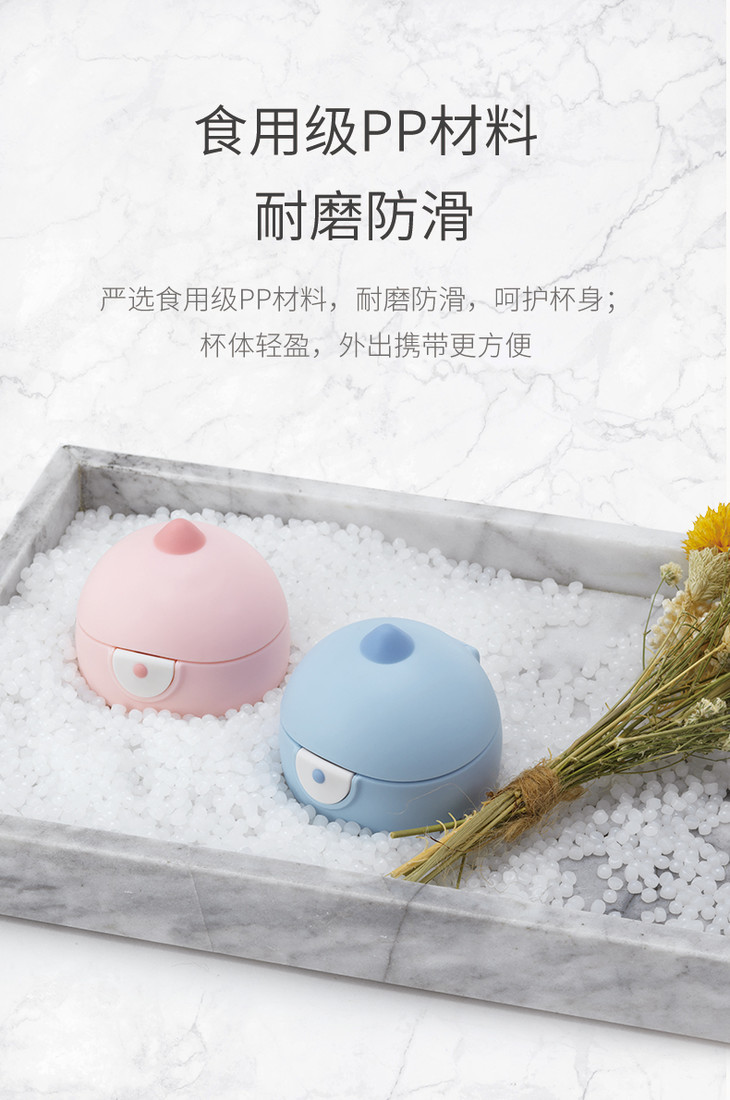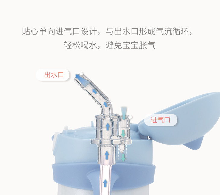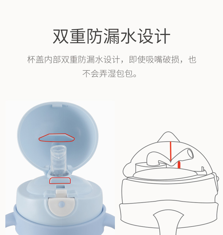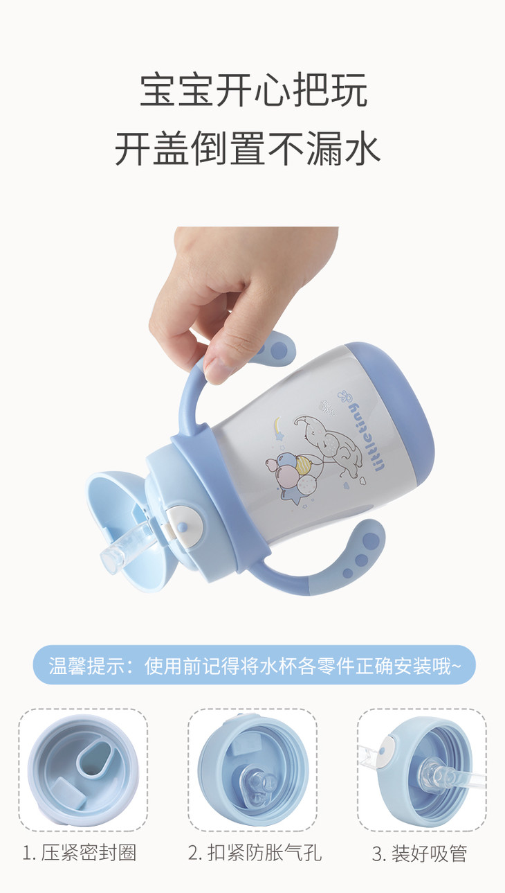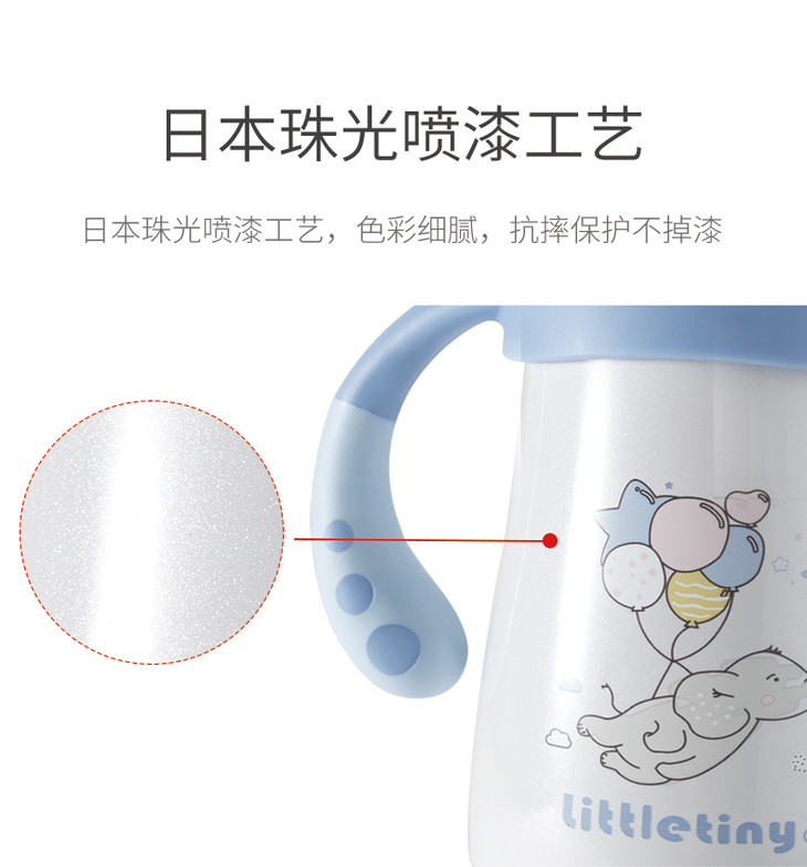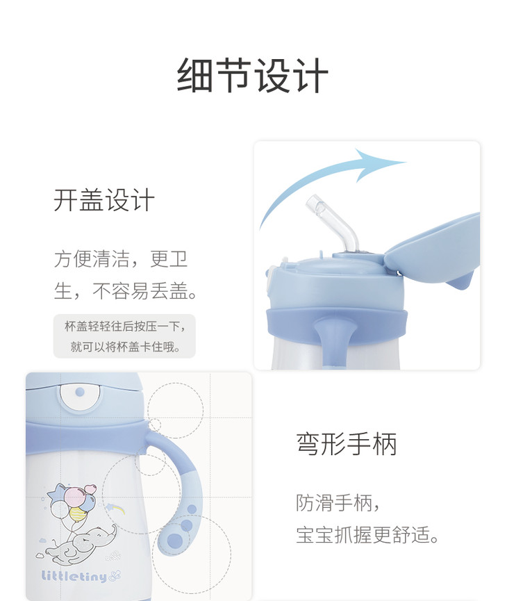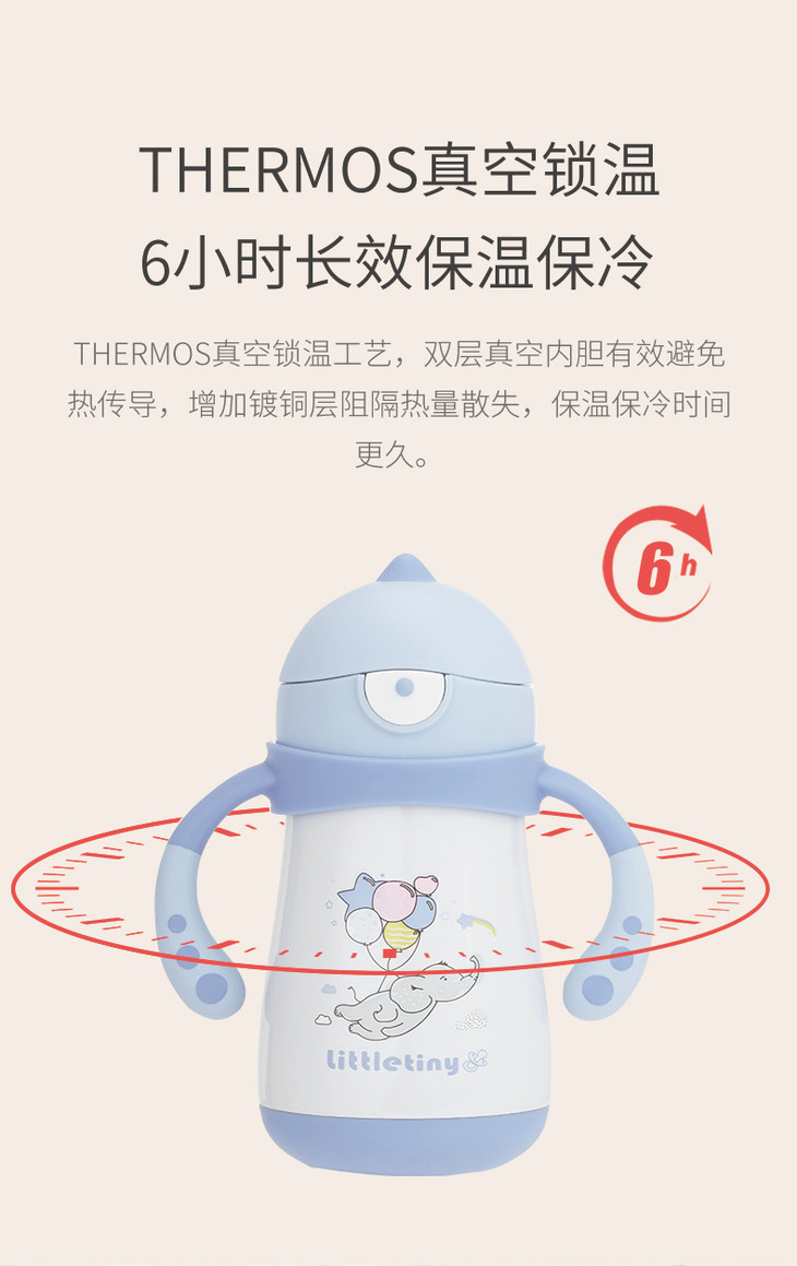 保温杯手柄是套在杯口可转动的,设计用意是:一方面可以配合宝宝不同方向的抓握需求,另一个方面则是为了保证宝宝的安全,以防宝宝抓着杯子摔倒时,杯子对宝宝造成二次伤害。