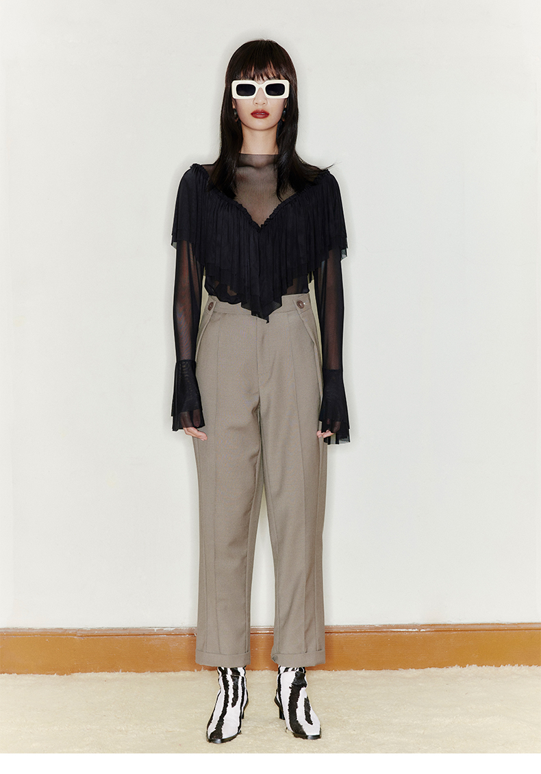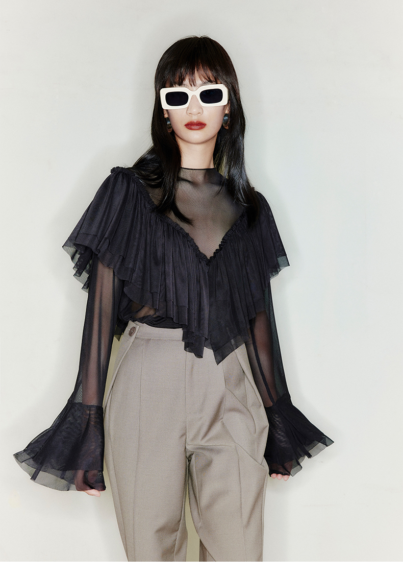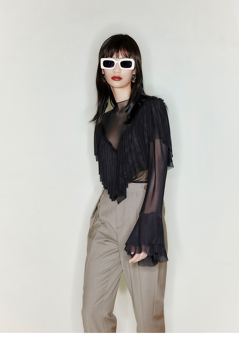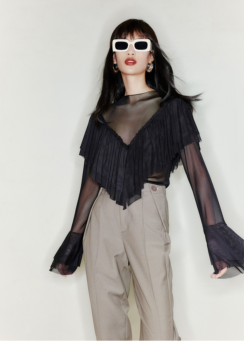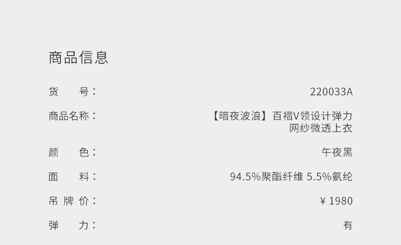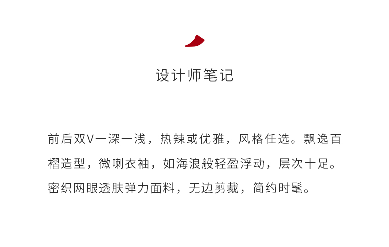 【暗夜波浪】百褶V领设计弹力网纱微透上衣/220033A
