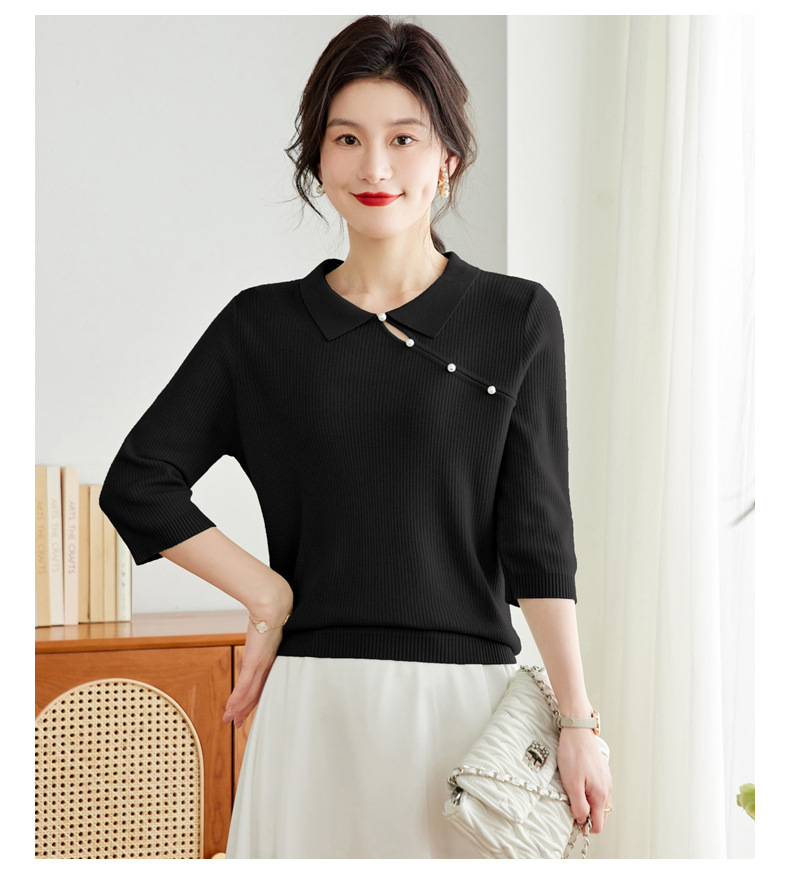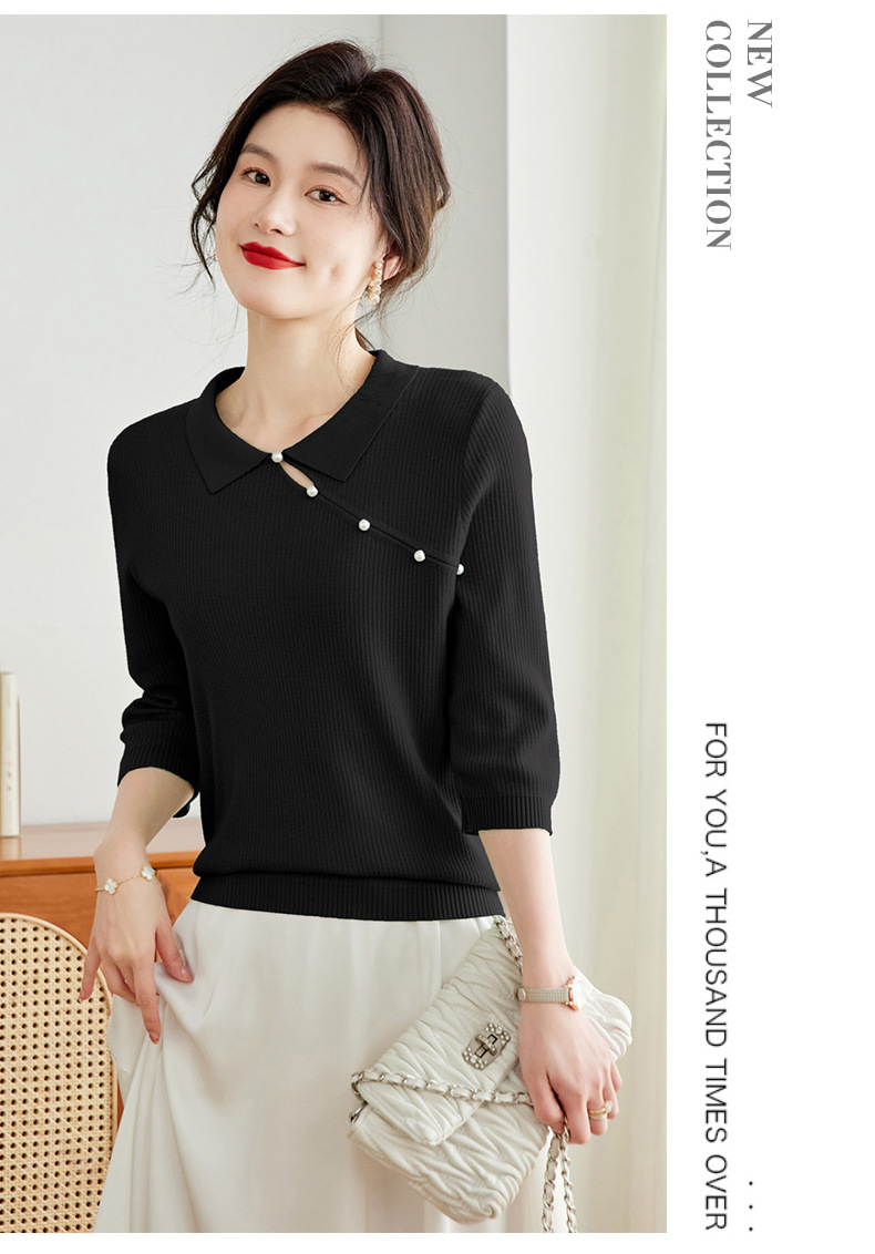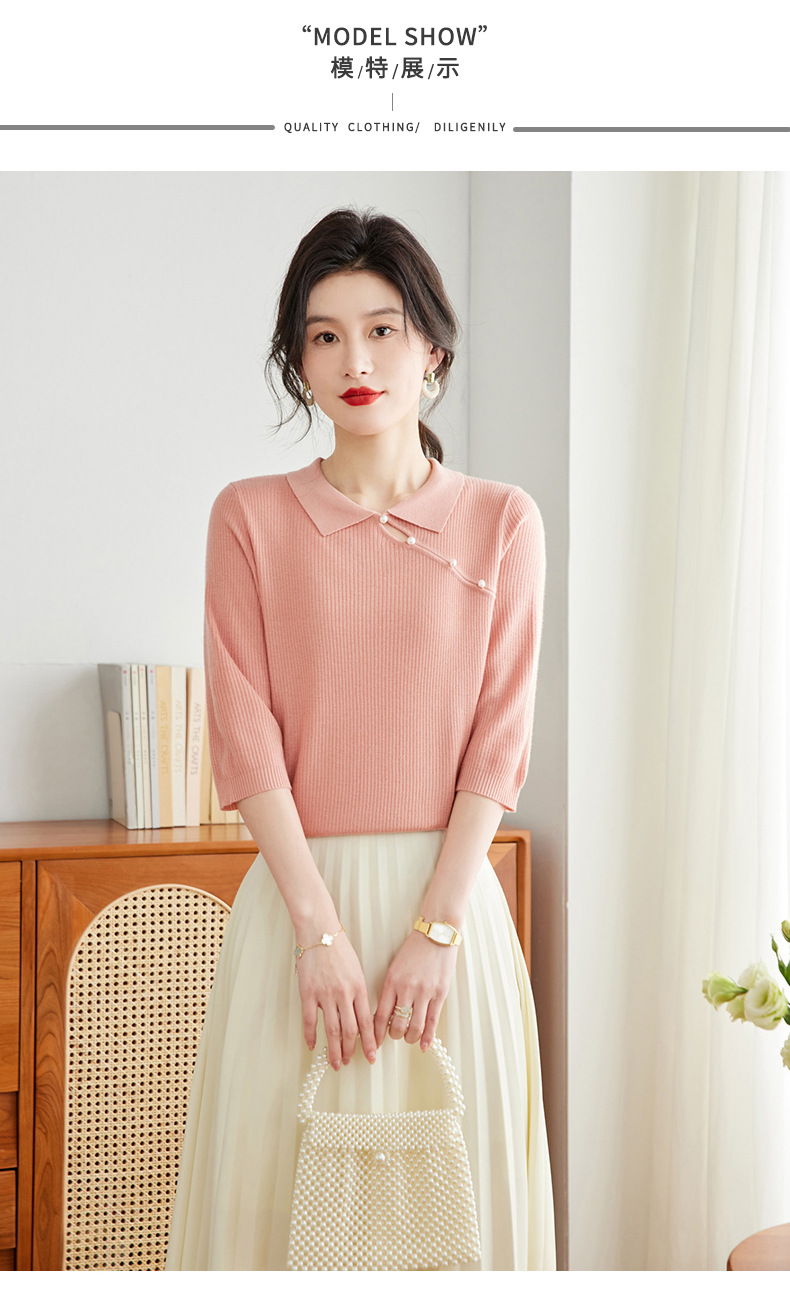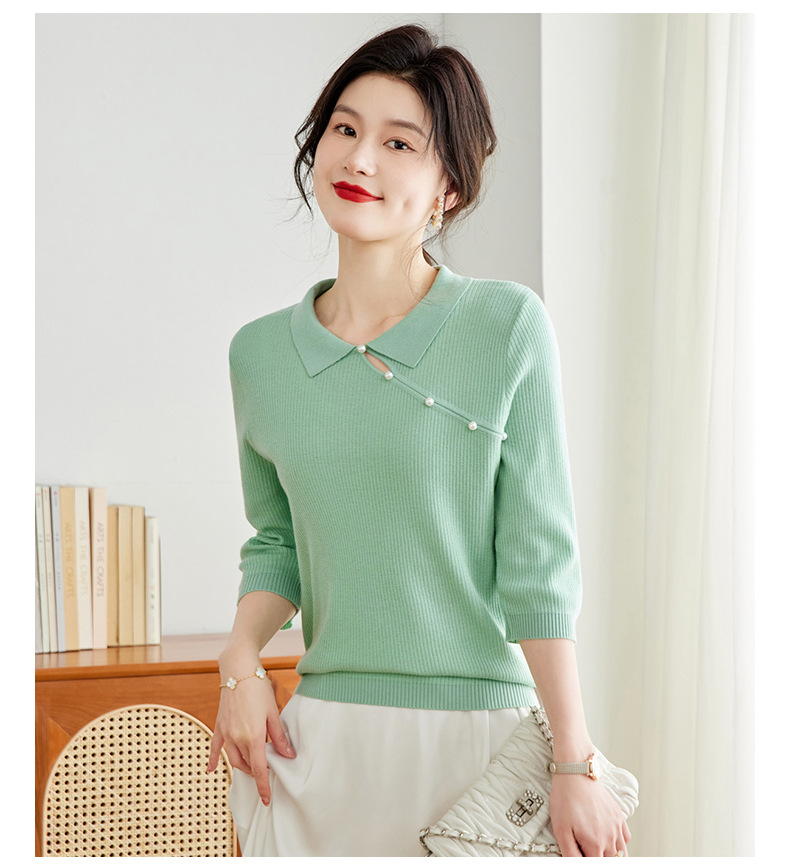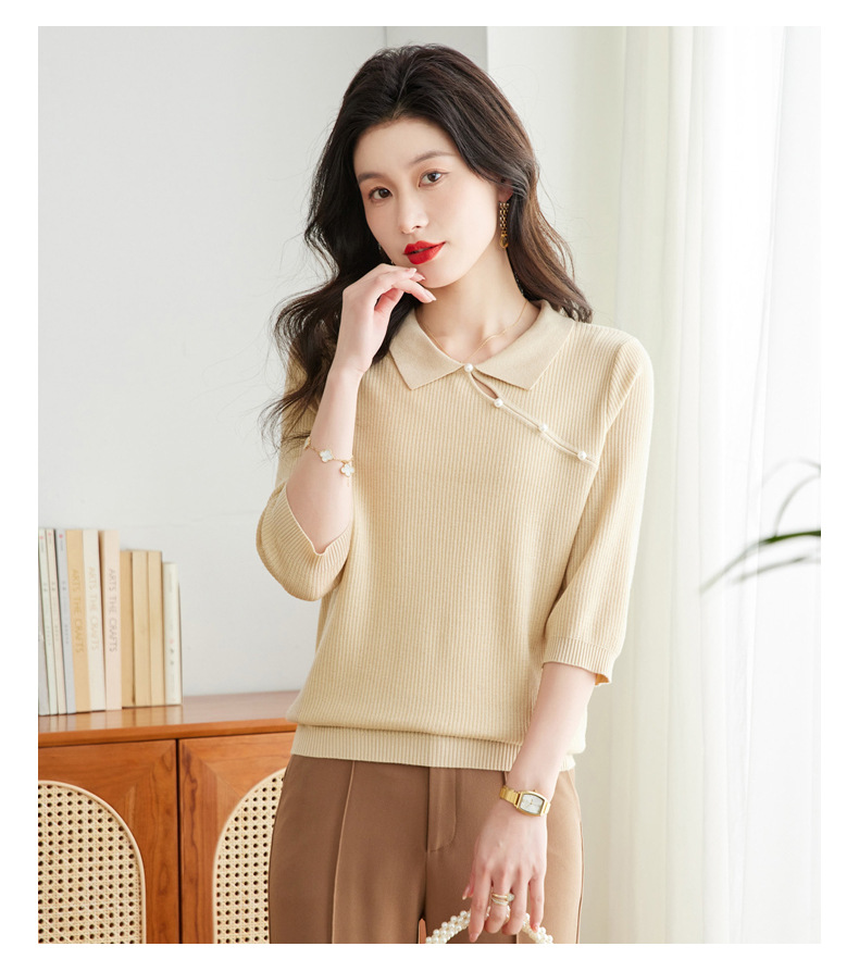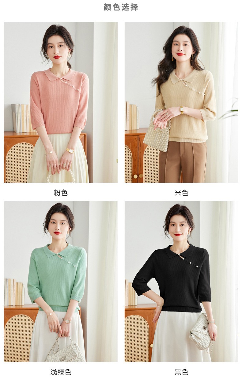 娃娃领七分袖针织衫,女冰丝半袖上衣春夏季新款翻领t恤上衣CC-16-6820