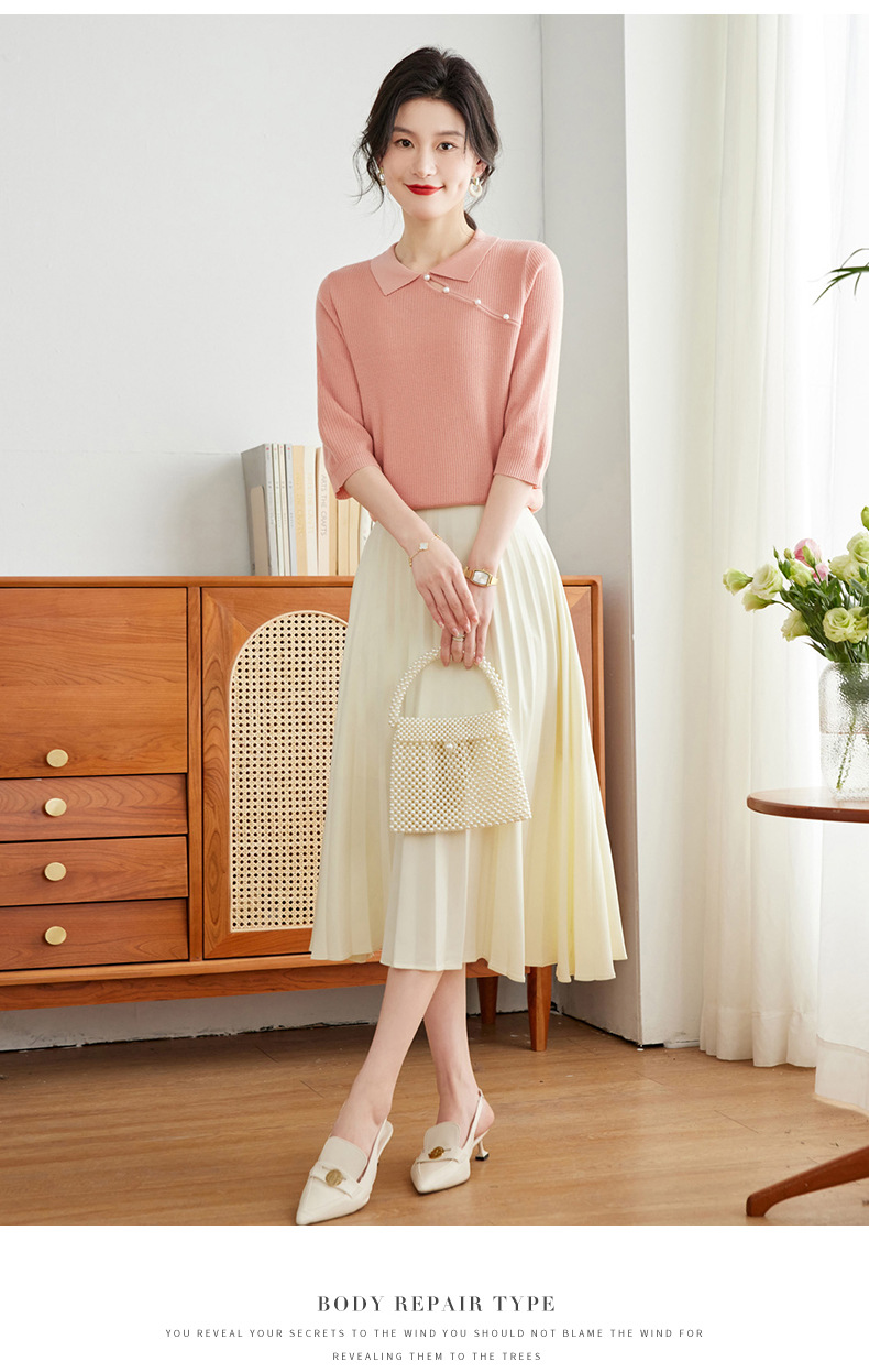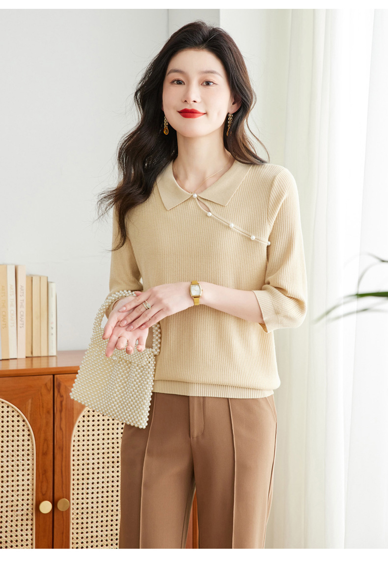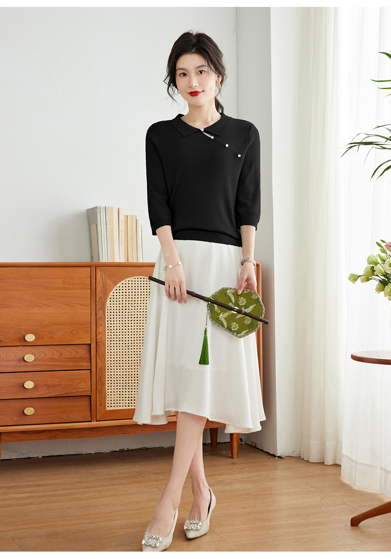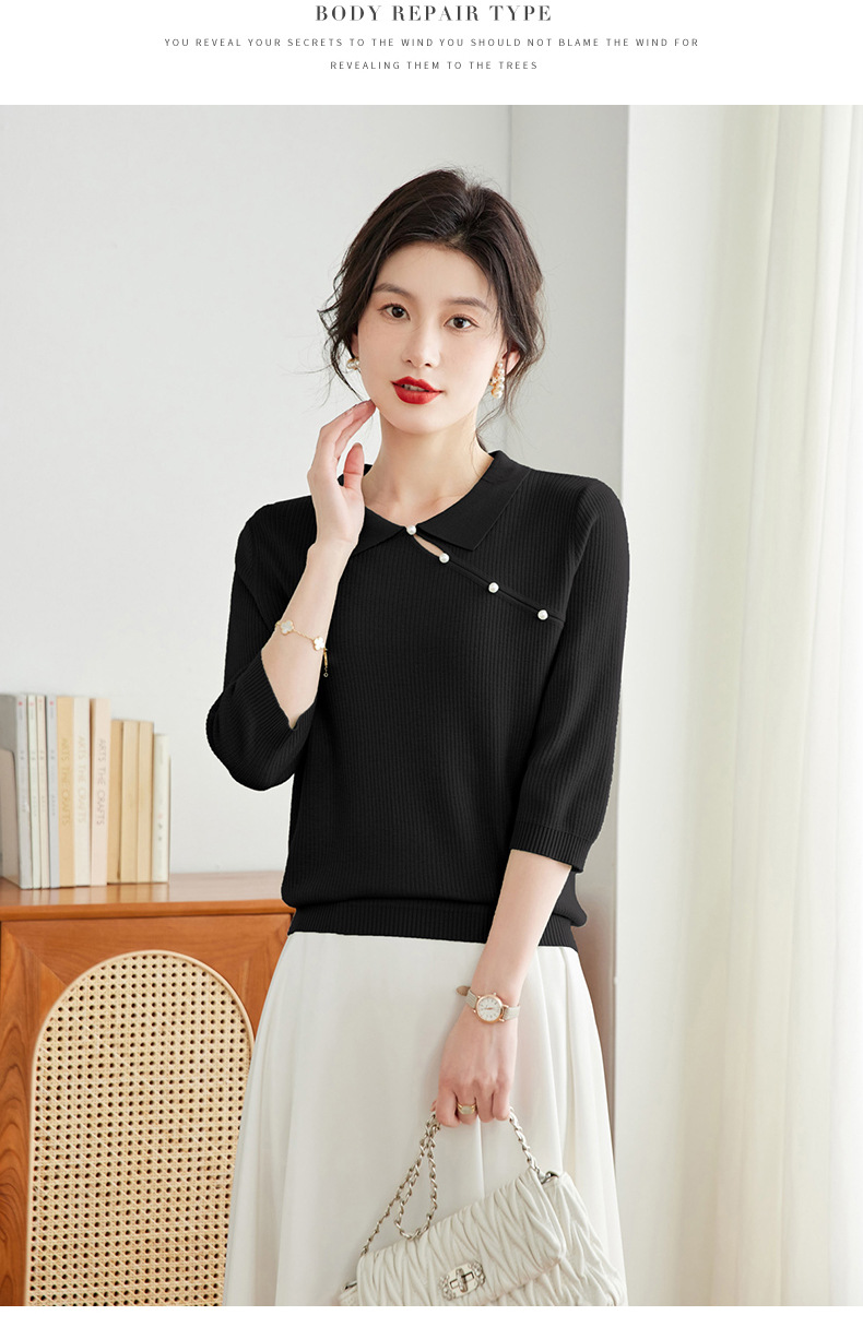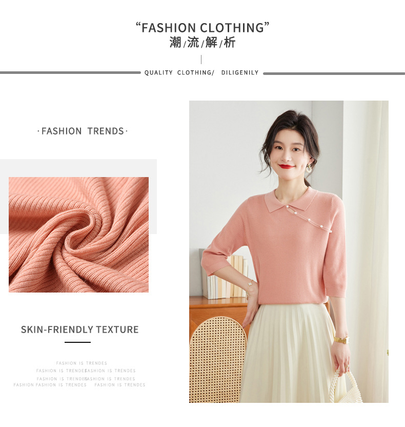 娃娃领七分袖针织衫,女冰丝半袖上衣春夏季新款翻领t恤上衣CC-16-6820