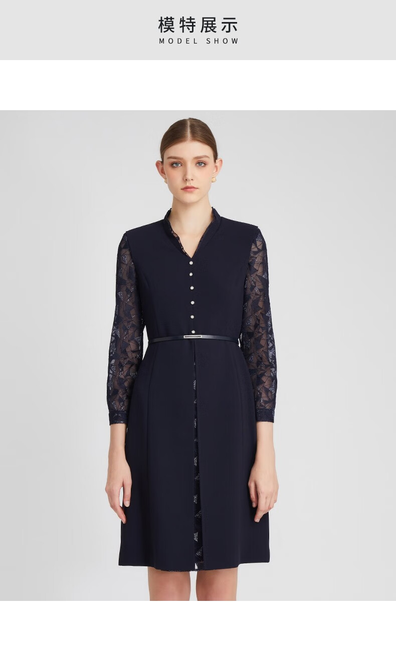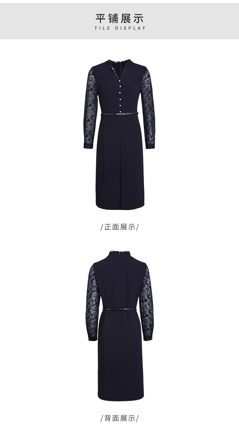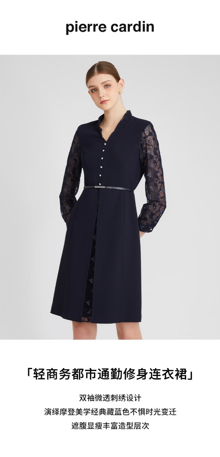 皮尔卡丹女装连衣裙通勤轻商务修身显瘦蕾丝袖淑女裙P2397E2942N0