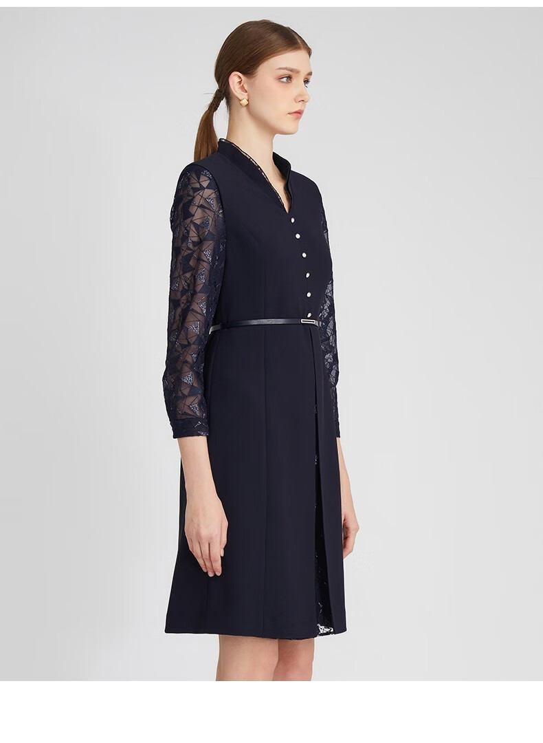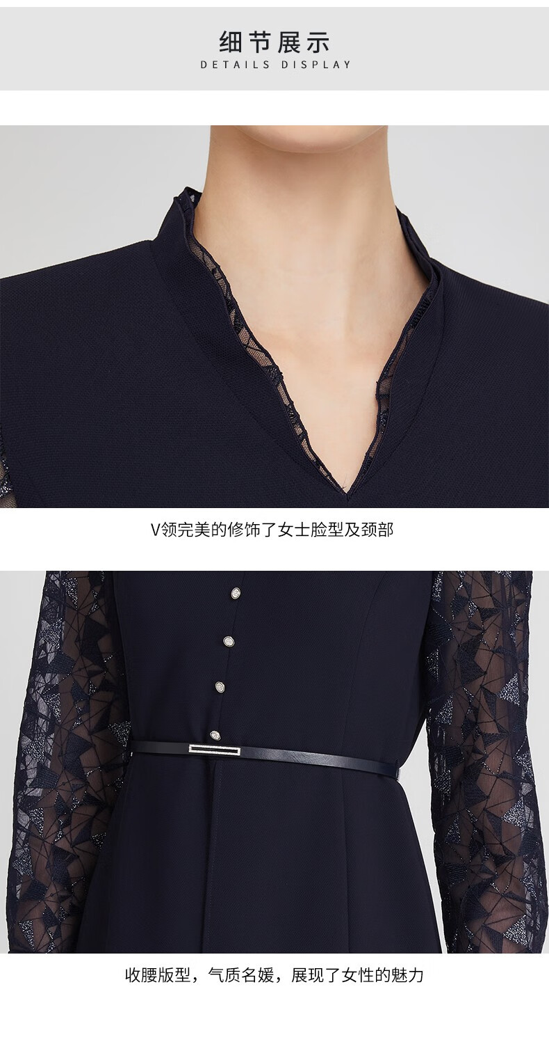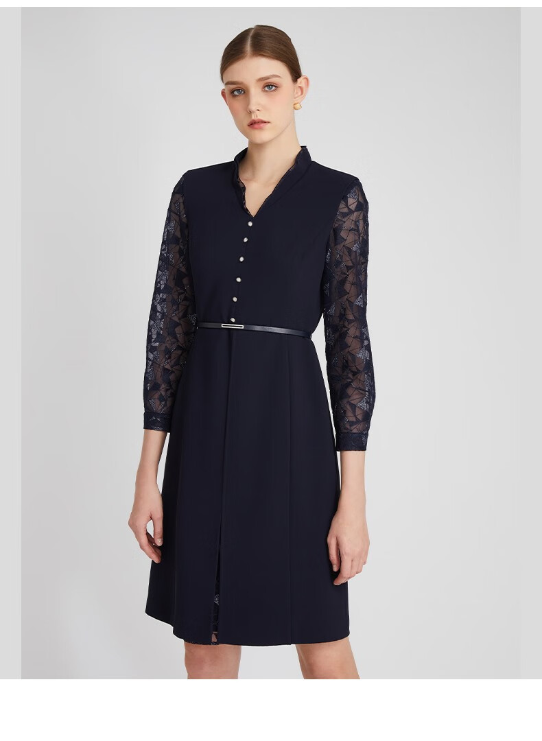 皮尔卡丹女装连衣裙通勤轻商务修身显瘦蕾丝袖淑女裙P2397E2942N0