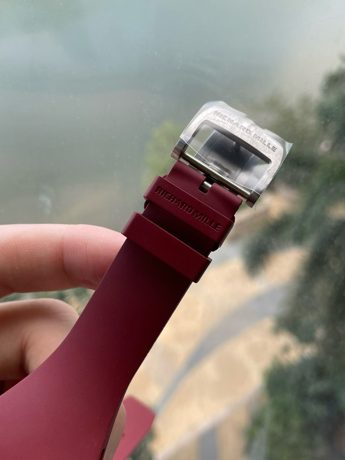 Paired with natural rubber strap, pure titanium brushed clasp with deep engraved lettering