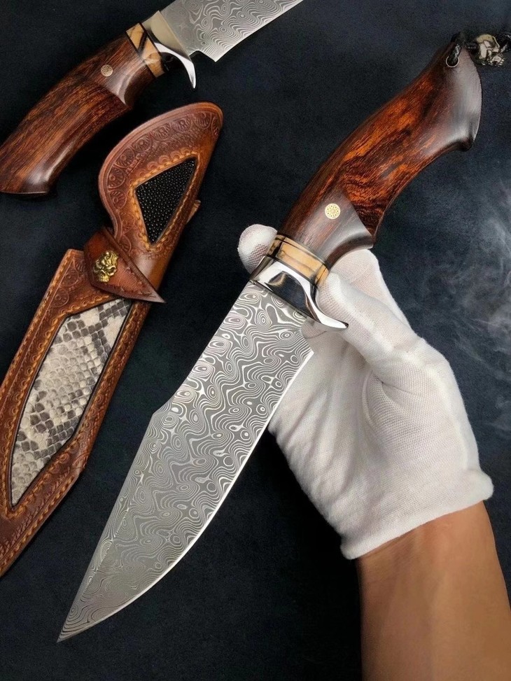 总长:29cm、刃长:14.5cm、手柄长度:13.5cm、刃厚度:4MM、刃宽:4.1cm、刃钢材:美国进口95层锻造大马士革钢、真空热处理,硬度:60-61HRC,手柄材质:镜面钢头+猛犸齿料+美国沙铁木,包装配置:手工皮套+骷髅吊坠+保养油1瓶。