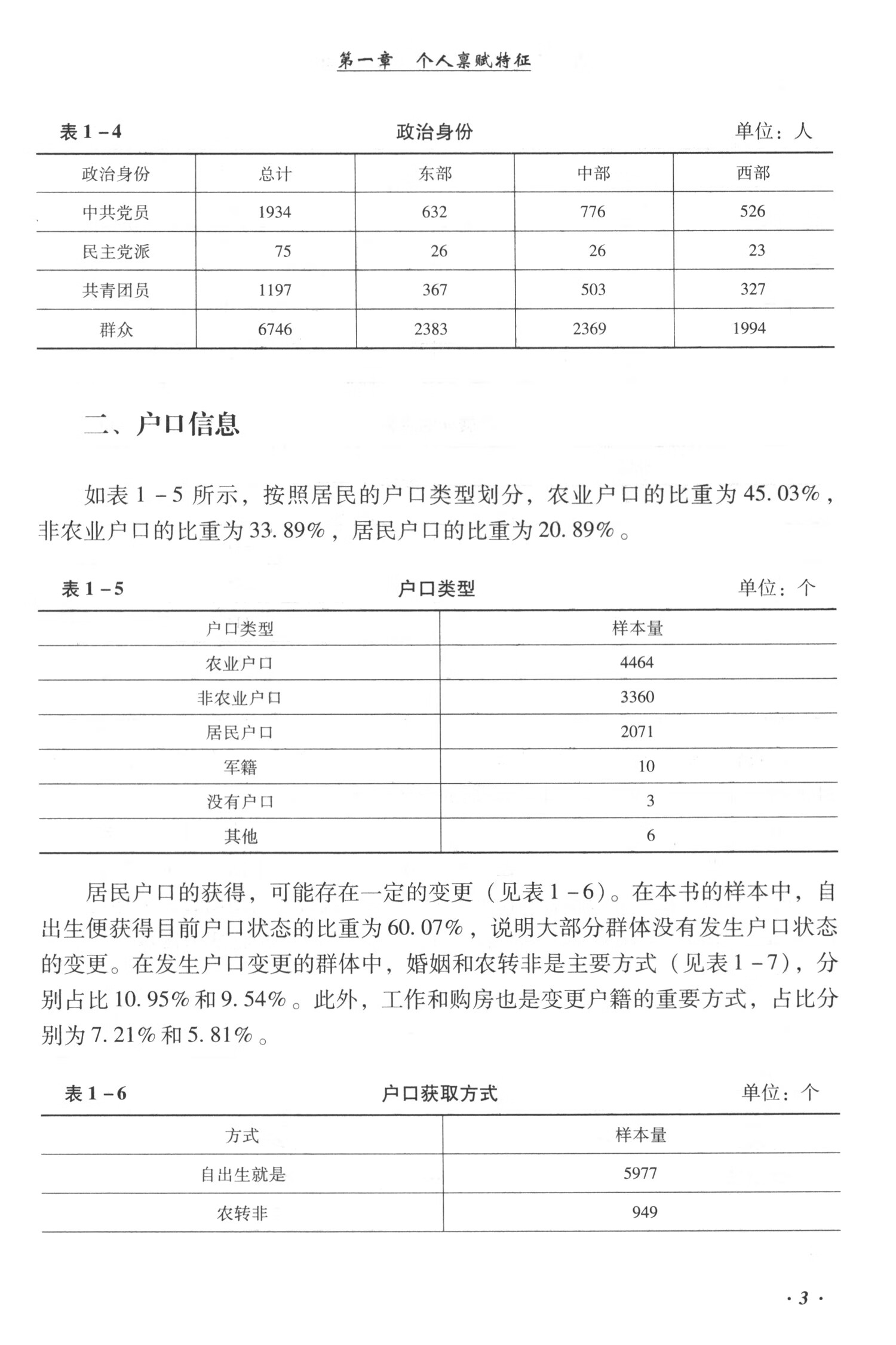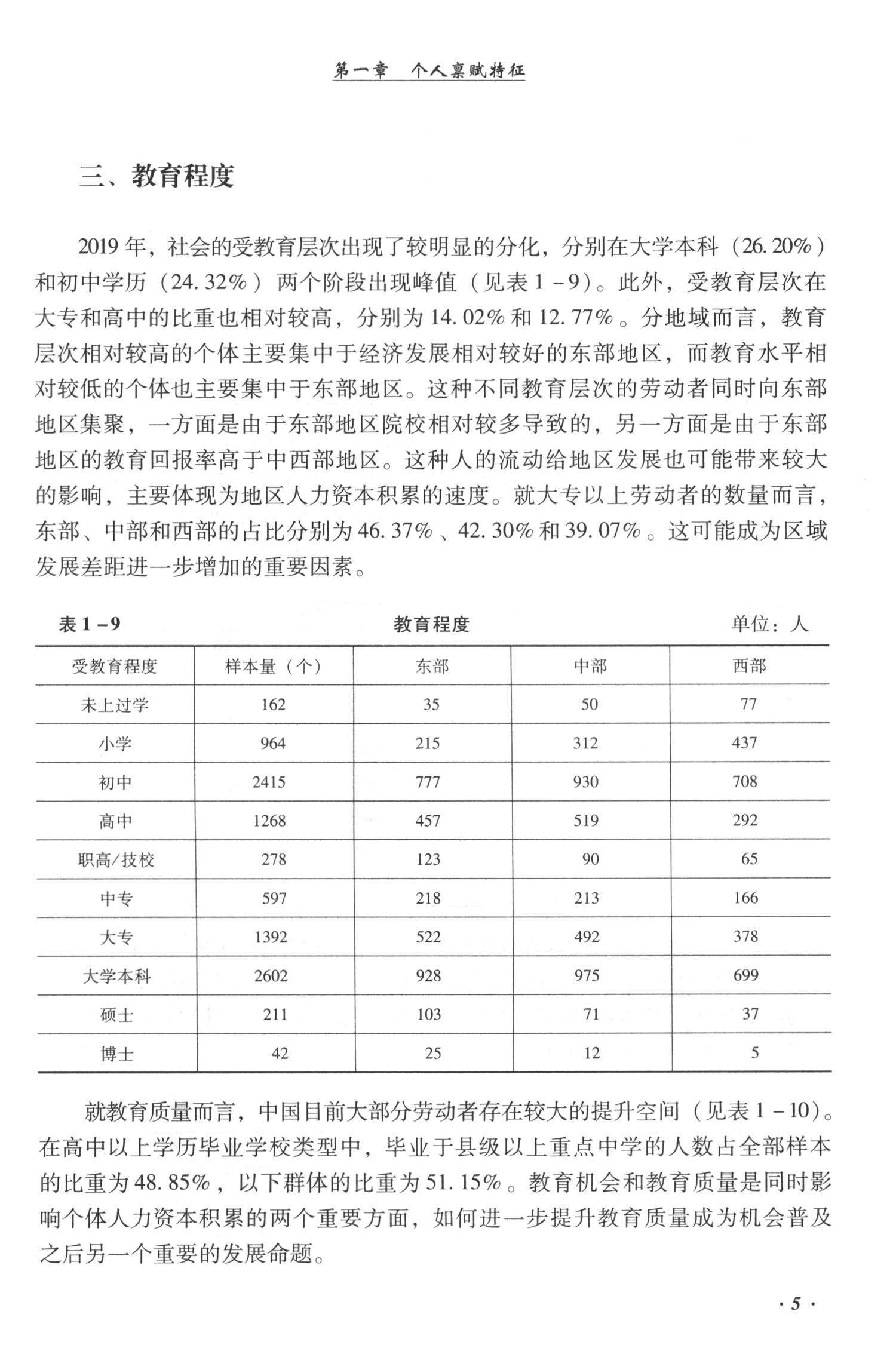 第一章从基本特征、户籍、教育、健康和社会保障五个方面,对中国2019年居民的人口禀赋特征进行了分析,为准确认识中国劳动者状况提供了较新的数据支持。第二章主要分析了当今的就业形势,包括就业状况、农业生产者的状况、个体或私人经营的状况、受雇于他人的状况、失业的状况,并对就业的影响因素进行了相关实证分析。第三章主要对家庭总收入、人均收入和收入构成进行了分析,并根据户主的禀赋特征分析了不同群体的收入差距,在此基础上,度量了全国、城镇及农村的基尼系数,进一步分析了城乡之间、地区之间、行业之间和不同收入阶层的收入差距。第四章将家庭不同财富数量和构成作为研究家庭收入和财富分配状况的分析对象,从家庭的非金融资产、金融资产两大方面分别进行了详细的划分和描述,并对总资产有详细的分析。第五章分别从家庭日常消费支出,家庭非日常消费支出,家庭文娱、医疗及服务性消费支出,家庭消费特征,家庭消费行为,家庭消费观念六个方面对中国2019年家庭消费进行分析,为进一步认识中国居民家庭消费相关情况提供新的数据支持。第六章进一步延伸了居民收入与财富分配研究,探索居民主观幸福感的现状,分析影响居民幸福感的一些因素,以及居民对生活各方面和政府工作的满意情况调查。除此之外还对一些社会热点问题进行了调查,社会热点问题与社会大众的生活息息相关,是居民普遍关注的重要问题,具体包括了政府行为、教育与社会公平、社会阶层和其他社会问题的评价,意在调查公众对这些问题的关注程度和不同收入水平的居民对这些问题及相关解决措施的评价。