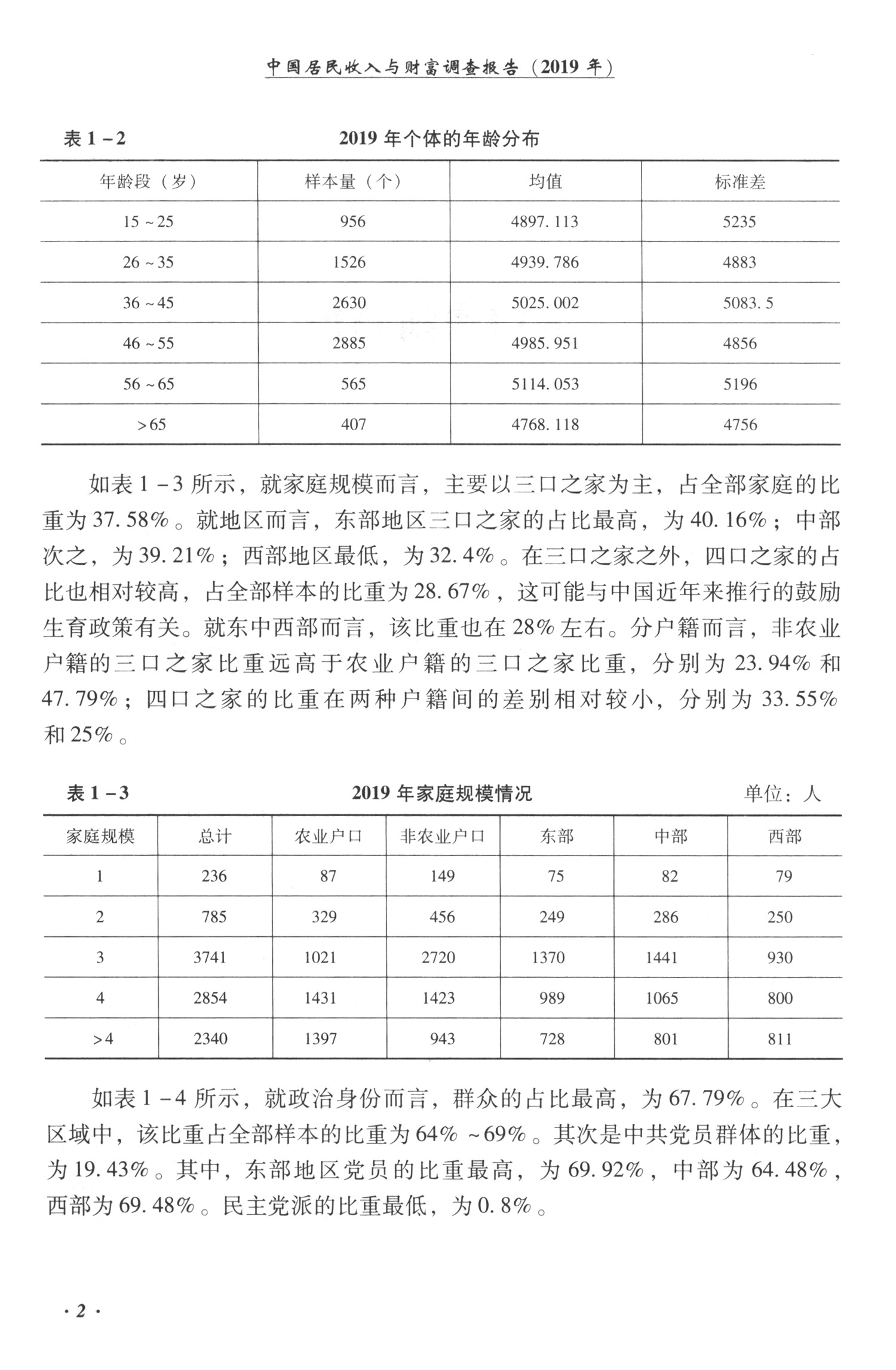 《中国居民收入与财富调查报告》(2019年)的内容框架与前几年的报告保持了一致性,一共包括六章内容,分别是个人禀赋特征、就业、家庭收入、家庭财富、家庭消费、居民主观幸福感,基本上包含了与居民收入和财富相关的多个方面的调查。