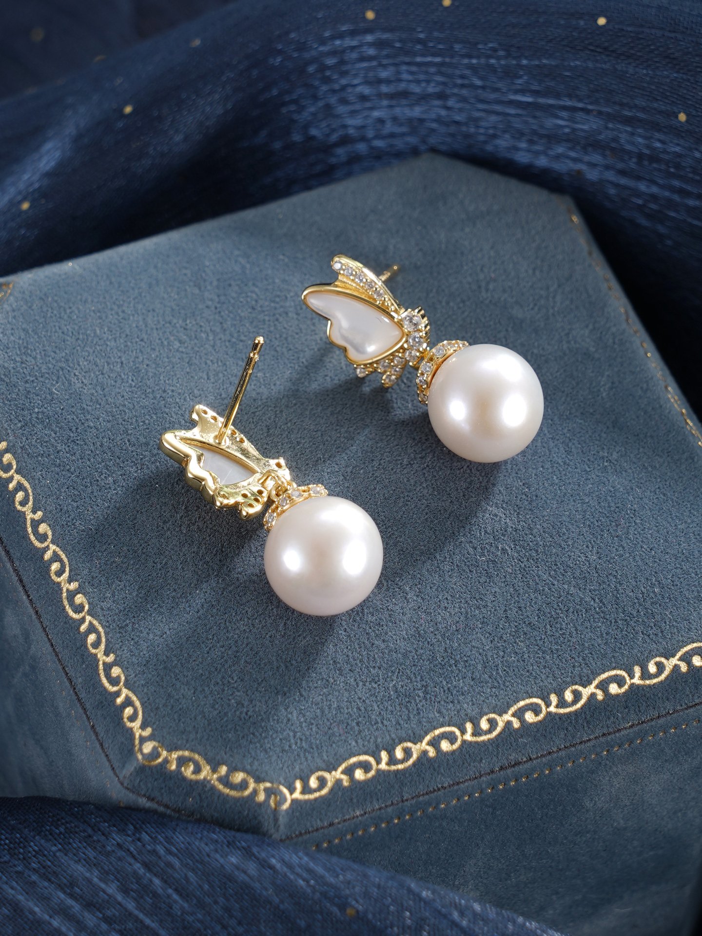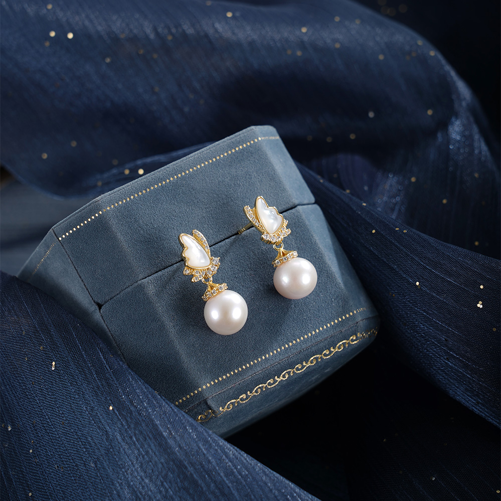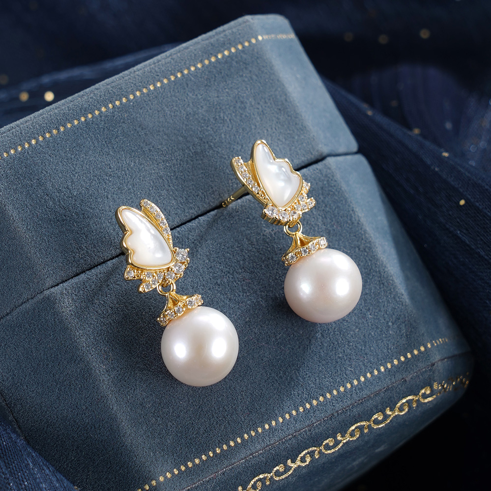 子佩集【蝶梦星河】银S925珍珠惜王妃耳钉【MLEH017】9.5mm珠镀金白贝母蝴蝶2601