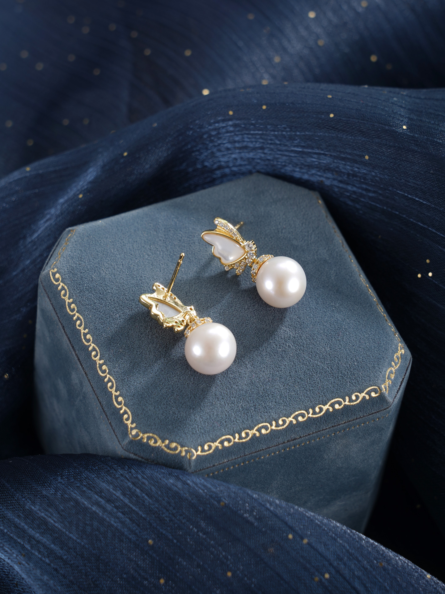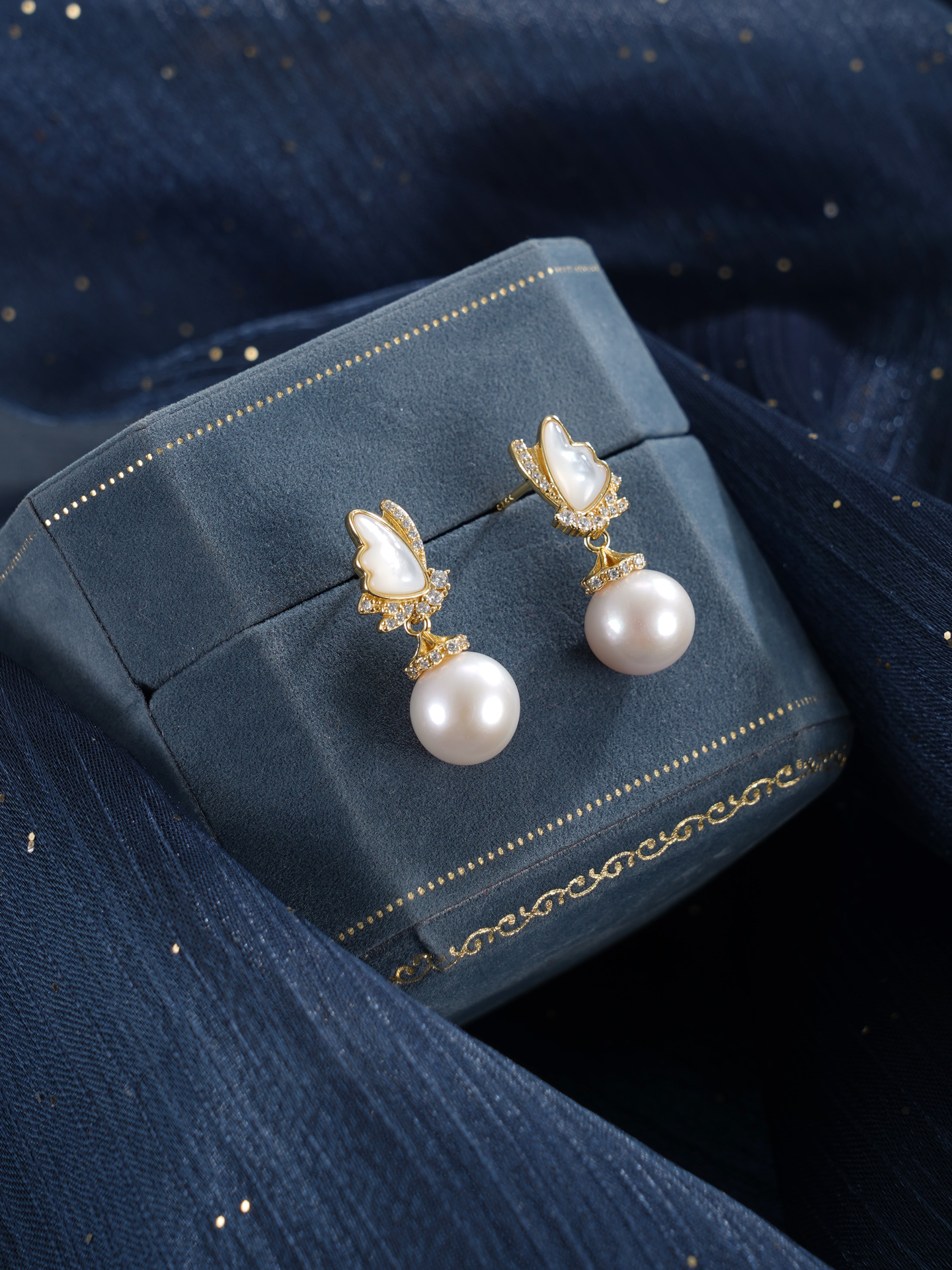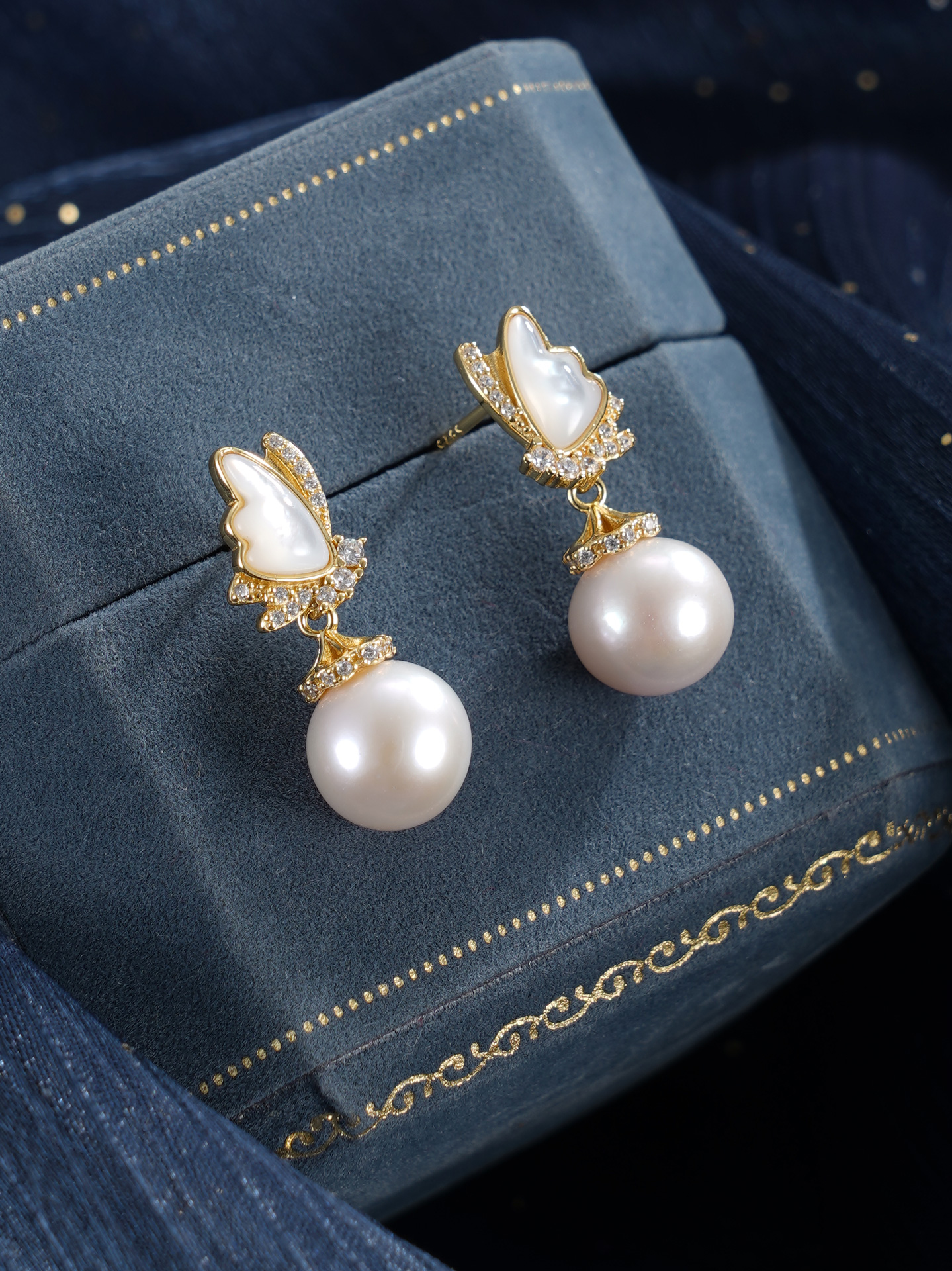 子佩集【蝶梦星河】银S925珍珠惜王妃耳钉【MLEH017】9.5mm珠镀金白贝母蝴蝶2601