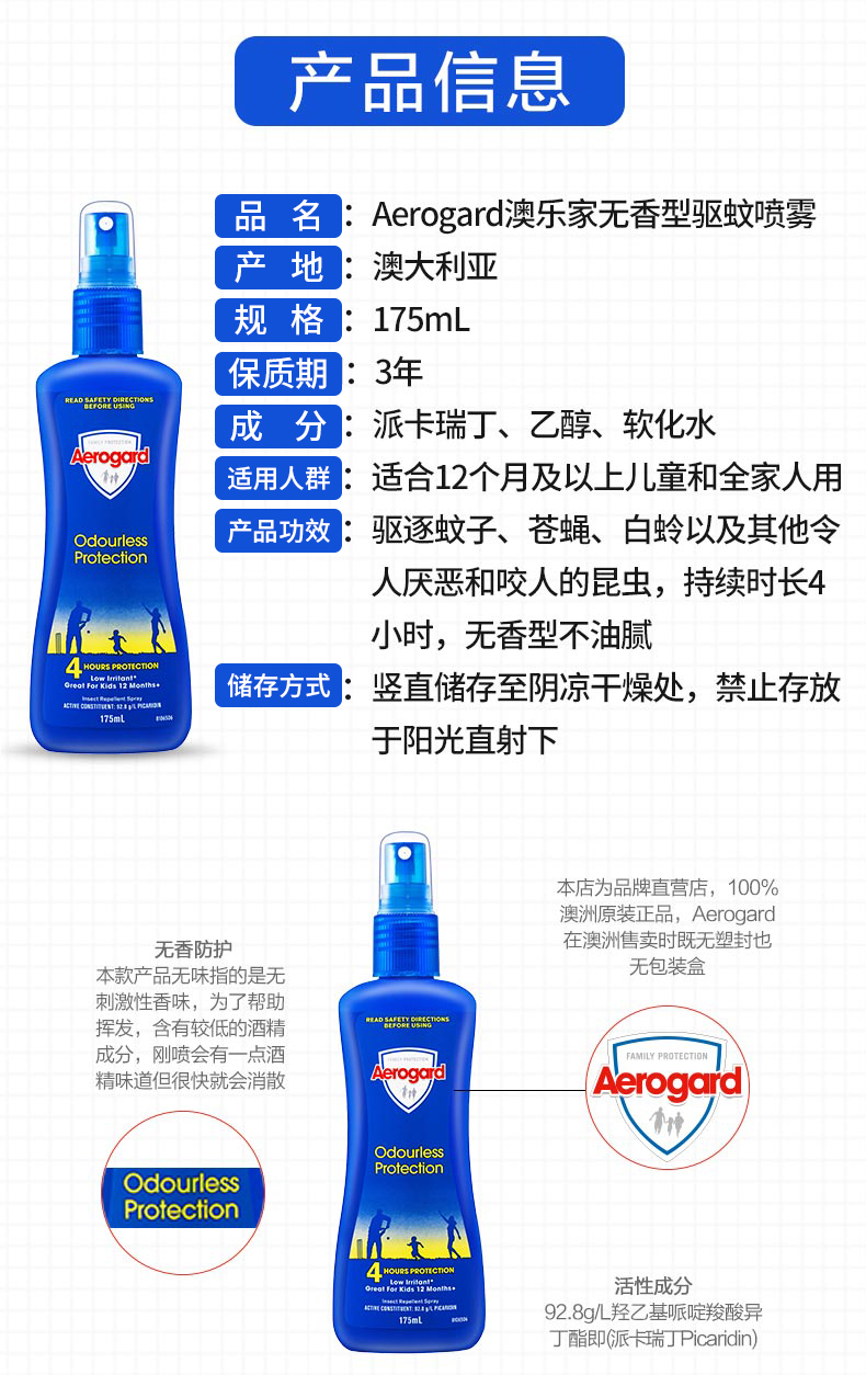 Aerogard澳乐家澳洲婴儿驱蚊液防蚊喷雾孕妇宝宝户驱蚊水175mlJQR