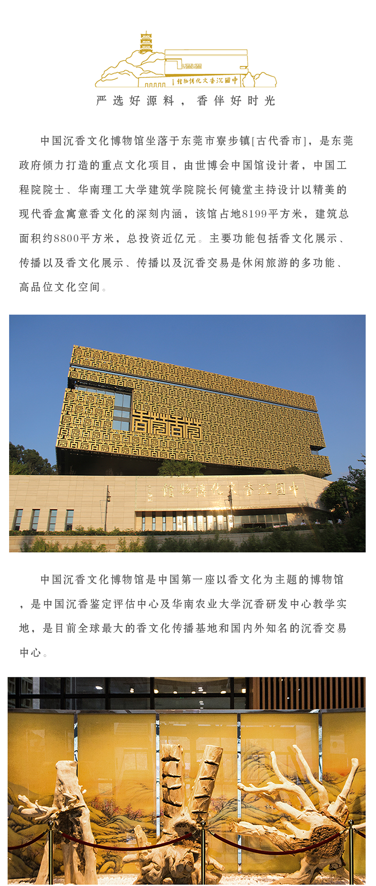 中国沉香文化博物馆坐落于古代[香市]东莞市寮步镇,是东莞政府倾力打造的重点文化项目,由世博会中国馆设计者,中国工程院院士、华南理工大学建筑学院院长何镜堂主持设计,以精美的现代[香盒]寓意香文化的深刻内
