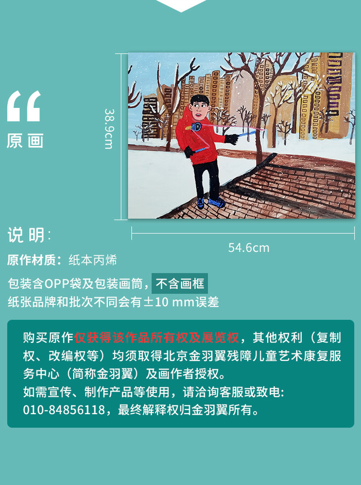 - 金羽翼将艺术与心理治疗相结合,用艺术教育的形式帮助残障青少年体现自身价值、提高生活质量、实现艺术梦想,并将绘画作品开发成衍生品销售,收入扣除成本后,20%返还给学员家庭,80%用于金羽翼艺术康复教学。