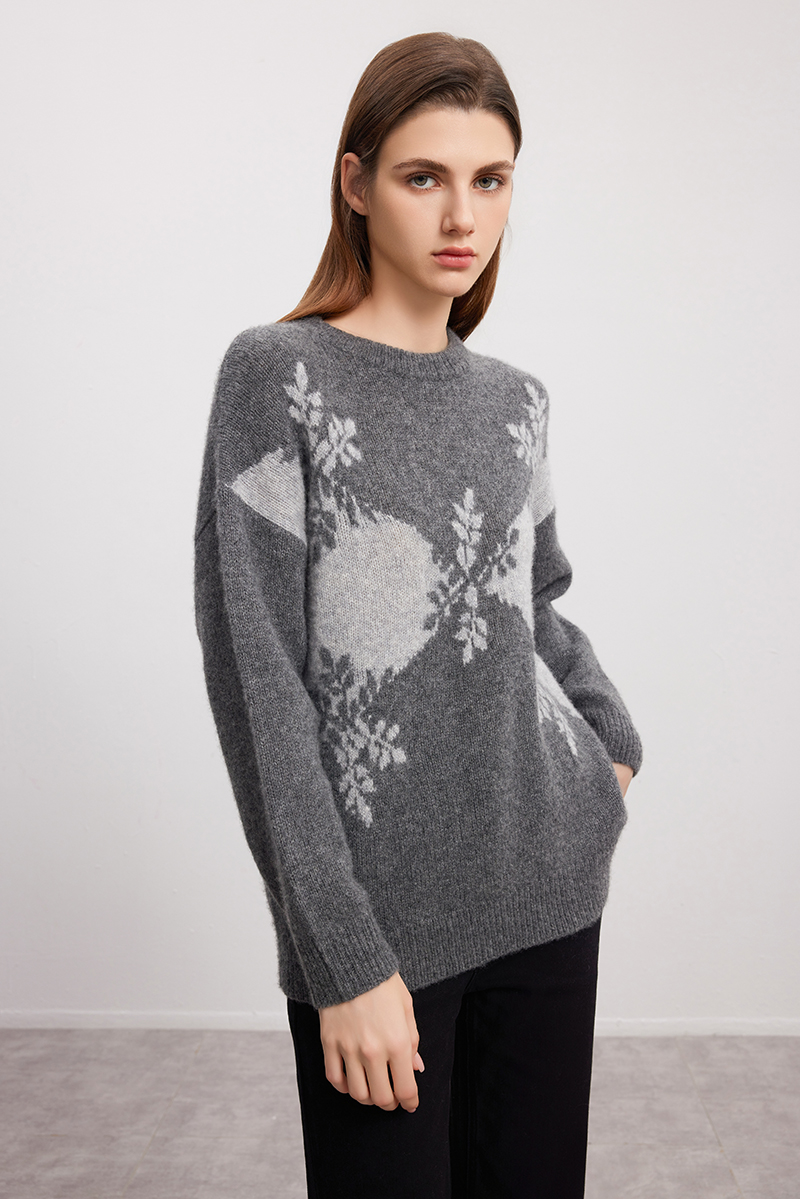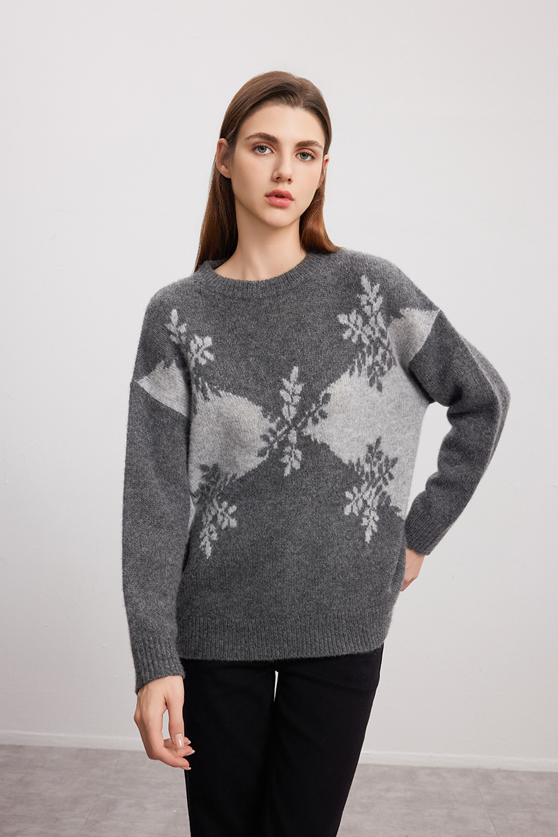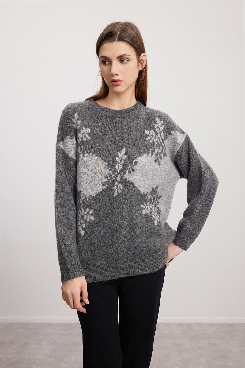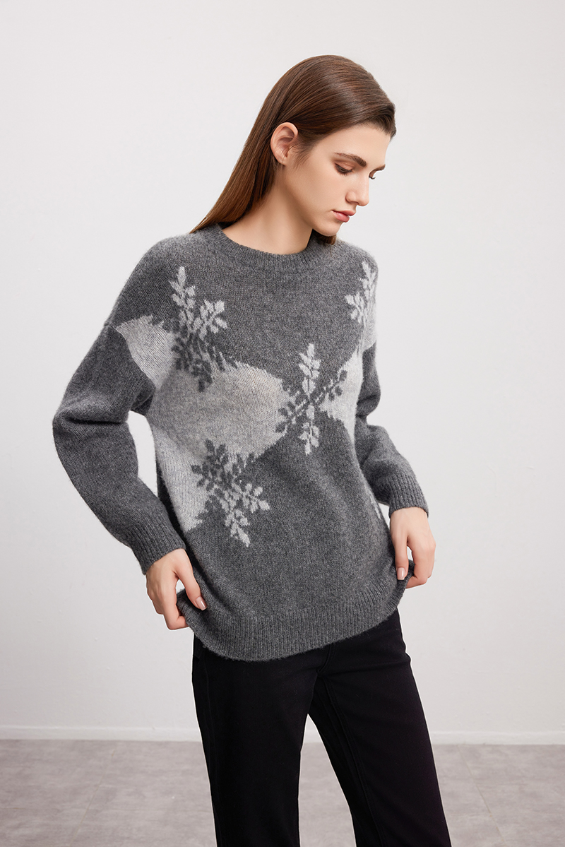 【羊绒+桑蚕丝针织衫】羊绒世家秋冬新品女士圆领针织套衫雪花图案内搭保暖毛衣