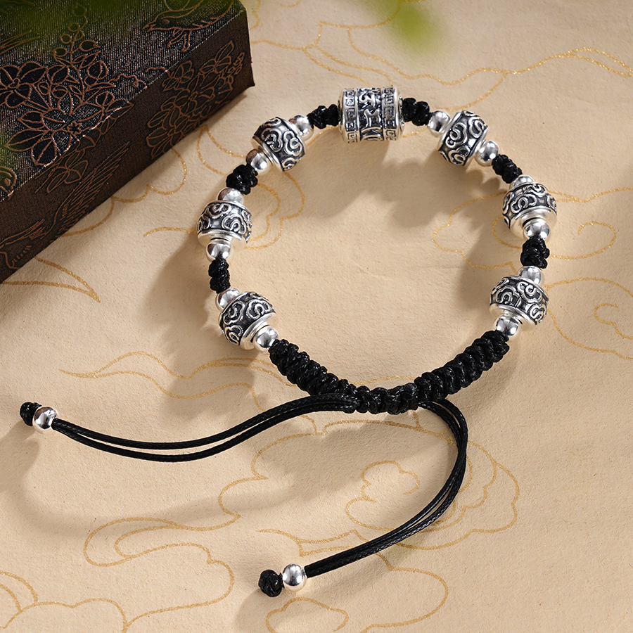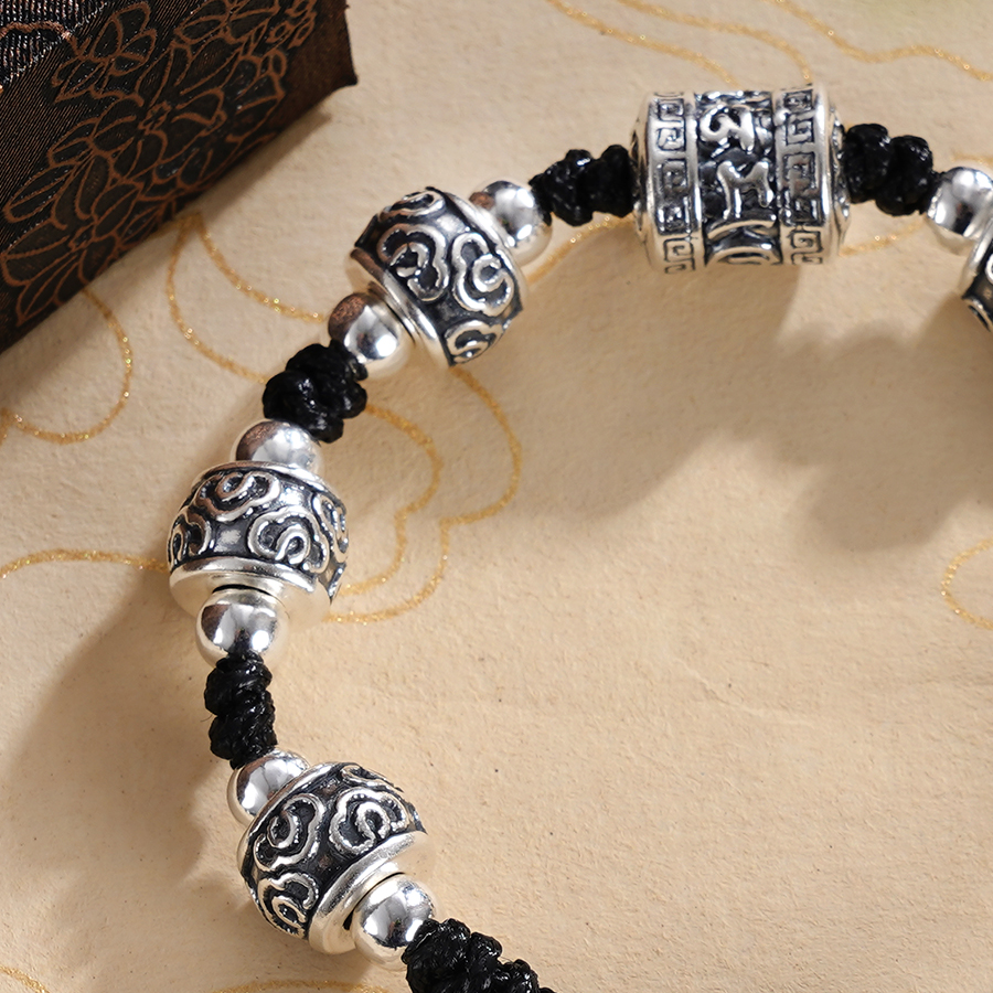【寓意】:真言与祥云元素,錾刻在纯银桶珠之上。复古祥和,古韵延绵。寓意着如意吉祥与财源滚滚。