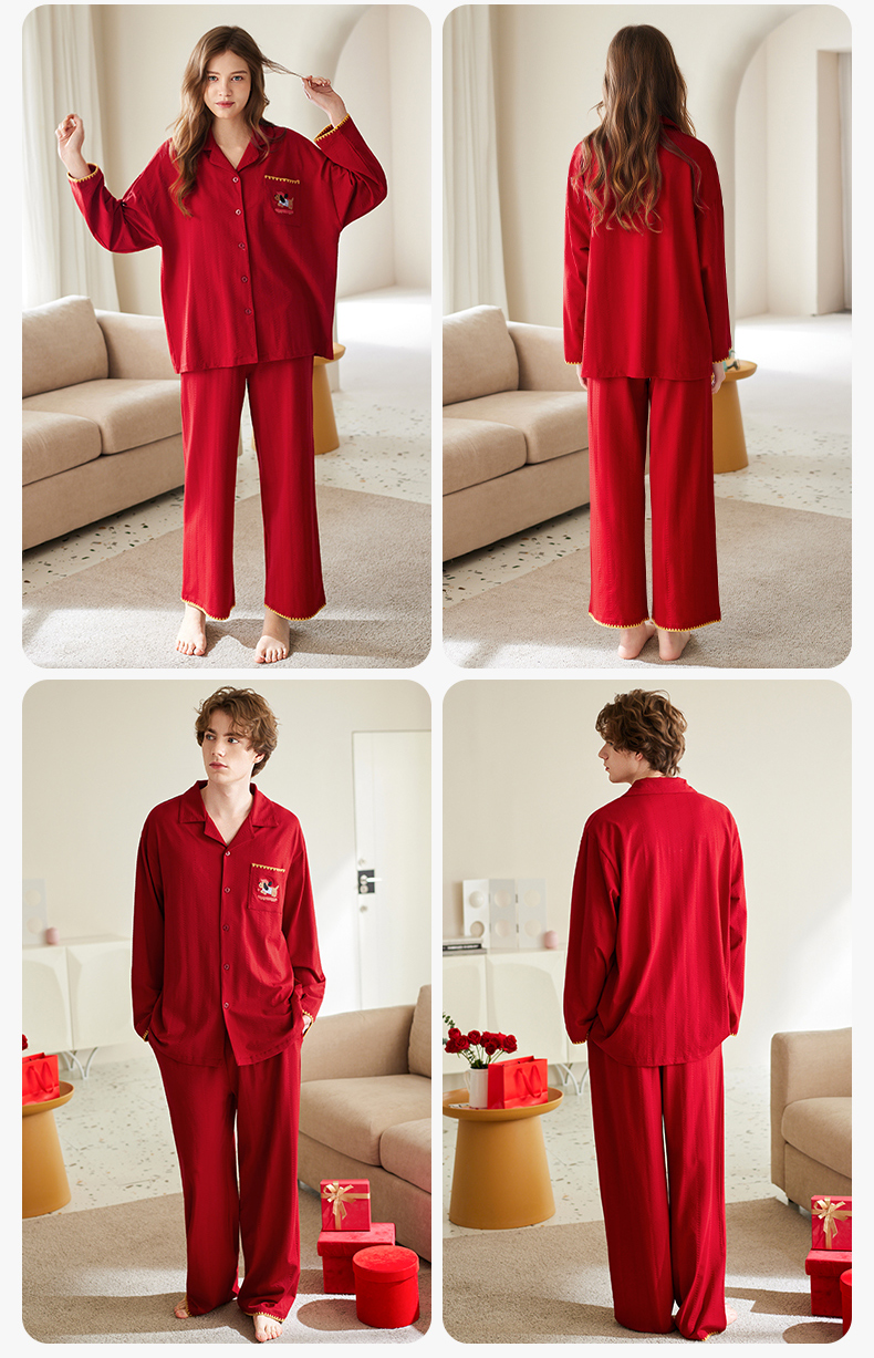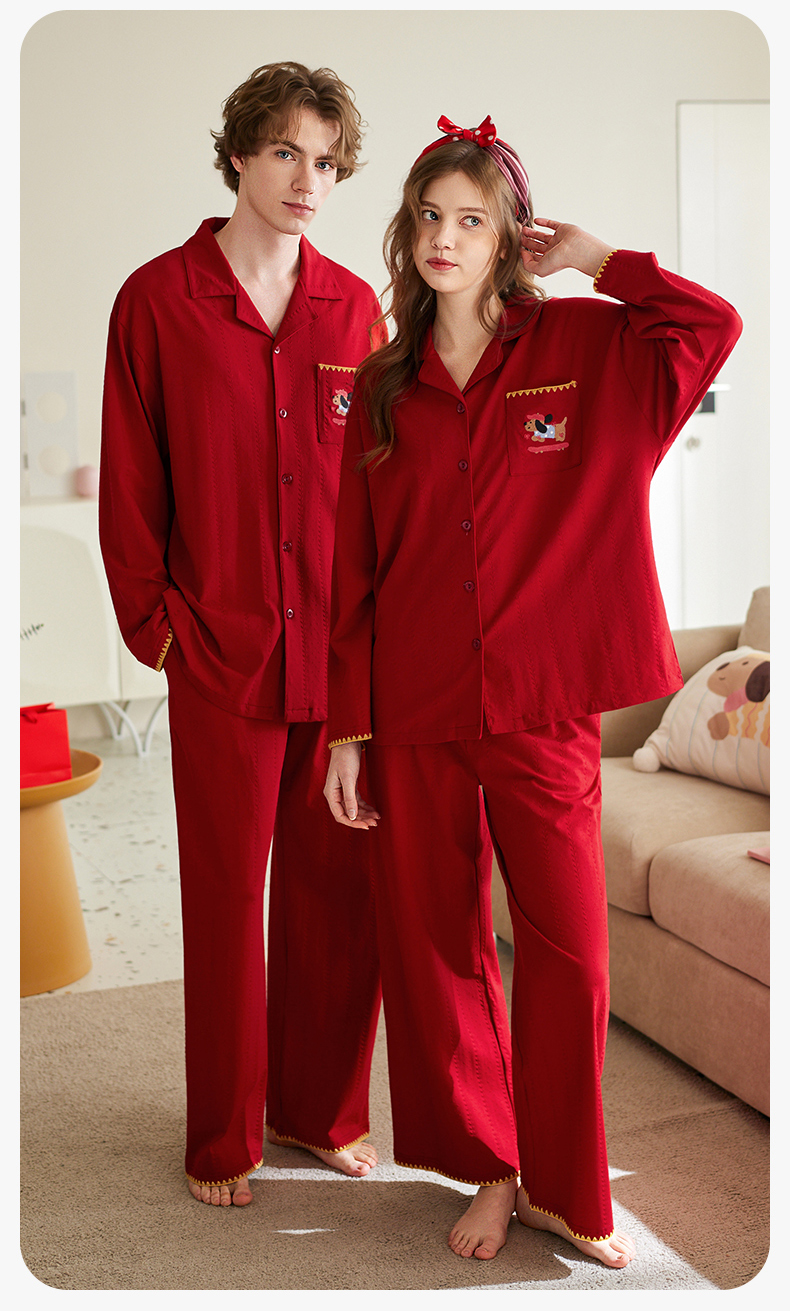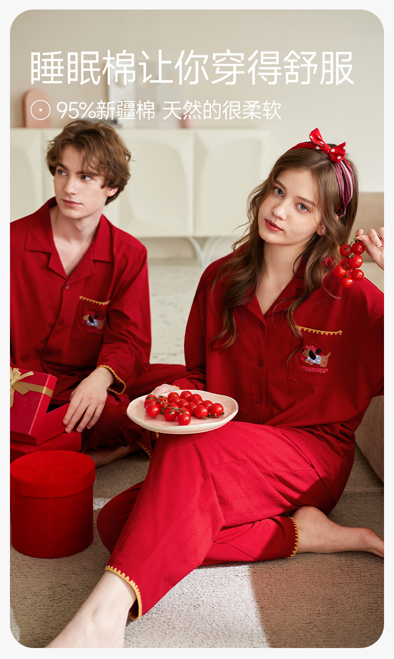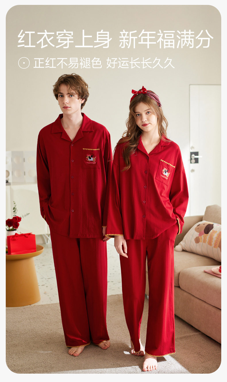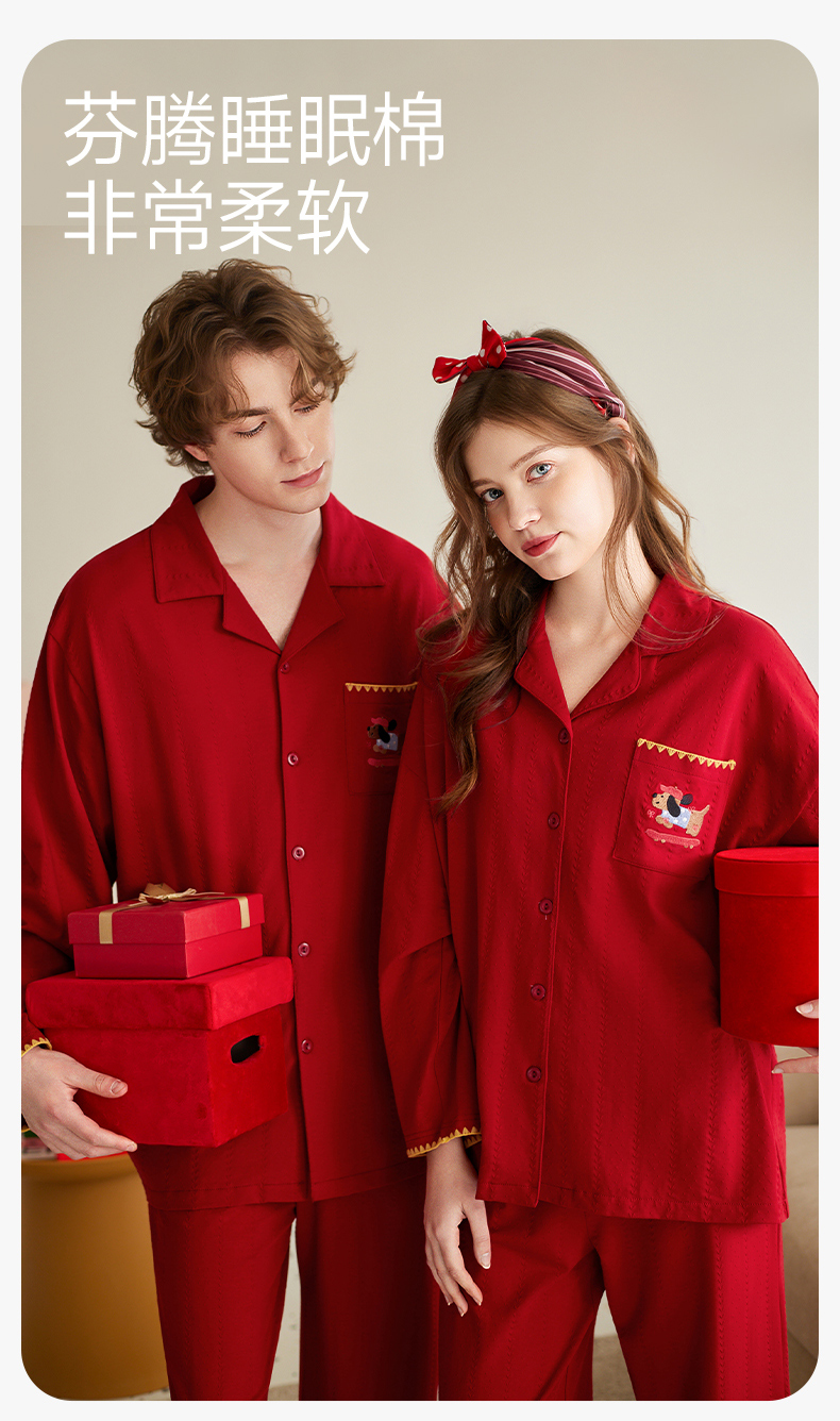 【品牌直发 换季焕新】芬腾情侣睡衣春秋季纯棉长袖套装红色本命年结婚喜庆男女士家居服