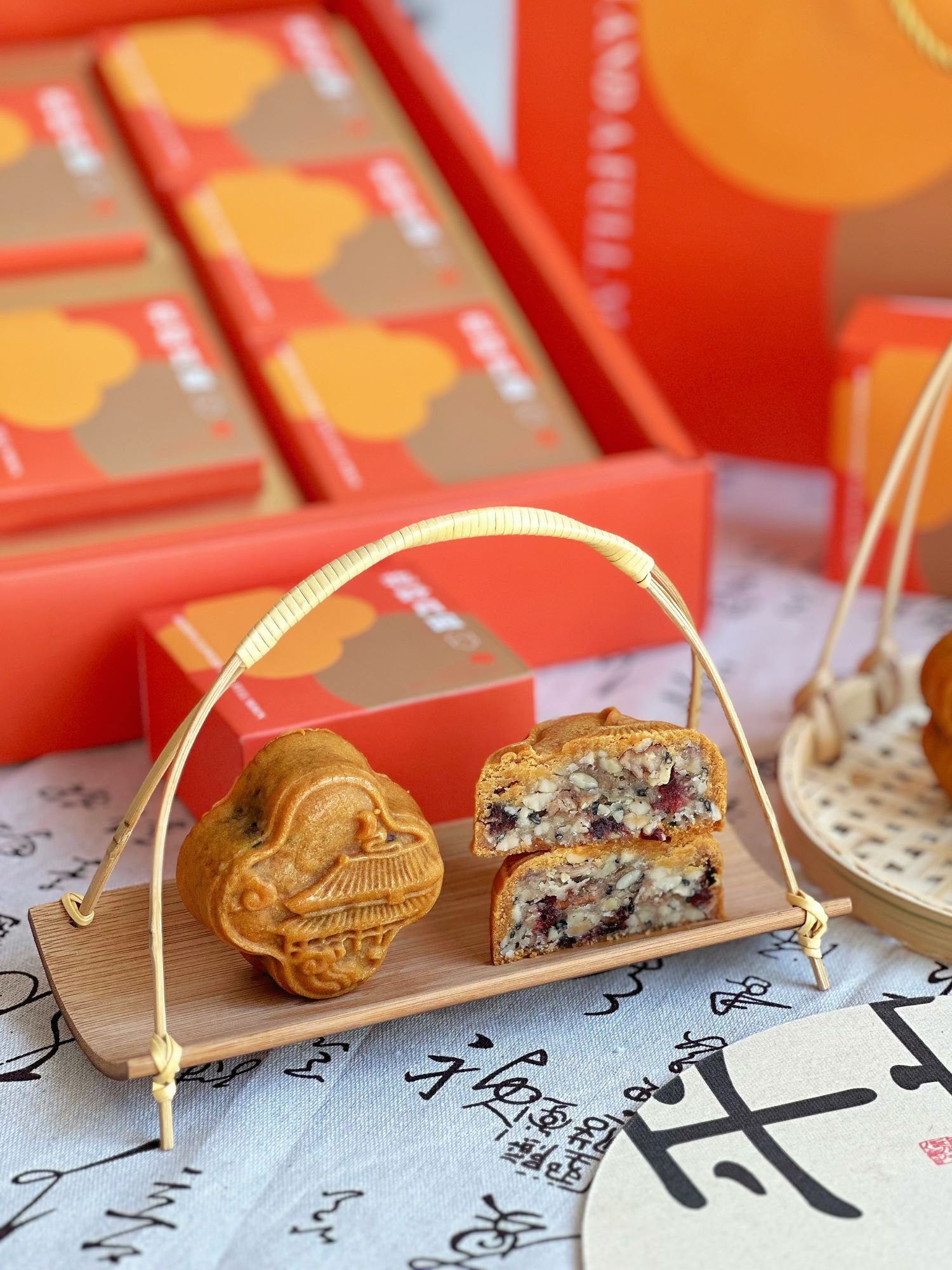 加入榛子,杏仁,碧根果,黑芝麻,南瓜籽,腰果,蔓越莓满满7种果仁,选用价格高于普通果仁十倍的高级品质坚果,胡姬花花生油,金龙鱼玉米油,金龙鱼麦心粉等优质食材,呈现高品质的好月饼