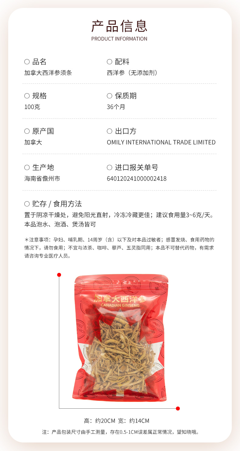 自营(森元)-欧美丽 加拿大进口西洋参须条100克袋装