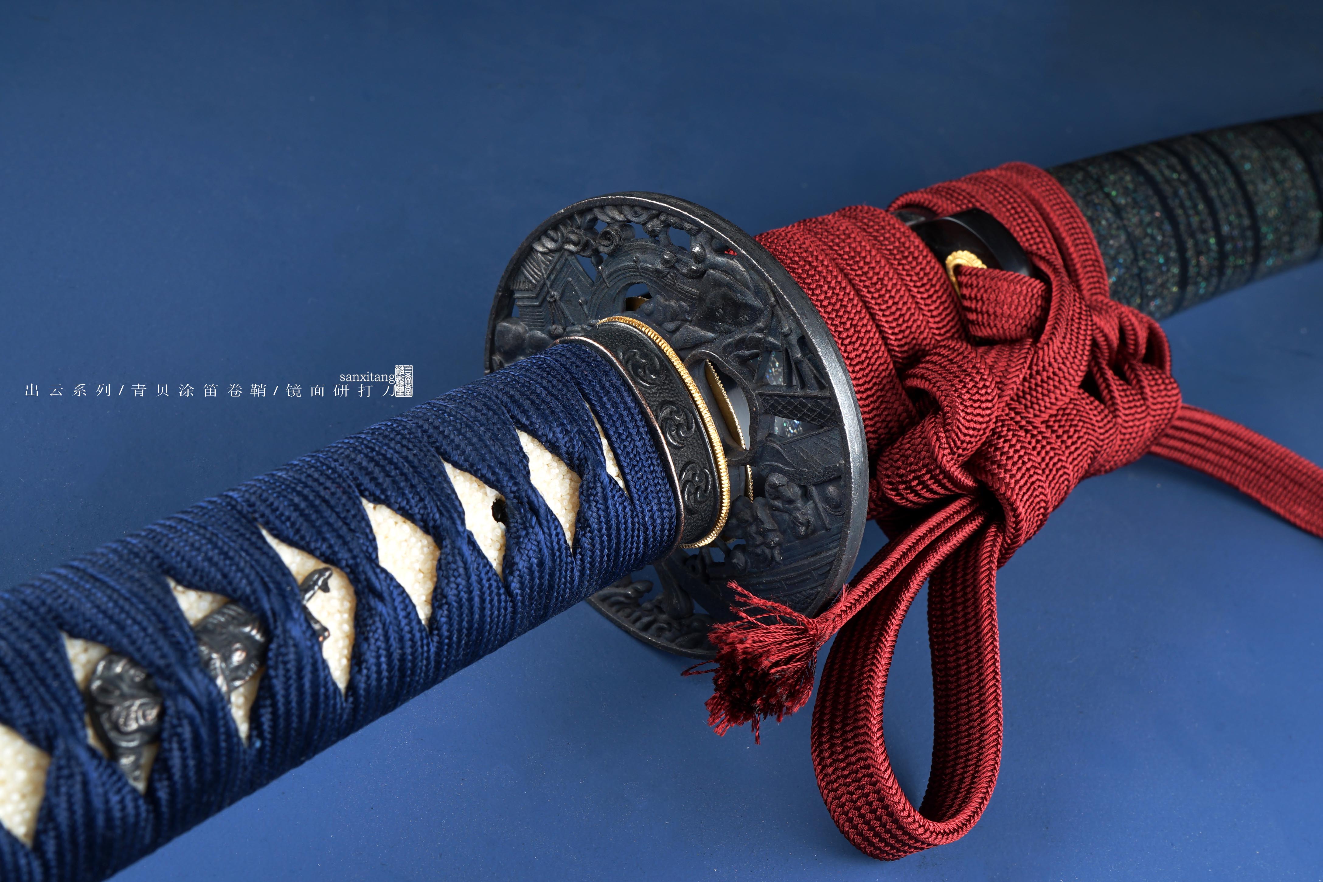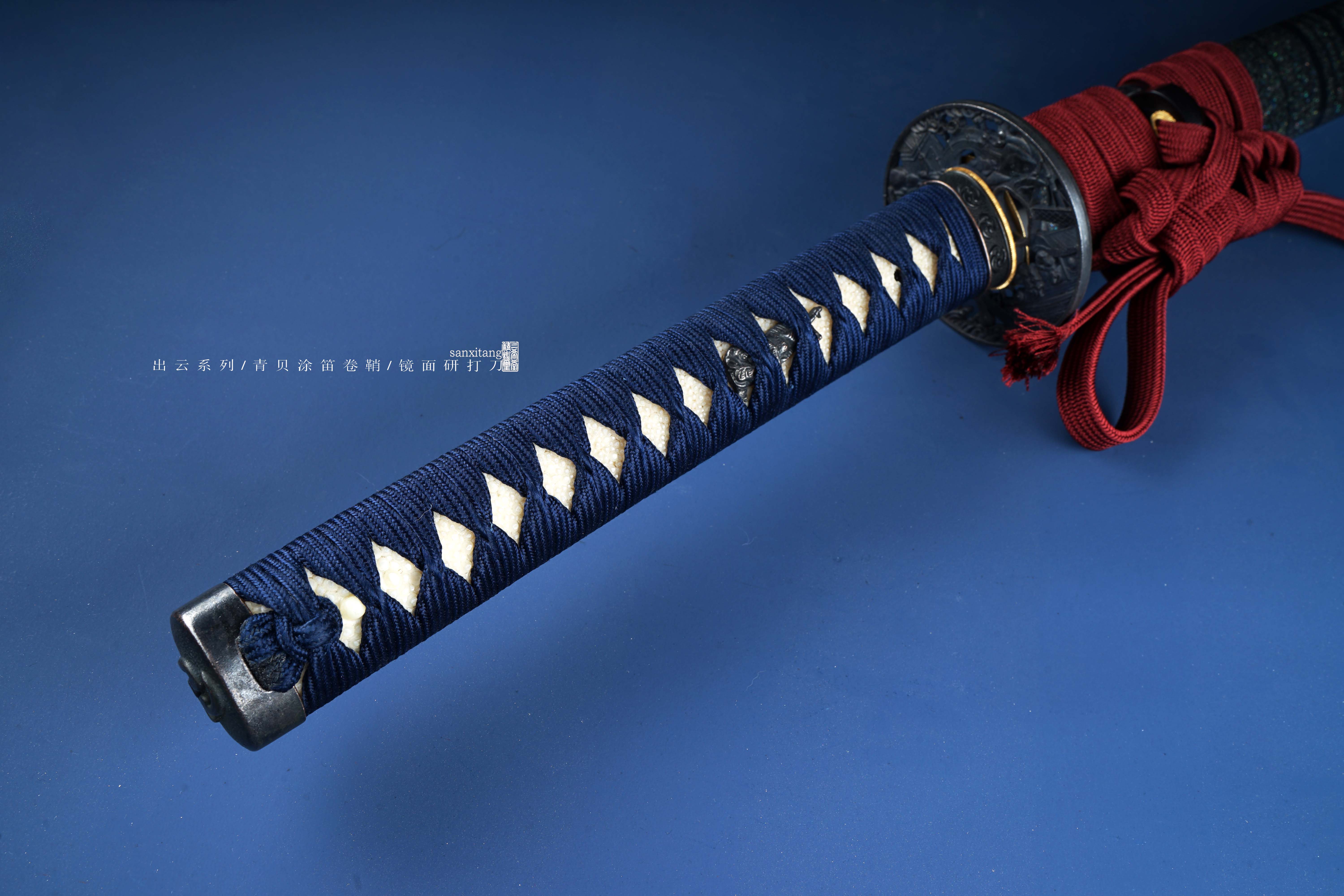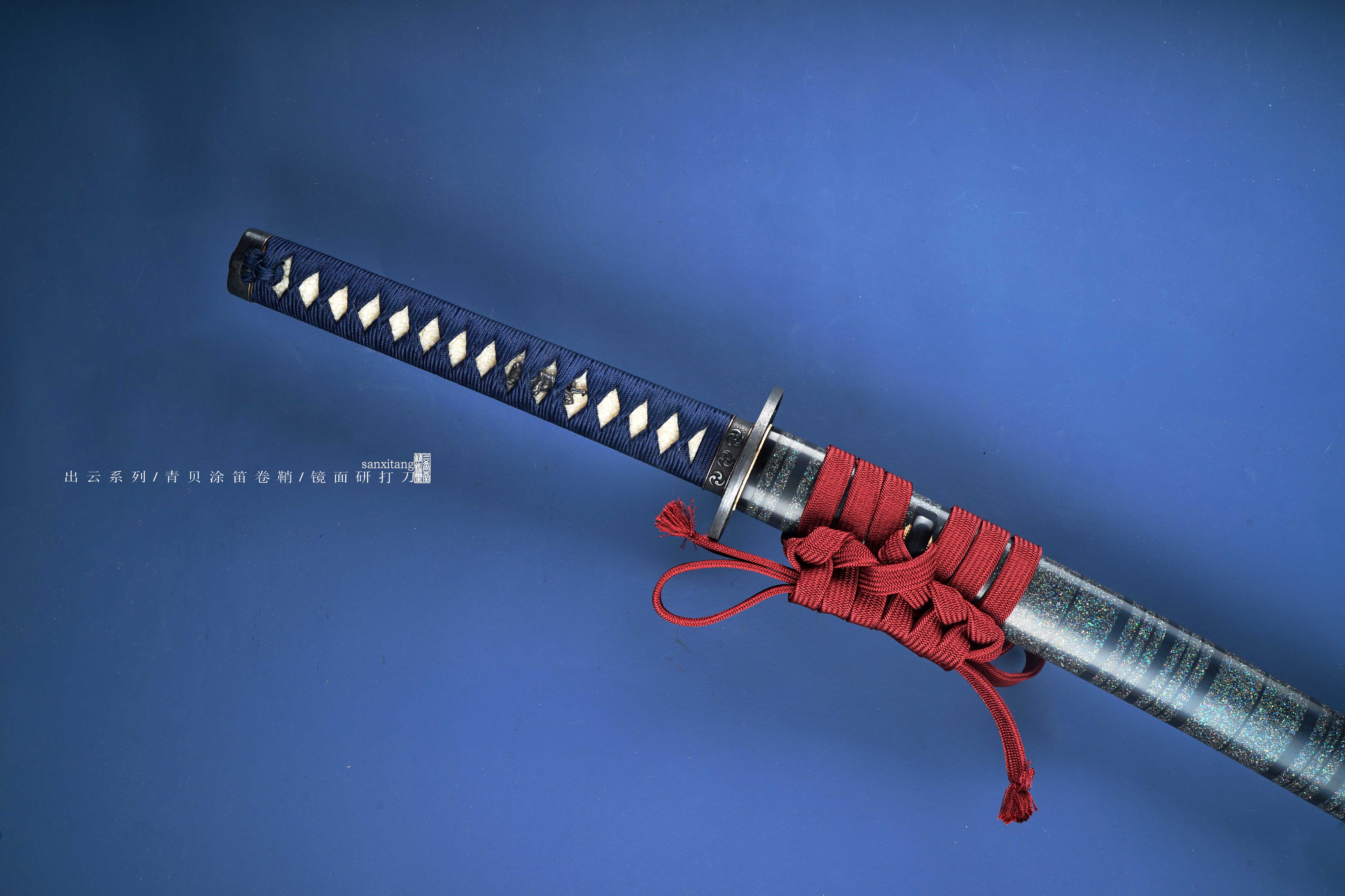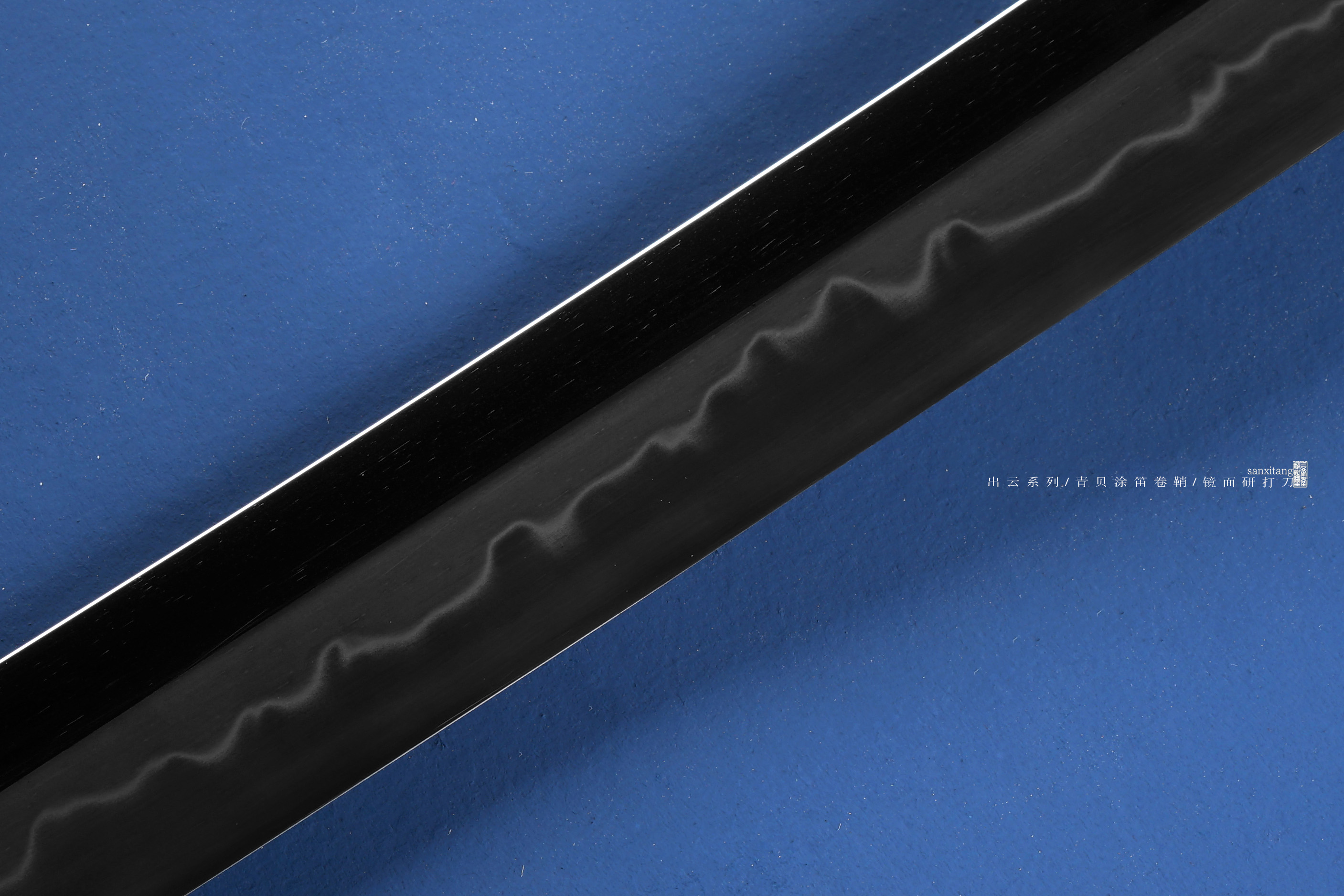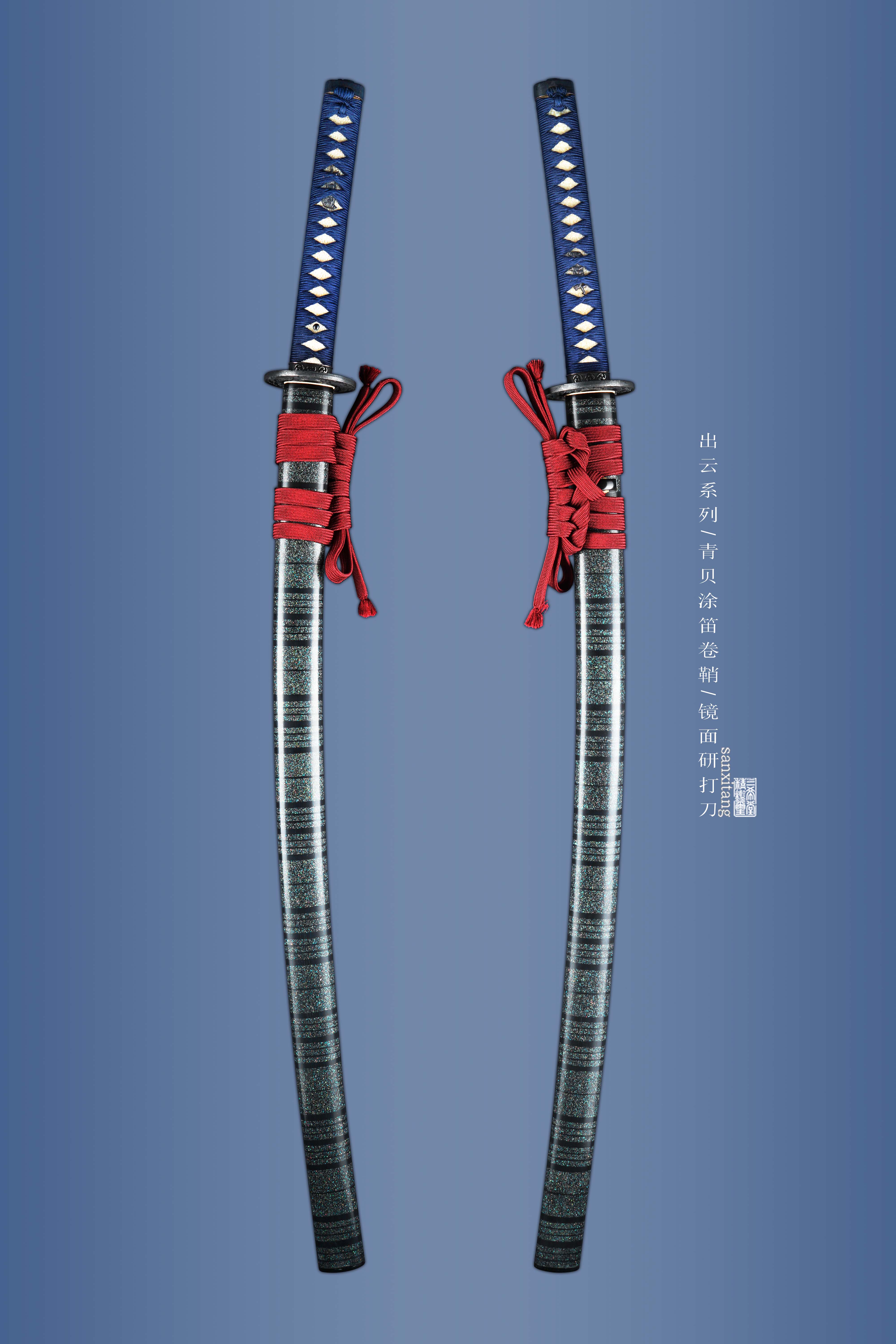新做的全手工作品 所有配件都是一比一制作的 我们正式开始给大家定制日本刀 这只是12800的作品 和普通版本区别在于刀条烧刃研磨会更好一些 鞘是一比一定制的 漆也复杂一些 我们自己锻打的8000余层高碳钢 传统方法覆土烧刃 刀的弧度是淬火的时候自然形成的 手工用各种磨刀石一道一道磨出来的 点线面清晰分明 线条挺拔立体 三色明显 表面柔顺细腻 柄和鞘不再像入门级别的一样是通用鞘了 都是全手工根据刀条一比一制作的 贴合度可以说是完美 镶天然牛角型制还原日式味道 这一步的成本能买一把入门级别的刀了 日本进口添丝柄卷+大颗粒珍珠鱼皮 手工缠绳 质感相当不错 传统天然大漆鞘 青贝涂笛卷鞘 这是日本一个非常经典的漆艺 层次感和艺术感都很不错 这只作品可以说是现代美学和传统工艺的完美结合 我自己很满意的一把好刀 非常感谢各位支持 这只作品大家自己玩或者送礼都相当合适!!