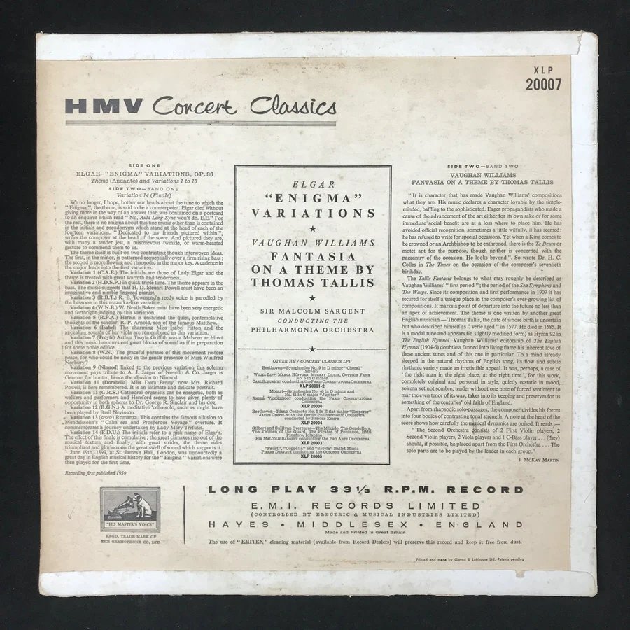 LP黑胶唱片 埃尔加《谜语变奏曲》 沃恩·威廉斯《泰利斯主题幻想曲》 英国爱乐乐团 马尔科姆·萨金特指挥厂牌:His Master's Voice