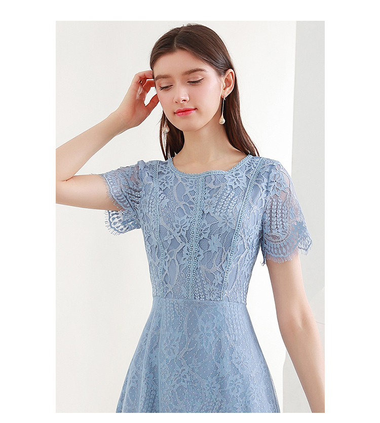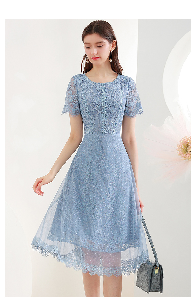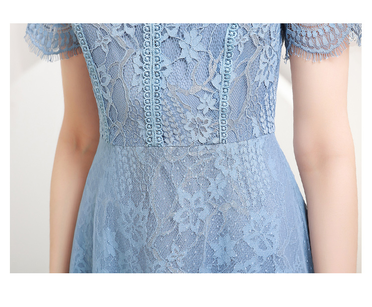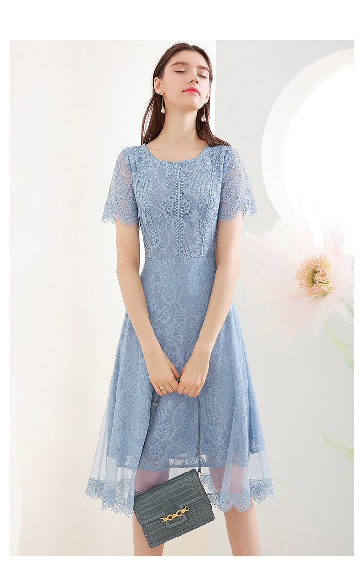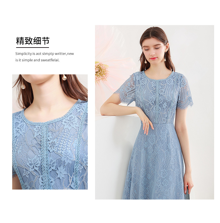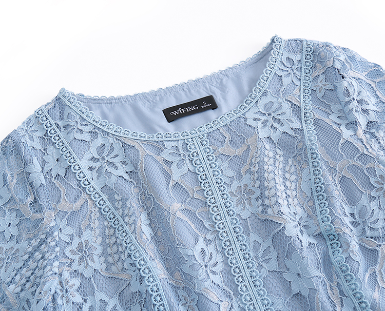 产品说明: 蕾丝网纱拼接面料、花边圆领、流苏蕾丝边、右侧拉链、有里料