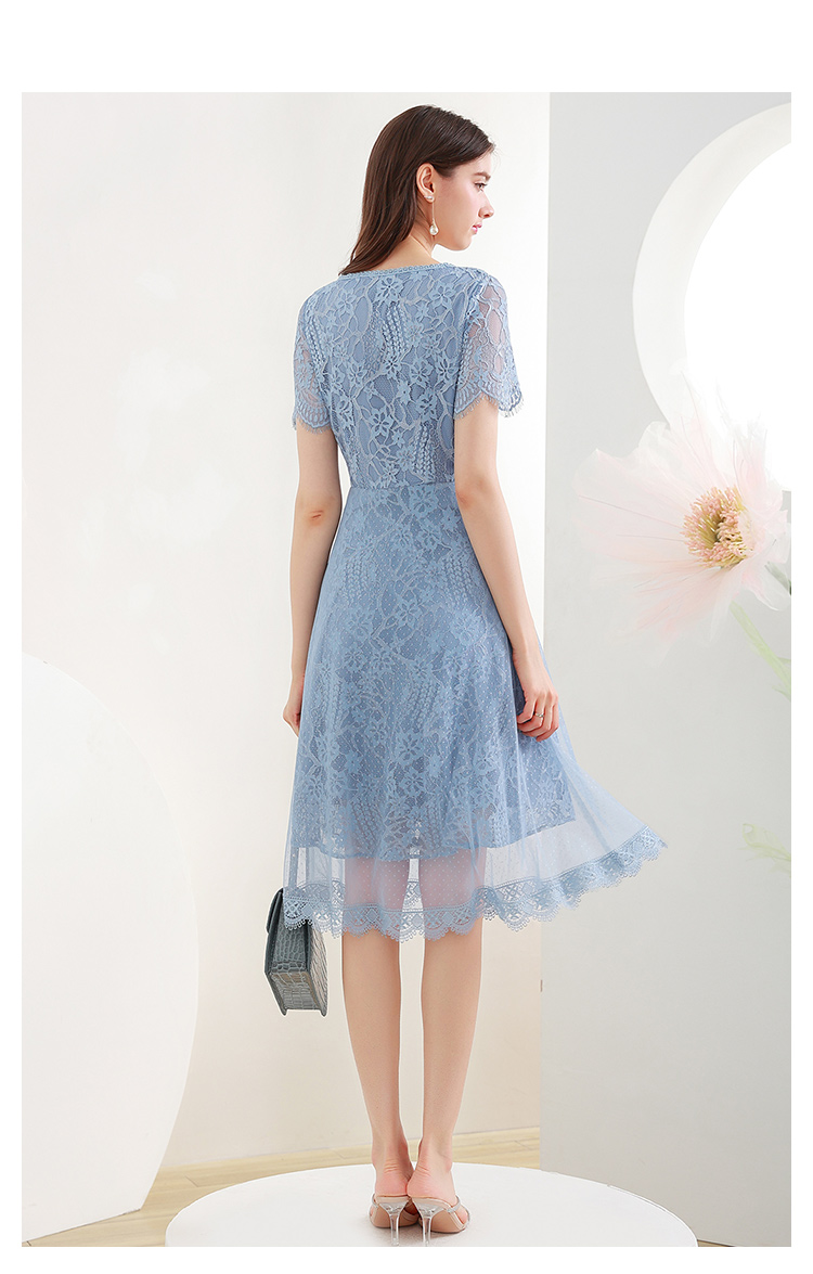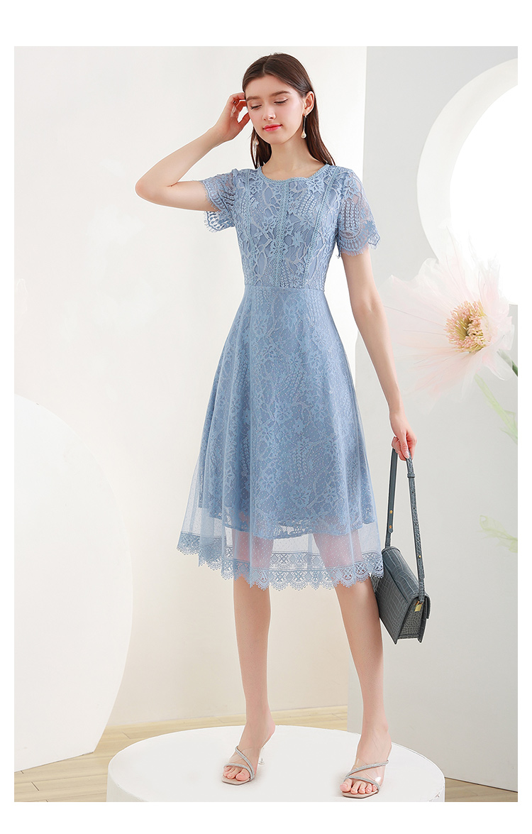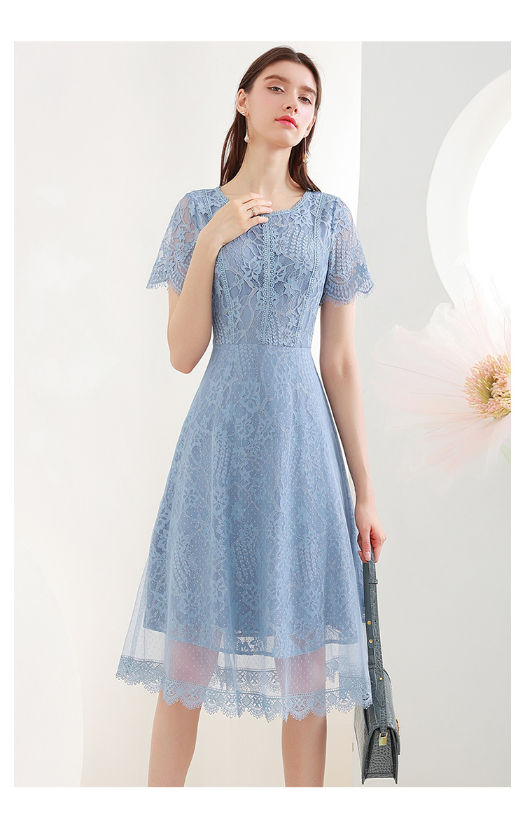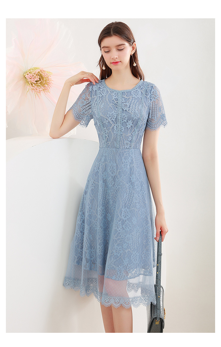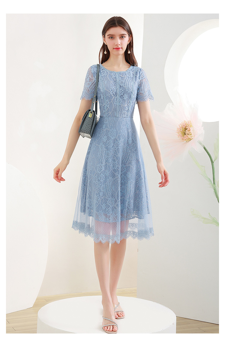 产品说明: 蕾丝网纱拼接面料、花边圆领、流苏蕾丝边、右侧拉链、有里料