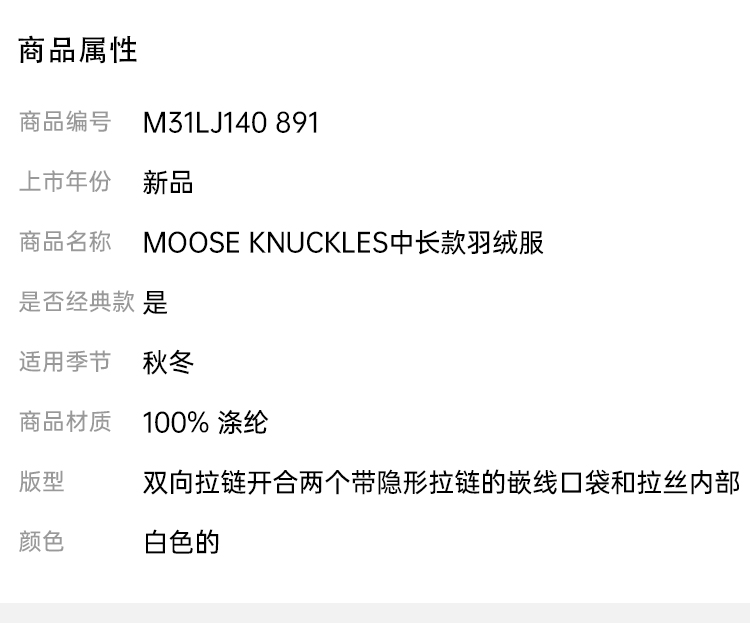 MOOSE KNUCKLES 中长款带帽无毛领 女士羽绒服 白色 M31LJ140 891