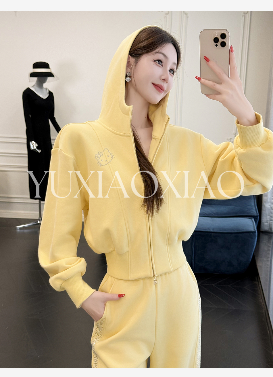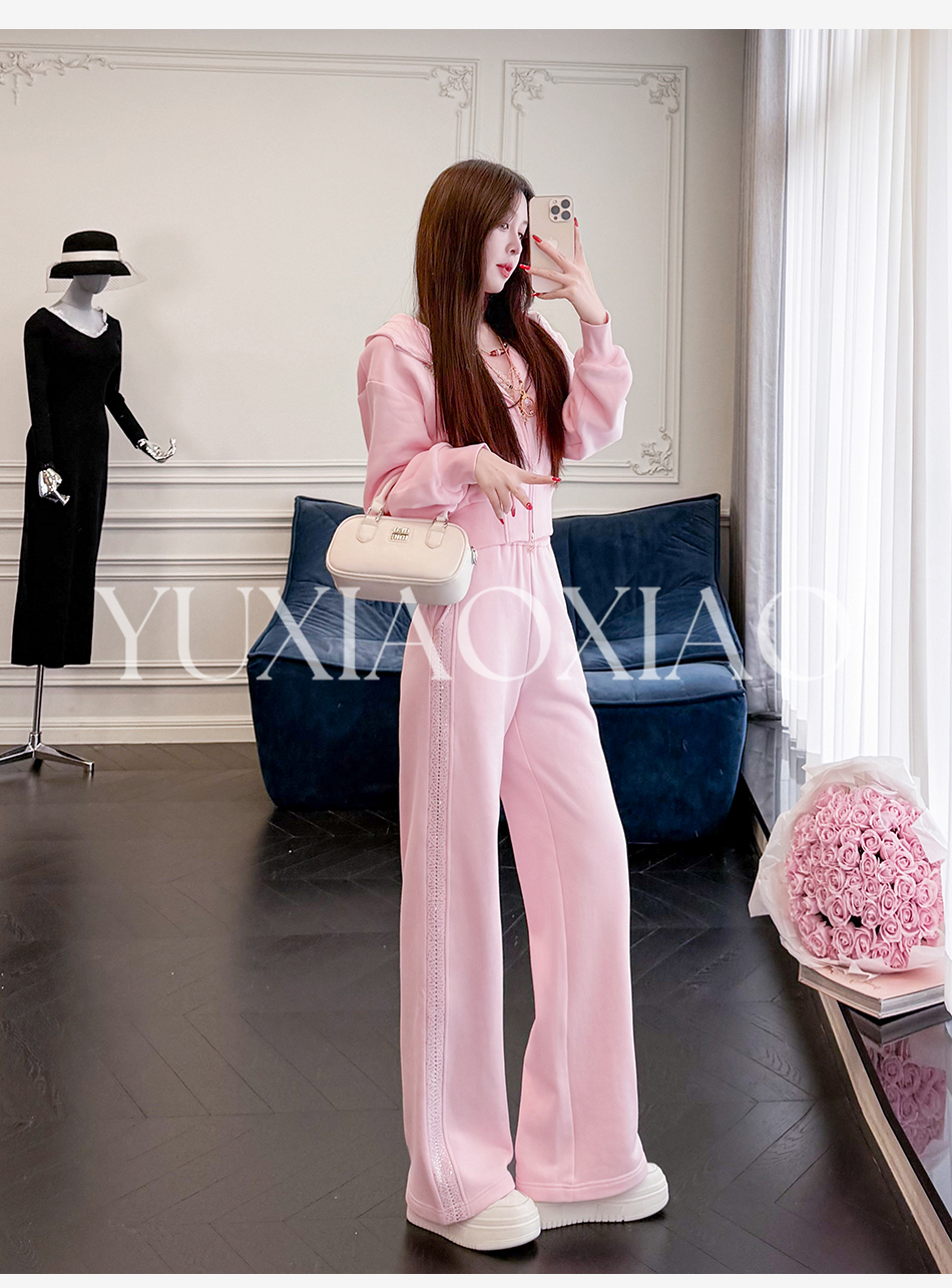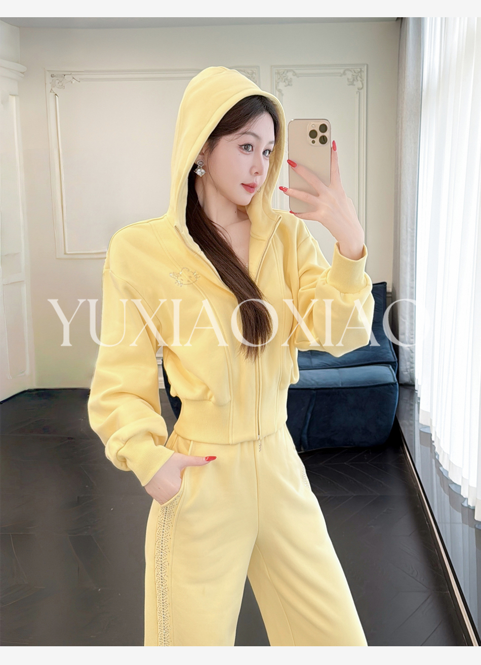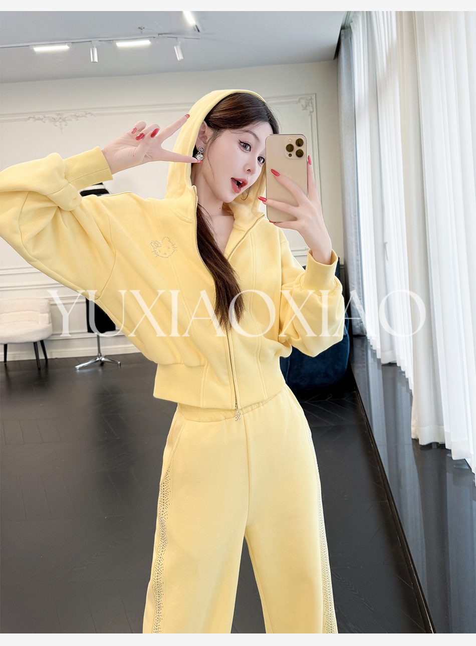 余潇潇【猫咪派对】加绒连帽双拉链卫衣外套&高腰阔腿裤运动套装