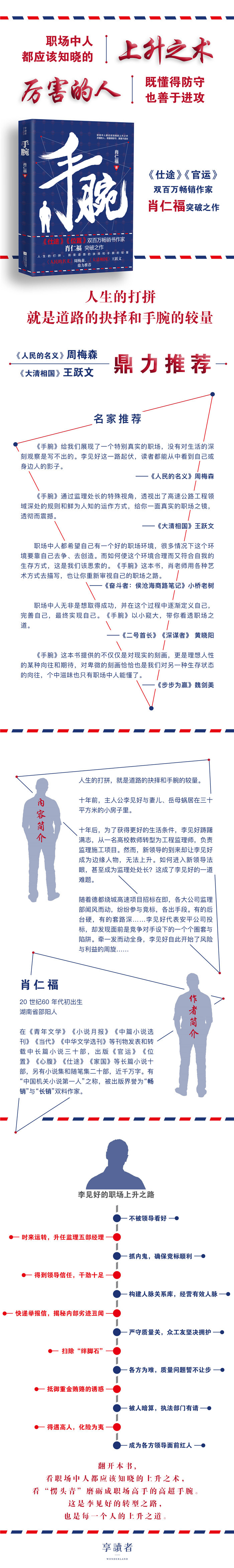 5.职场人士必读,《手腕》的故事就是每一个职场奋斗者的写照,看“愣头青”磨砺成职场高手的职场上升之路。读《手腕》只需一天,职场智慧却可受益终生。