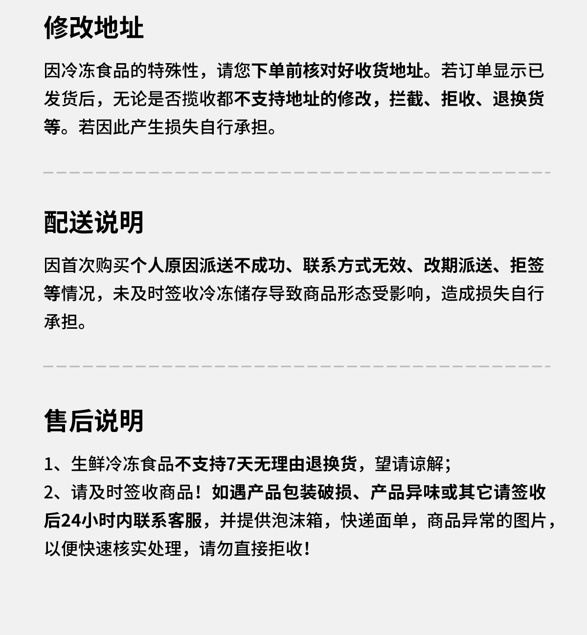 1、生鲜冷冻食品不支持7天无理由退换货,望请谅解