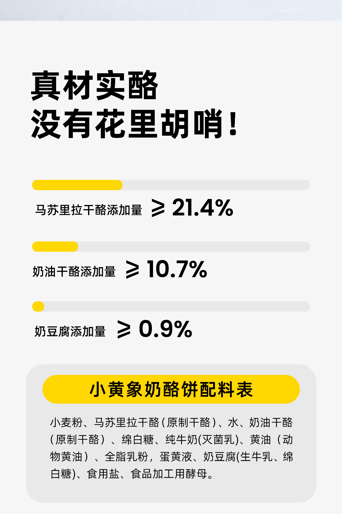 因为是要做给小朋友吃的奶酪饼,所以小黄象这款奶酪饼中,用到的三种奶酪以及其他配料,都是很叫人安心的。