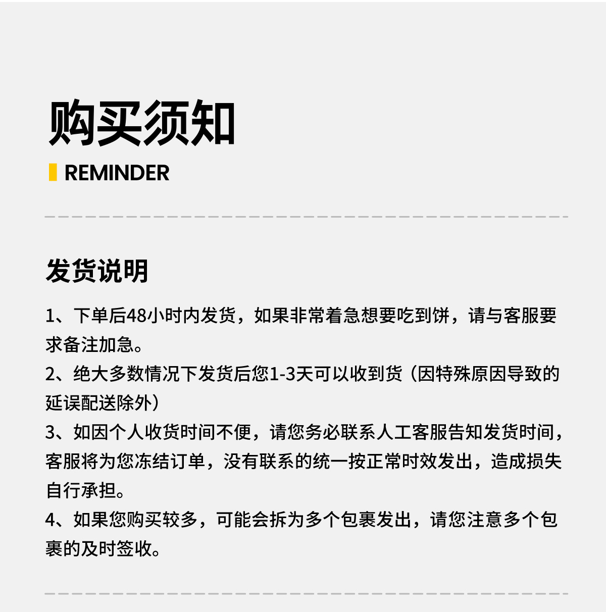 6、如因个人收货时间不便,请您务必联系人工客服告知发货时间,客服将为您冻结订单,没有联系的统一按正常时效发出,造成损失自行承担