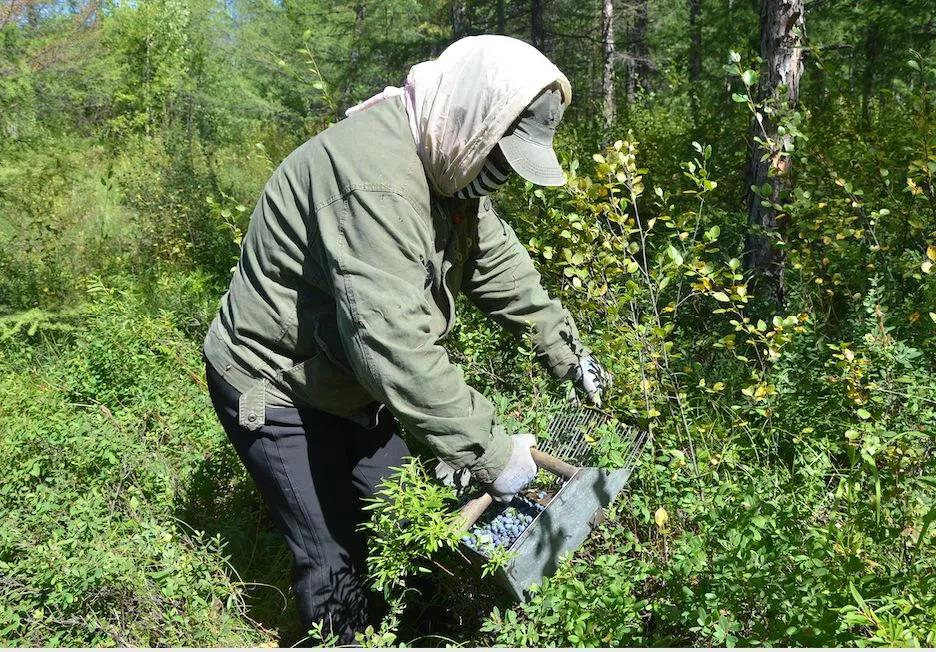 野生蓝莓成熟后,当地的农民会拿着专有采摘工具,进到大森林里去采蓝莓。