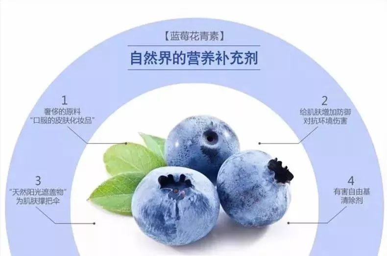 蓝莓中含有丰富的花青素,这是当今人类发现最有效的抗氧化剂,有助于抗自由基、延缓衰老、强化视力,被称为“抗氧化之王”。它的抗氧化性能比维生素E高出五十倍,比维生素C高出二十倍。因此蓝莓被称为“水果皇后”和“浆果之王”,是世界粮农组织推荐的五大健康水果之一。花青素还能保护血管弹性,降低血糖和胆固醇。