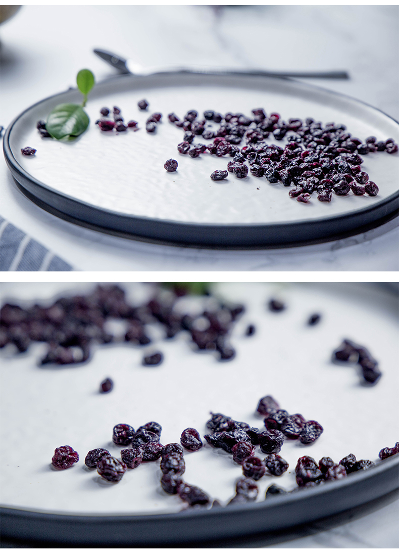 这样制成的野生蓝莓干颜色呈紫黑色,个头虽小但是颗颗饱满。每4斤野生蓝莓,才能制作出1斤蓝莓干。