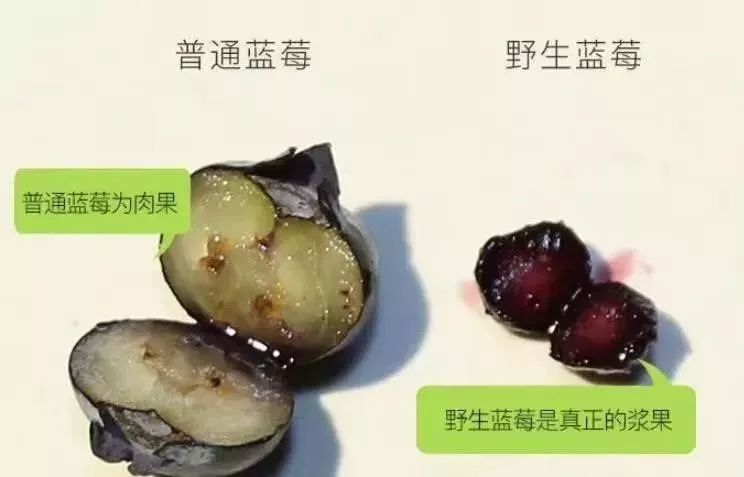 我们平常吃到的新鲜蓝莓都是人工种植蓝莓,肉厚皮薄,是肉果。而真正营养丰富的野生蓝莓果皮较厚,果肉大部分是果汁,是浆果。