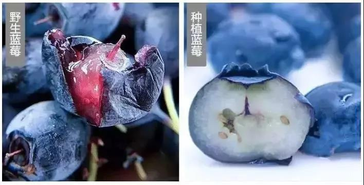 大家看看两种果实的对比就会明白为什么野生蓝莓的花青素含量比普通蓝莓更高,花青素是一种天然色素,颜色越深,花青素含量越丰富,野生蓝莓的果皮和果汁颜色比普通蓝莓要高得多。
