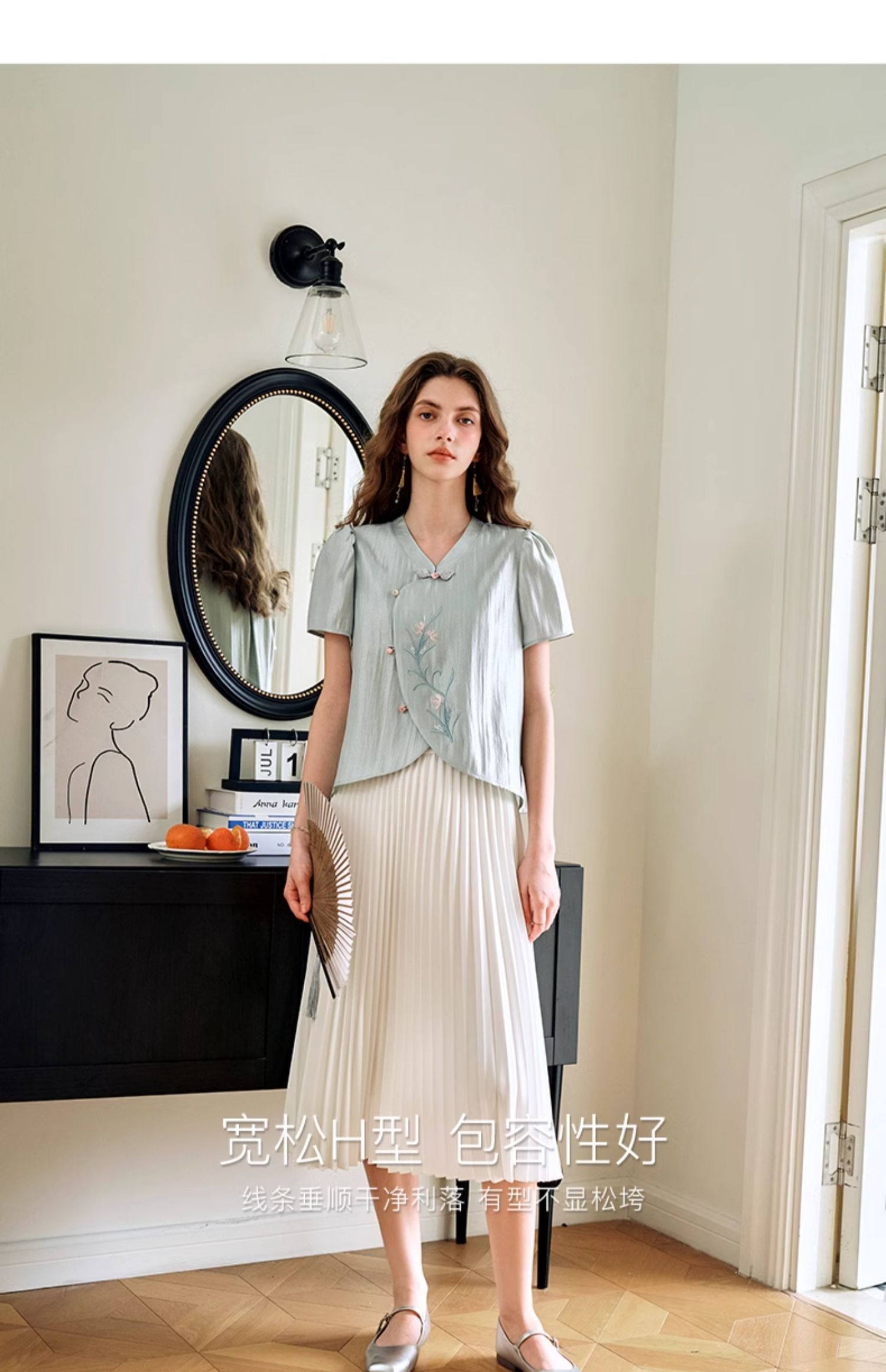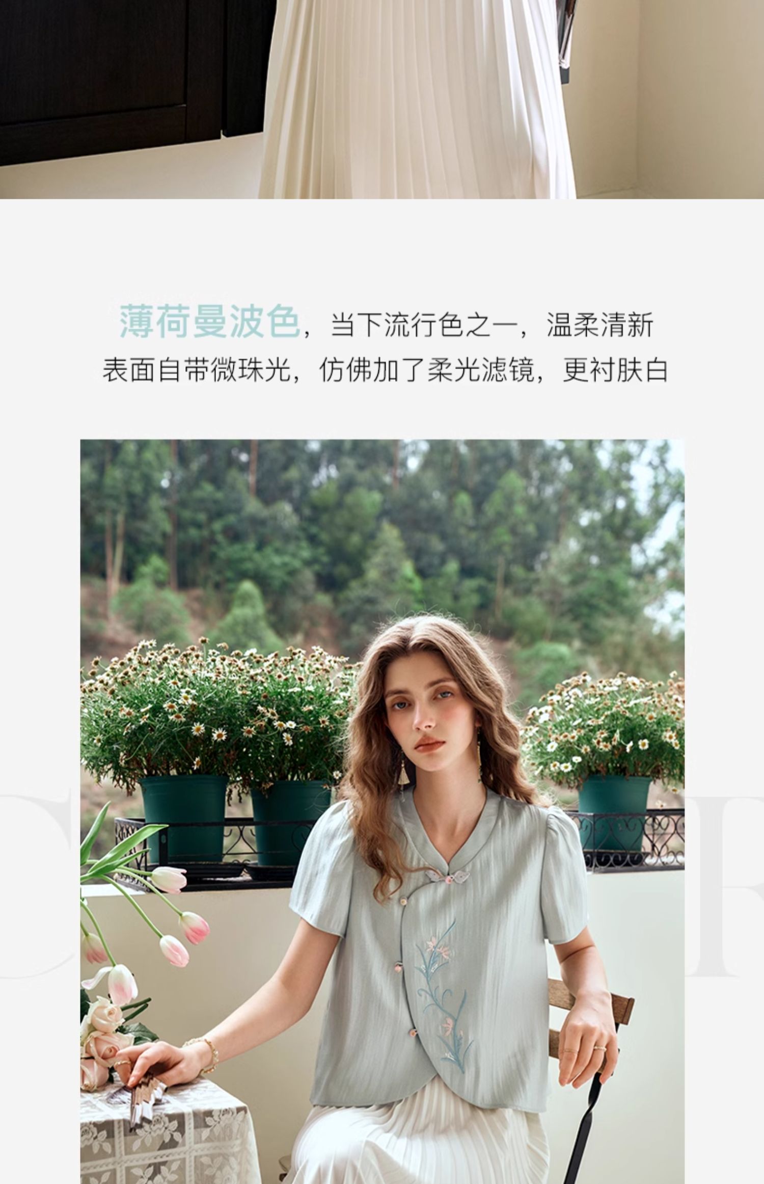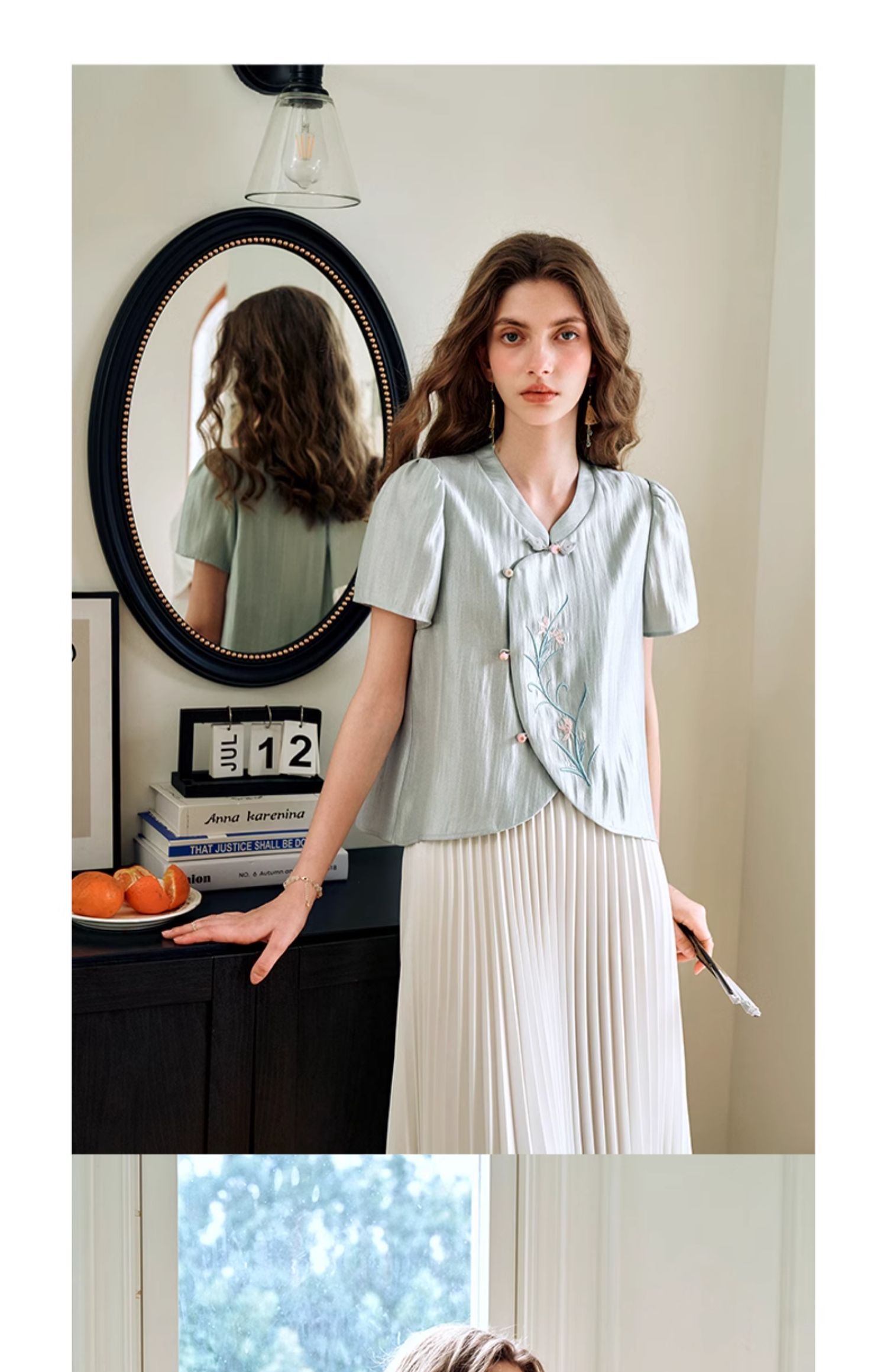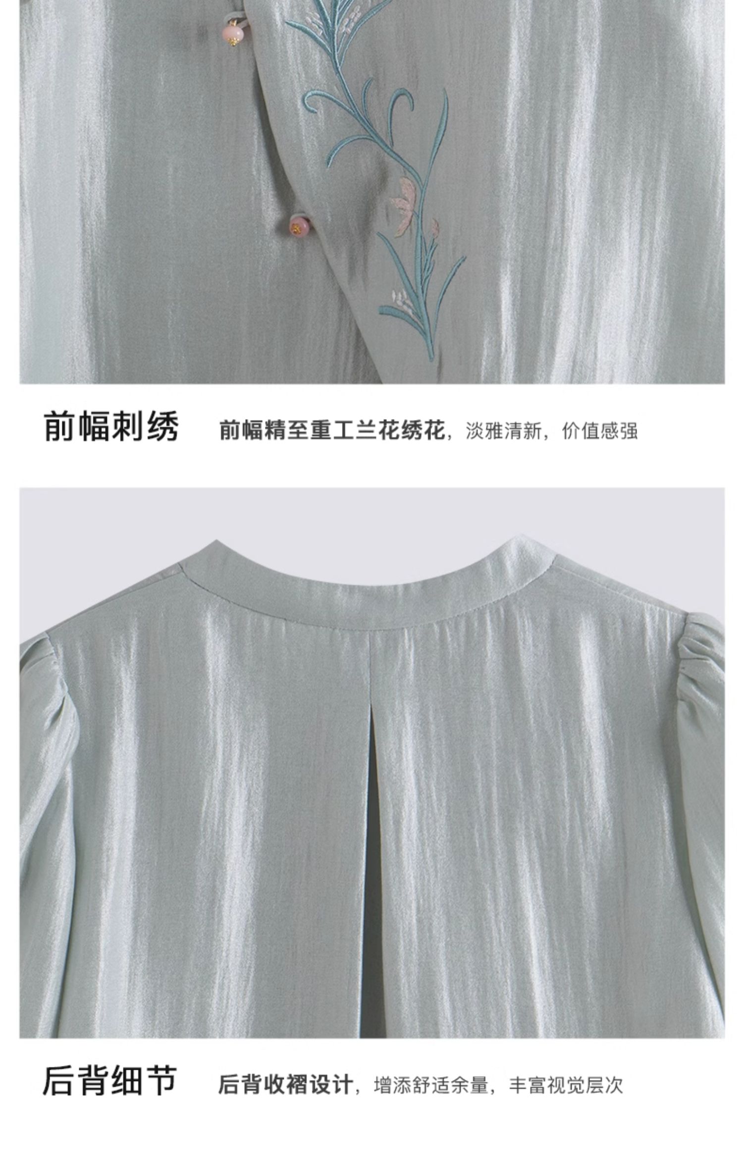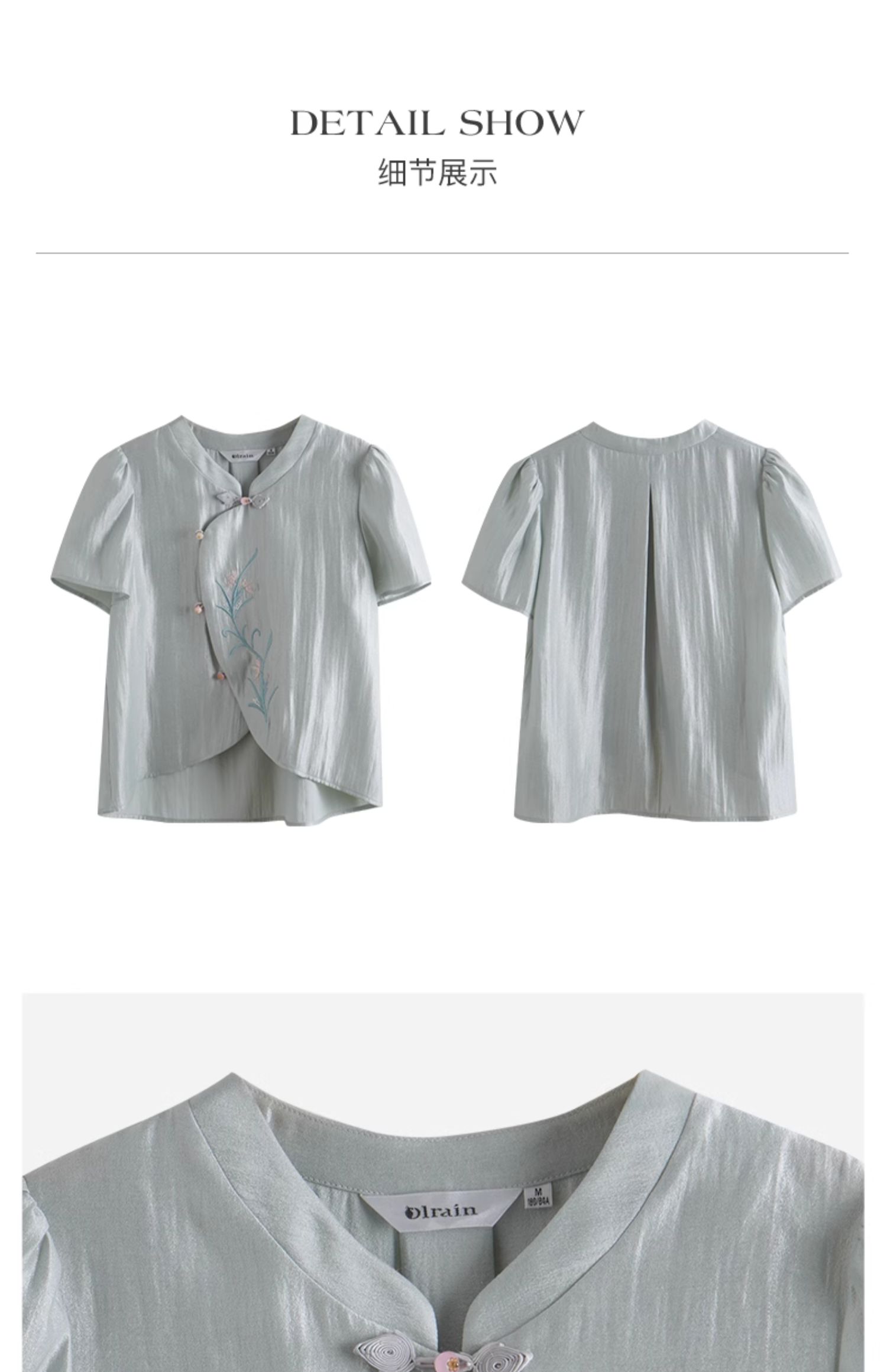 OLrain欧芮儿新中式国风上衣女夏季新款薄荷曼波色雪纺衫绣花衬衫