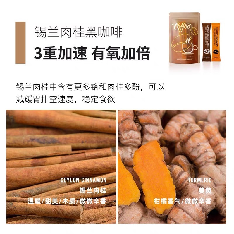 ▶超级“双燃”搭档:黑咖啡&锡兰肉桂&姜黄黑咖啡&绿咖啡(燃卡天敌)一加速燃,以双咖燃脂,双重燃!
