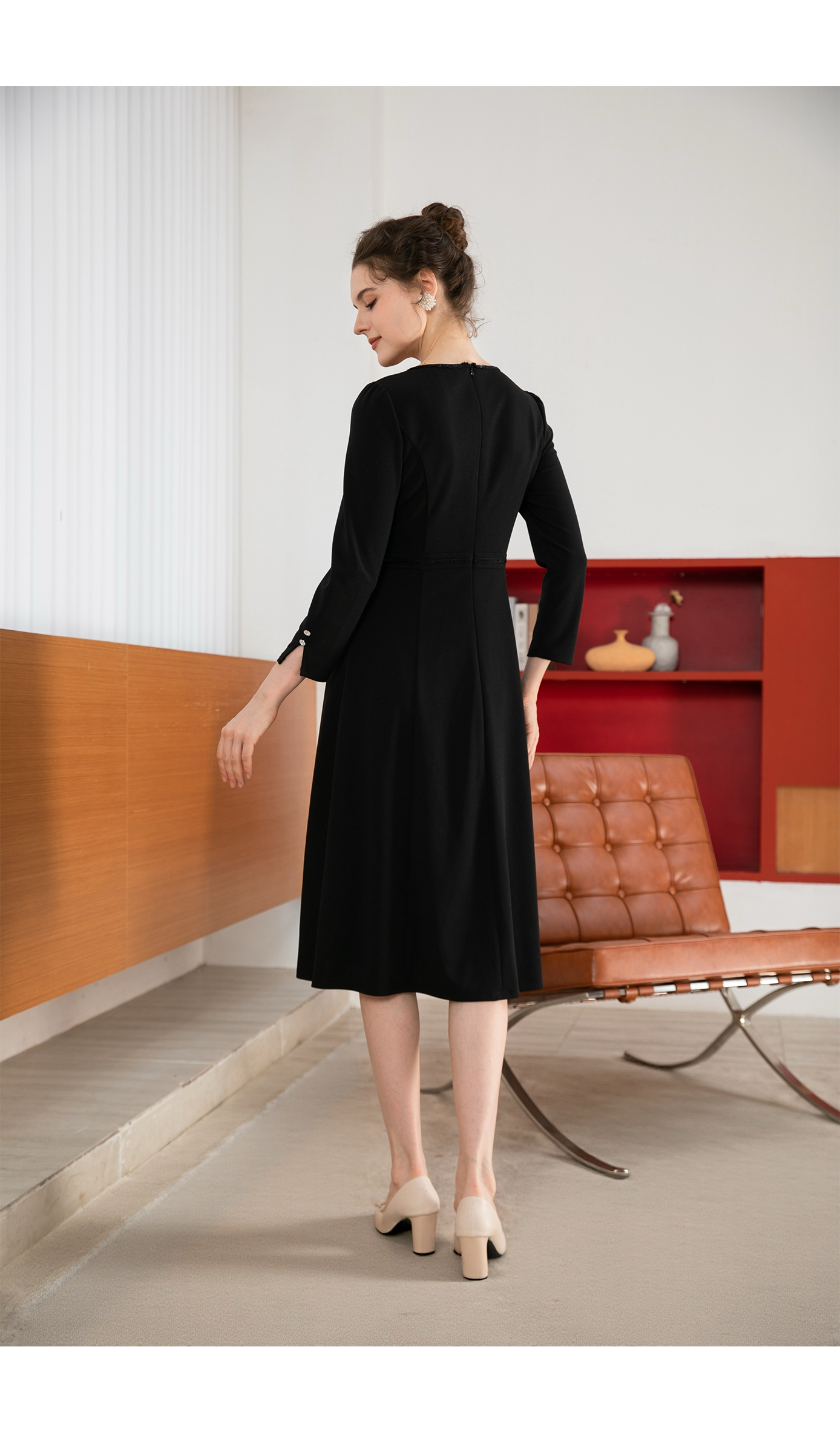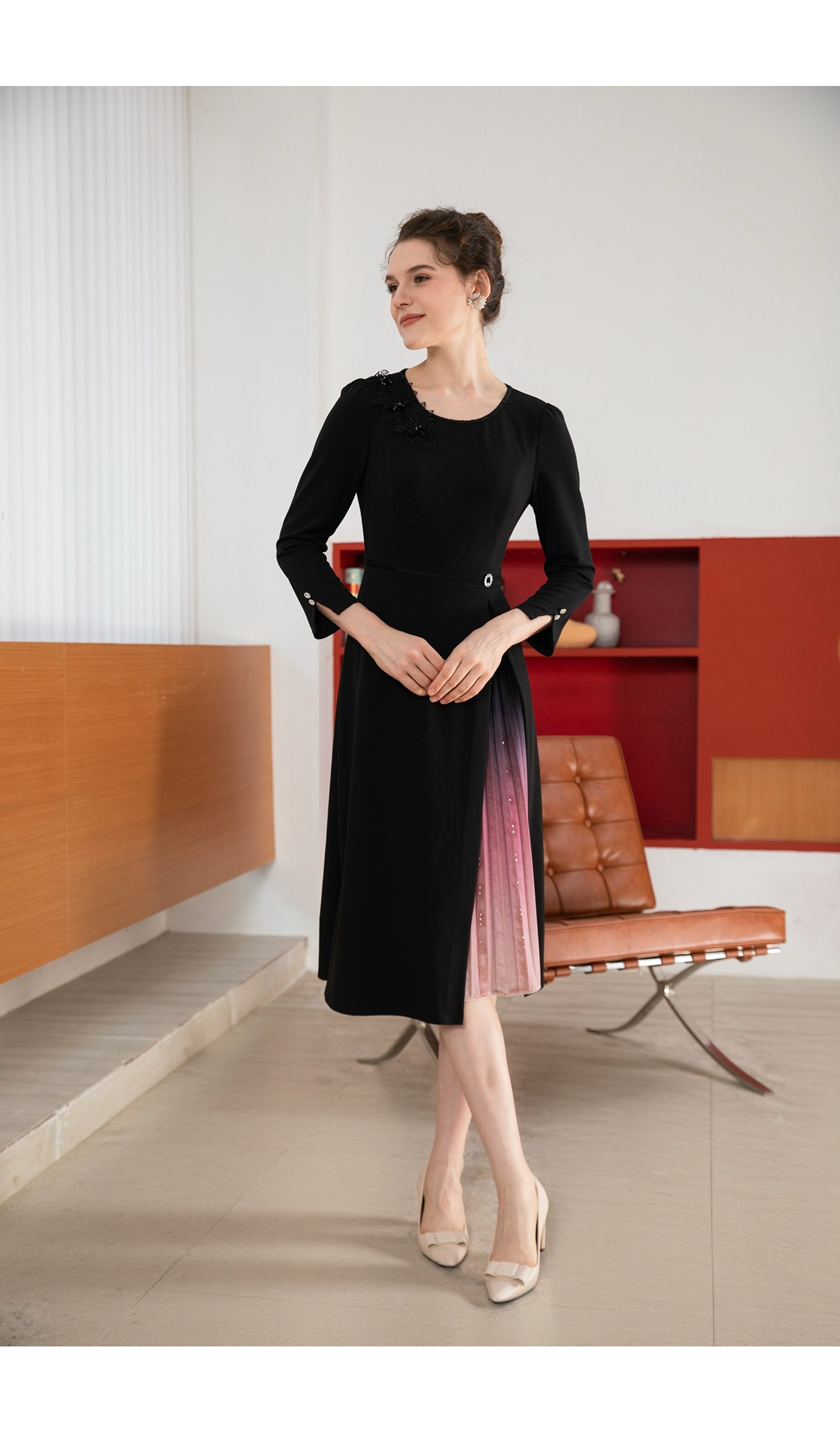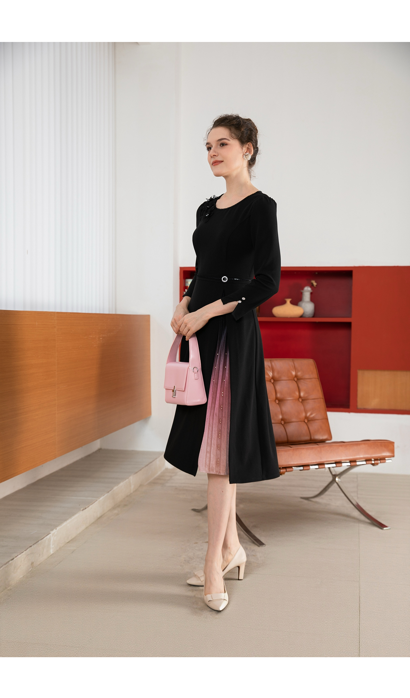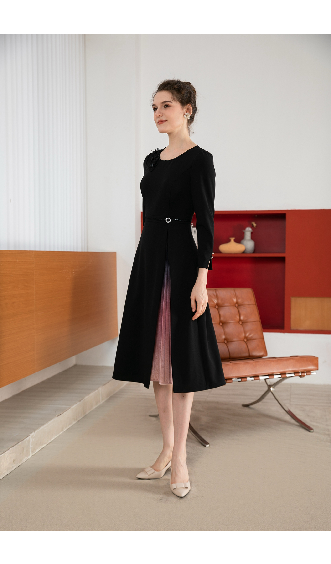 司歌简约拼风琴褶长袖连衣裙修身秋冬A901133X
