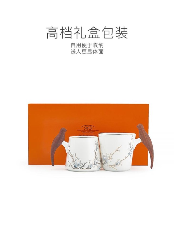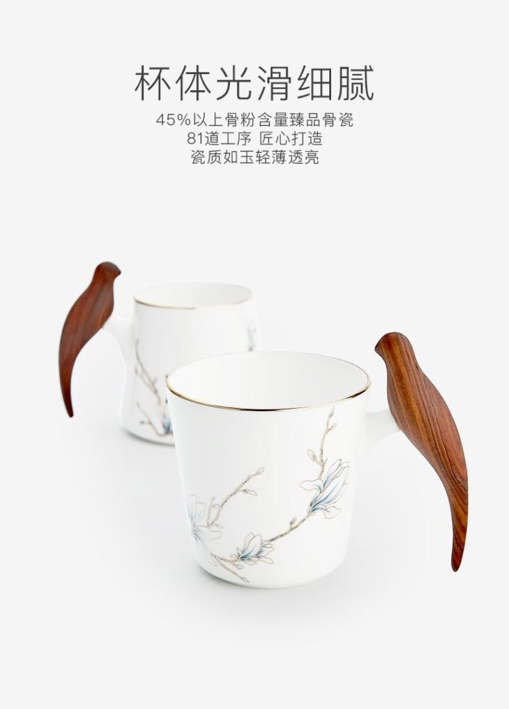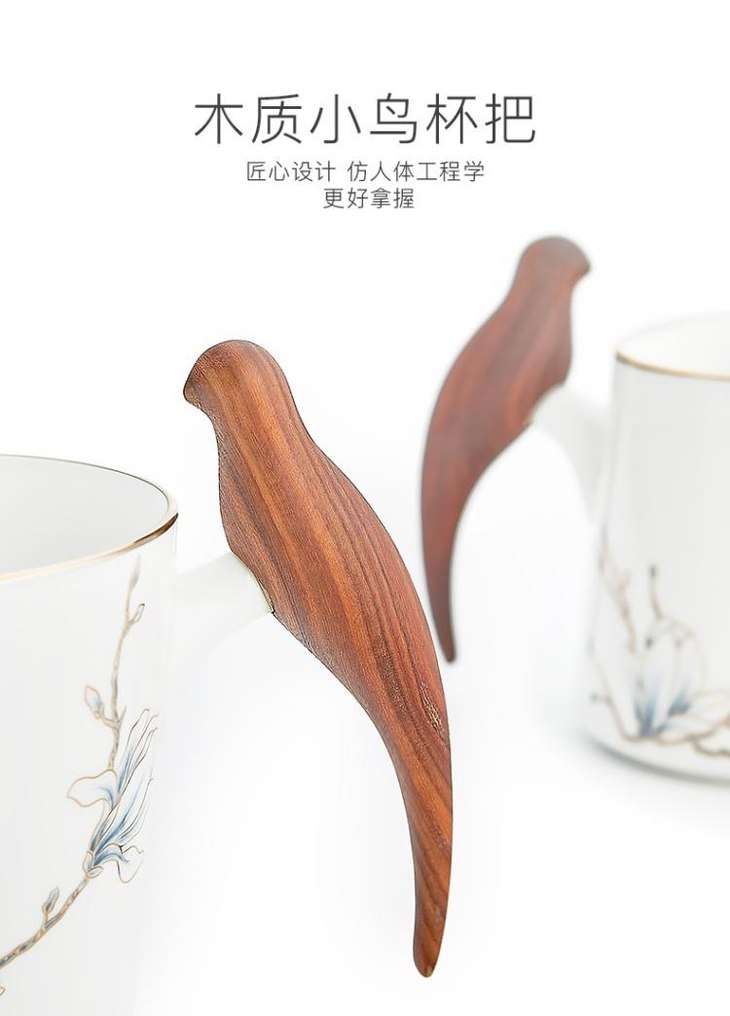 玛戈隆特新品进博盛宴幸福小鸟对杯木把手家用骨瓷情侣对杯礼盒