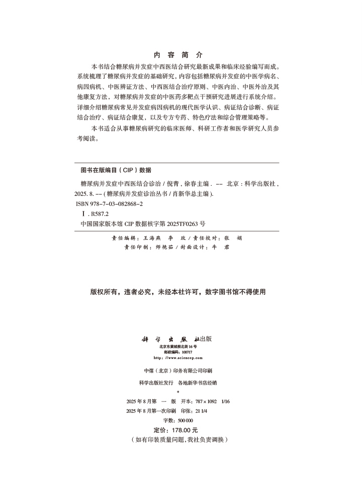 糖尿病并发症中西医结合诊治 糖尿病并发症诊治丛书 倪青 徐春 适合内分泌专科医师 全科医师及医学研究生等参考阅读 科学出版社