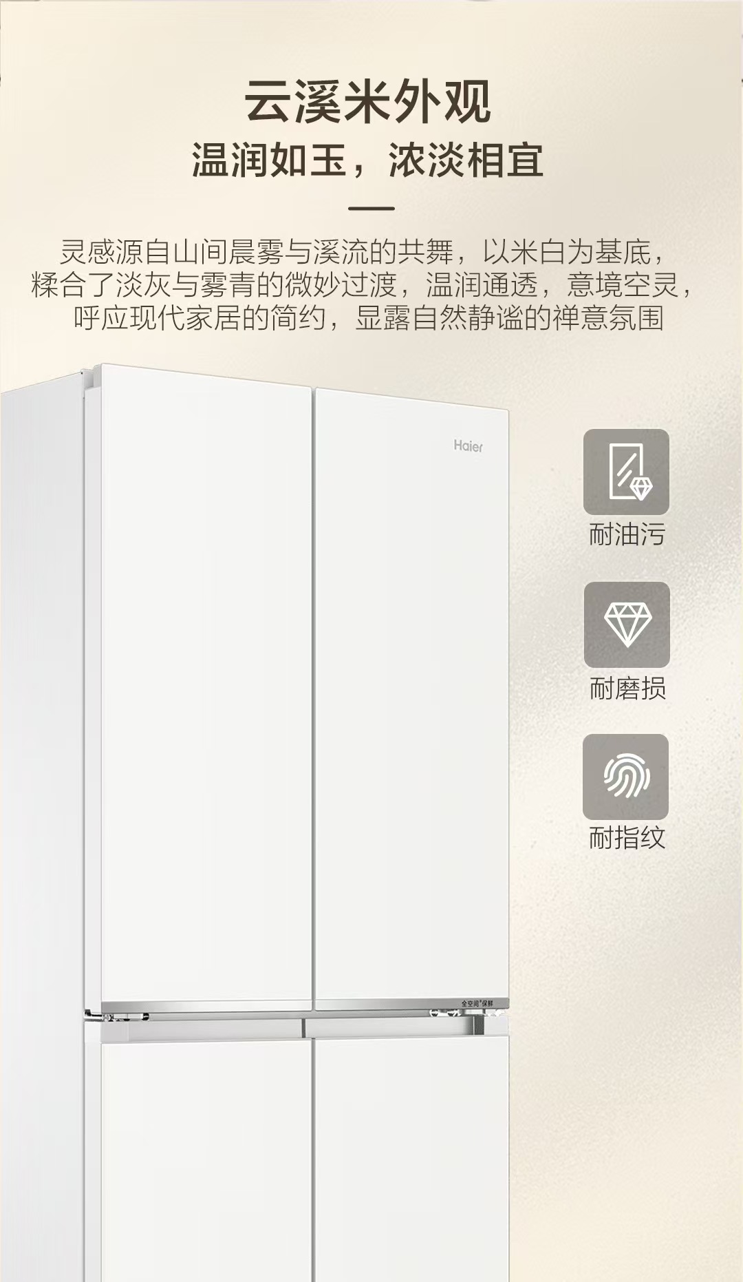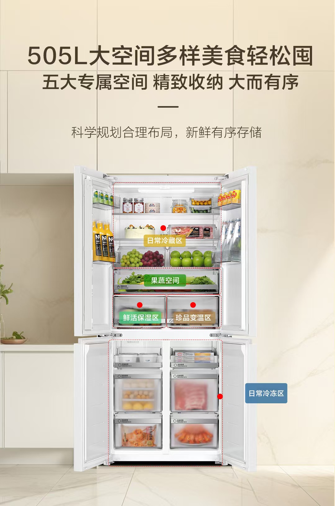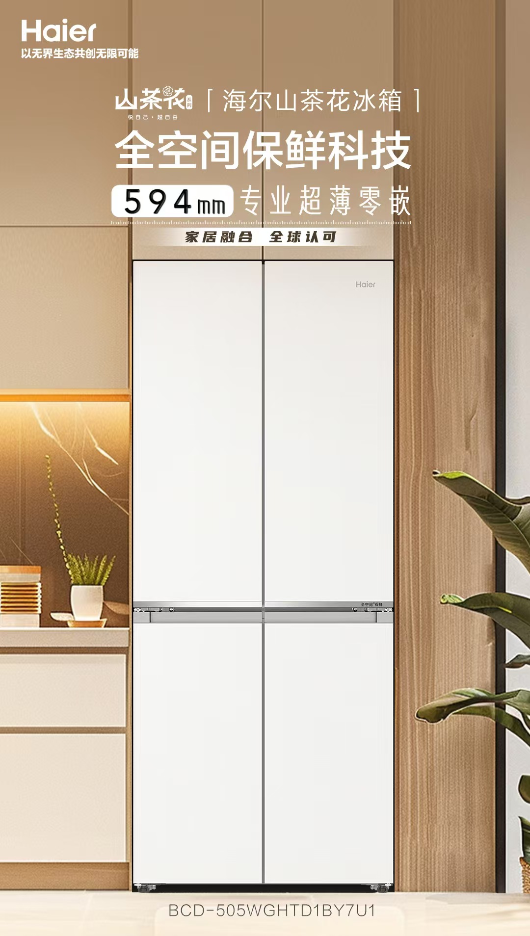 山茶花-海尔冰箱BCD-505WGHTD1BY7U1 全空间保鲜科技 594mm专业超薄零嵌 阻氧干湿储 EPP超净系统