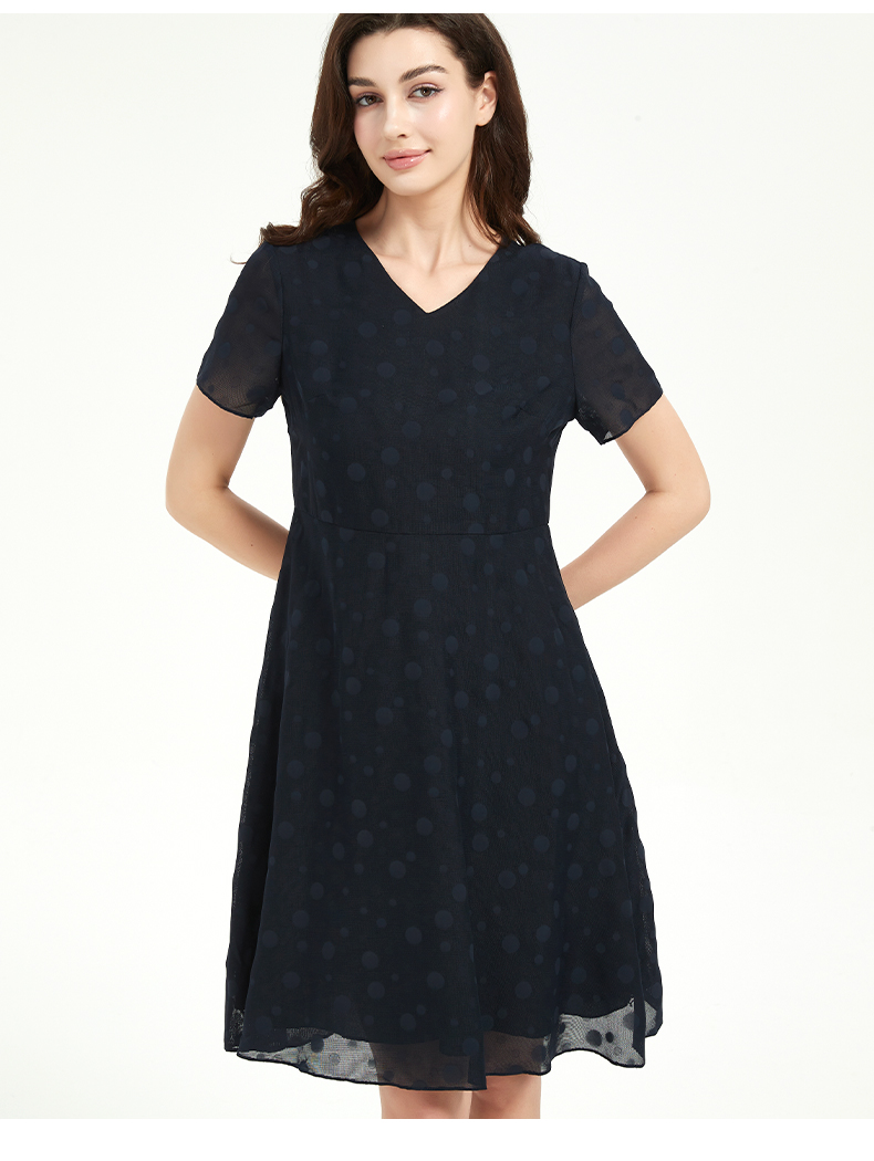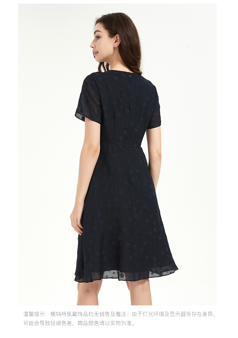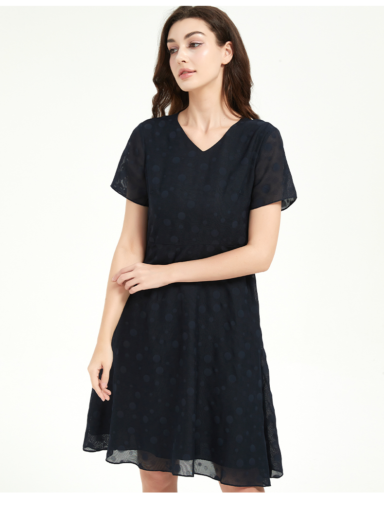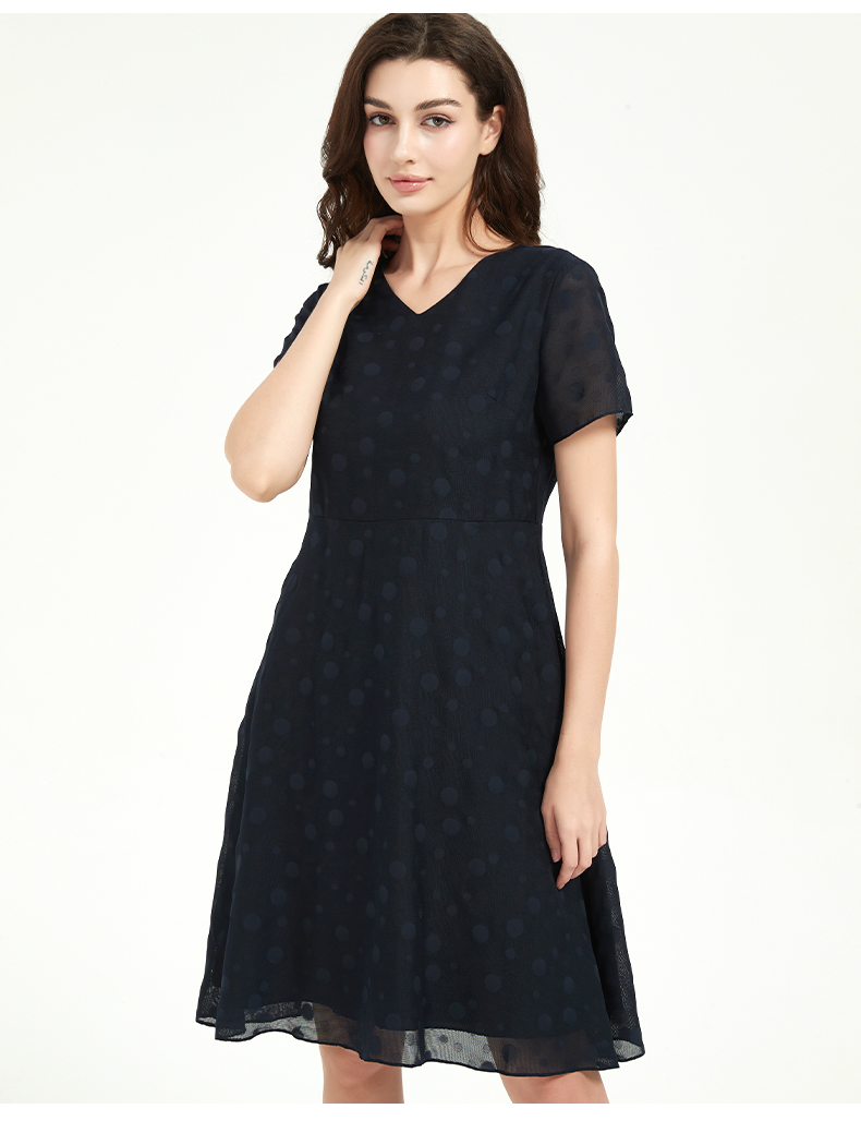 皮尔卡丹女法式V领通勤收腰短袖连衣裙